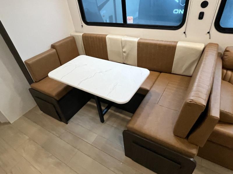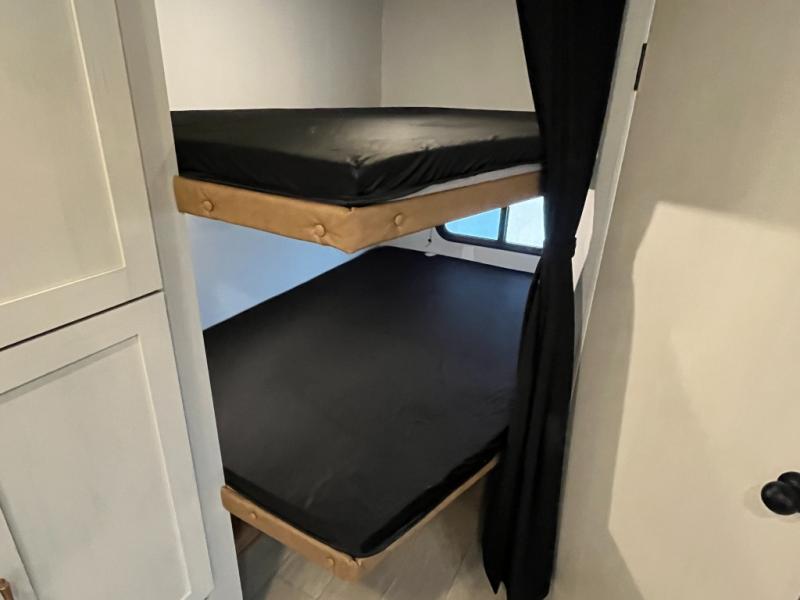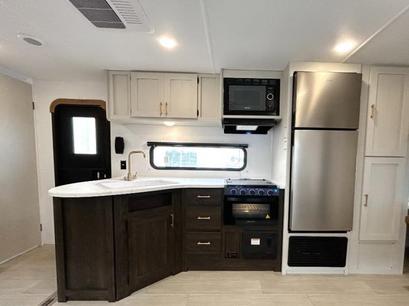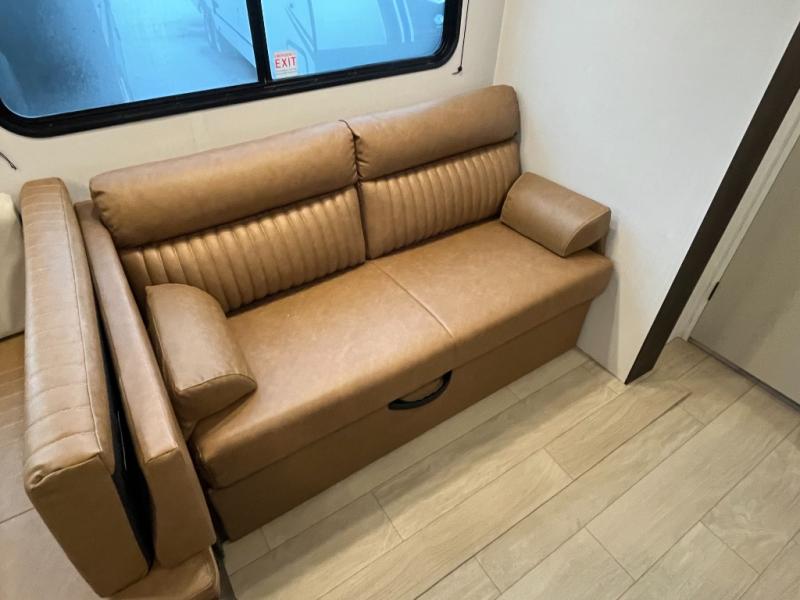 If you've been searching for a travel trailer that can sleep more campers and give you more interior space, this is the one! There are double-size bunks with a ladder for the little ones, an RV queen bed in the front bedroom, plus a jackknife sofa and booth dinette that will double as seating and sleeping space. You will be able to make home cooked meals for your crew since there is a three burner range with a glass top and LED lit knobs, and the 10 cu. ft. 12V refrigerator can keep your food fresh. This model also includes a full bath with a 30" x 36" shower, a foot flush toilet, and a medicine cabinet to keep items organized.