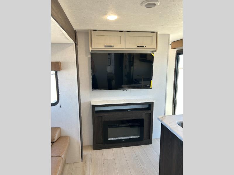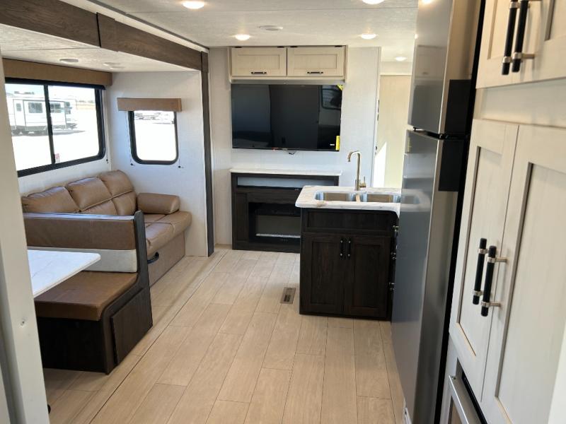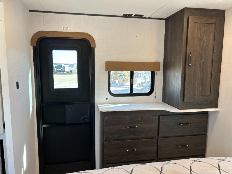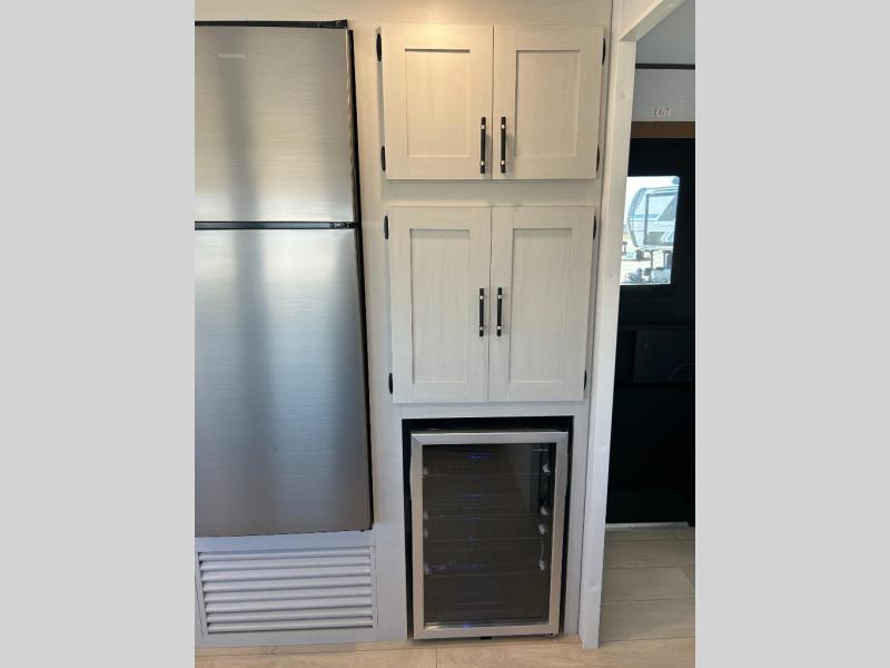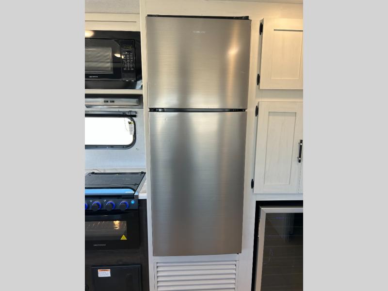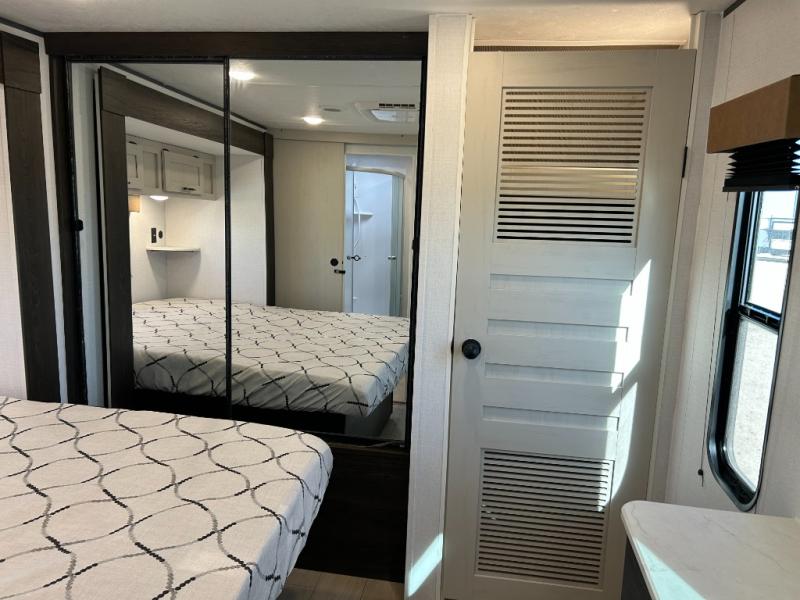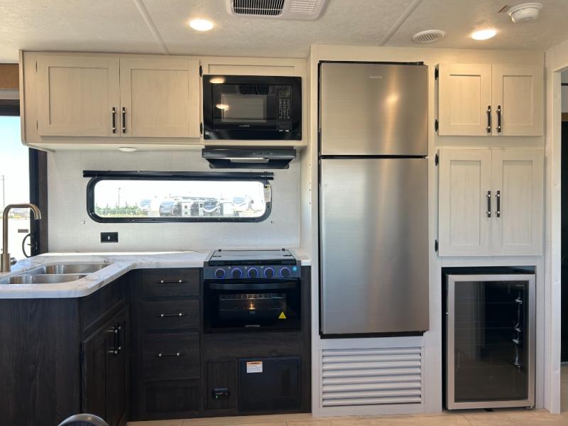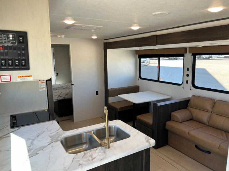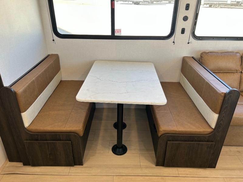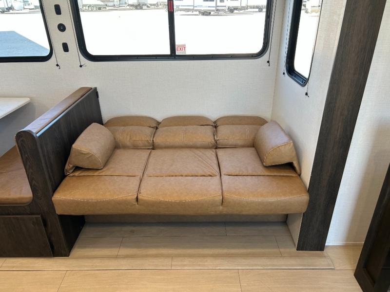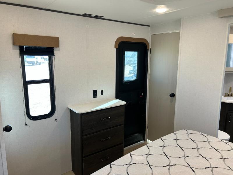 Pack your bags and invite your friends to tag along in this travel trailer! The master suite has a 60" x 74" queen bed slide across from a dresser next to a wardrobe and it's own rear full bathroom with a 30" x 36" shower. The front private bedroom has a king bed slide across from a dresser and a front wardrobe next to an area prepped to add an optional washer and dryer, plus an entrance into the dual entry bathroom which has a 34" radius shower. Both bedrooms have an entrance/exit door to the unit and the 60" x 72" patio door leads directly into the kitchen/living area. The chef can prepare delicious meals with the three burner cooktop then you can enjoy them at the 38" booth dinette next to a 60" jackknife sofa for a relaxing evening by the 50" TV at the entertainment center. You even have an outside mini fridge to enjoy a cold beverage while playing a game of cornhole!