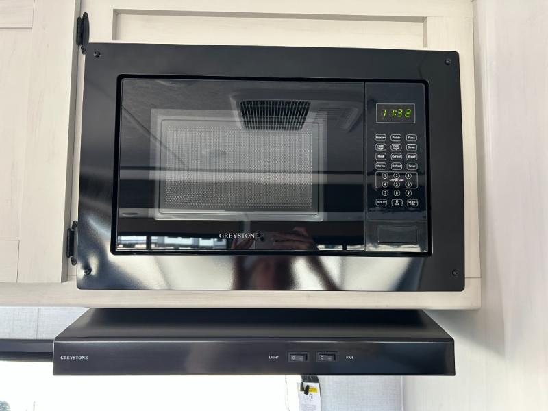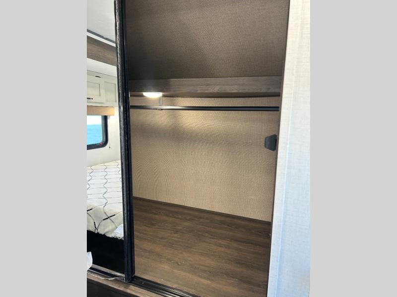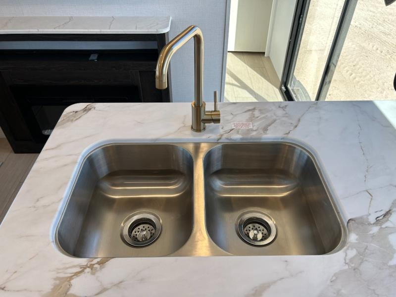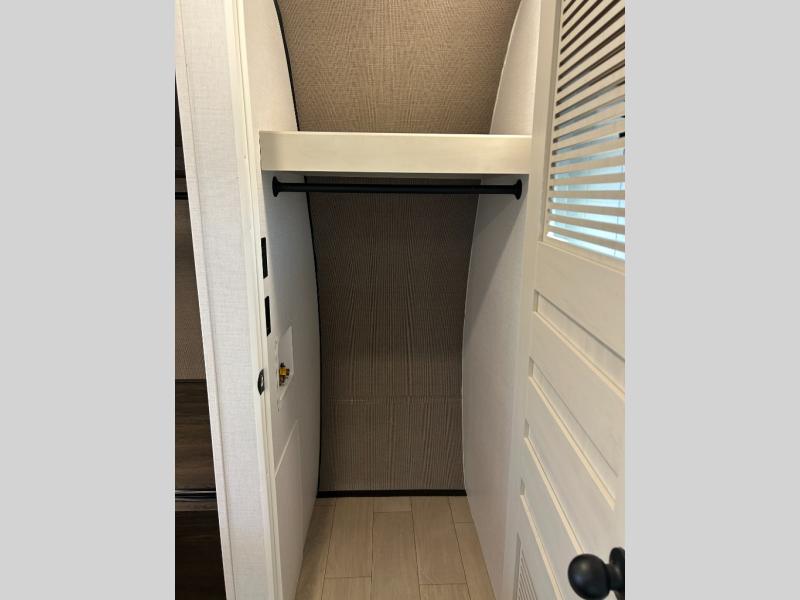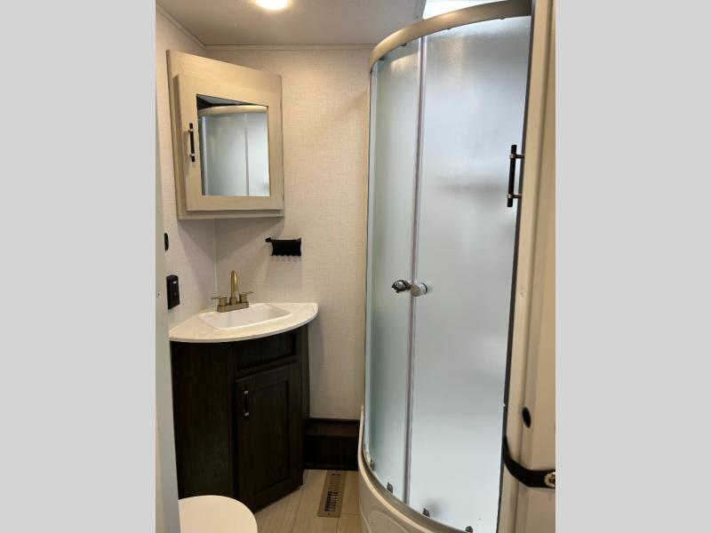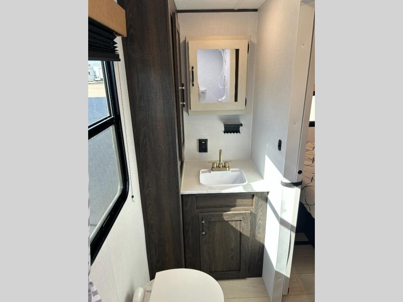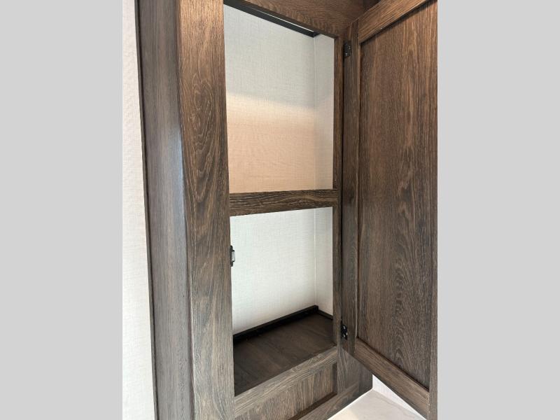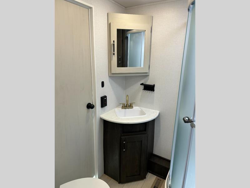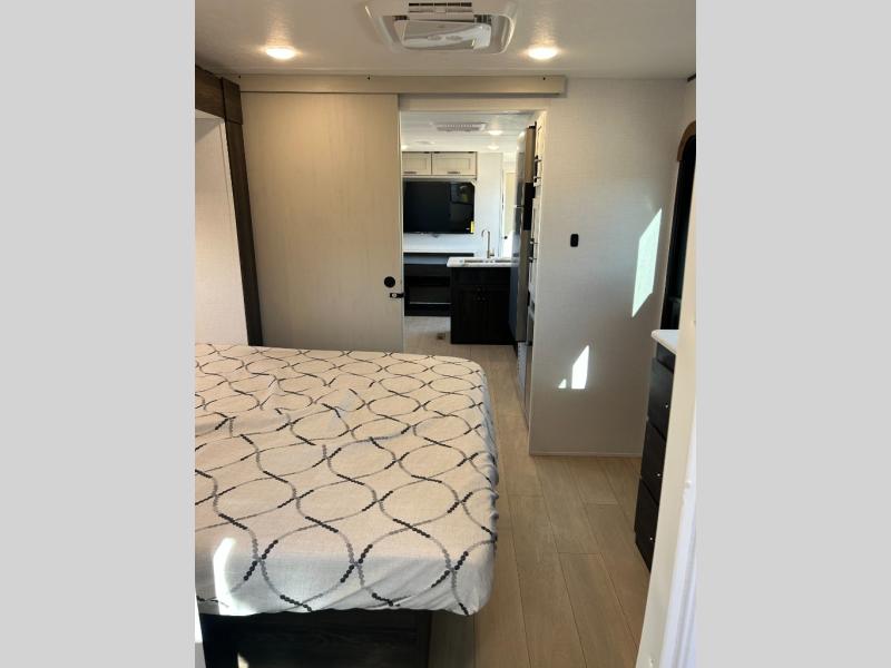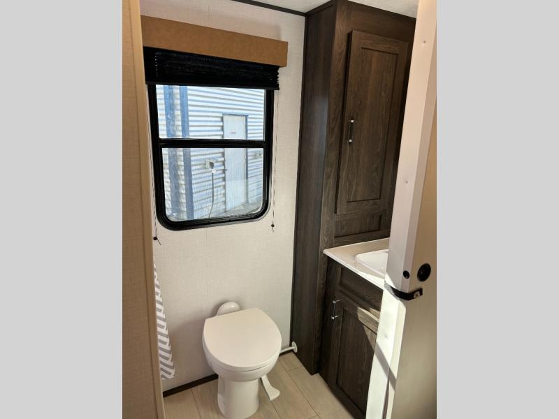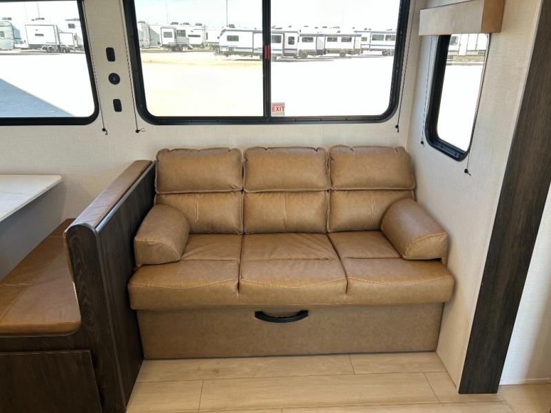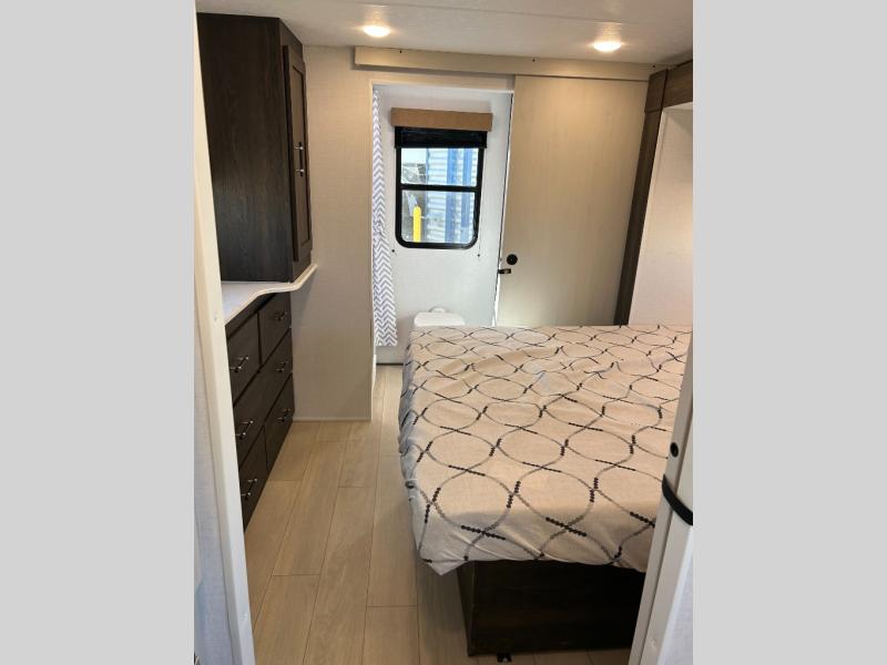 Pack your bags and invite your friends to tag along in this travel trailer! The master suite has a 60" x 74" queen bed slide across from a dresser next to a wardrobe and it's own rear full bathroom with a 30" x 36" shower. The front private bedroom has a king bed slide across from a dresser and a front wardrobe next to an area prepped to add an optional washer and dryer, plus an entrance into the dual entry bathroom which has a 34" radius shower. Both bedrooms have an entrance/exit door to the unit and the 60" x 72" patio door leads directly into the kitchen/living area. The chef can prepare delicious meals with the three burner cooktop then you can enjoy them at the 38" booth dinette next to a 60" jackknife sofa for a relaxing evening by the 50" TV at the entertainment center. You even have an outside mini fridge to enjoy a cold beverage while playing a game of cornhole!