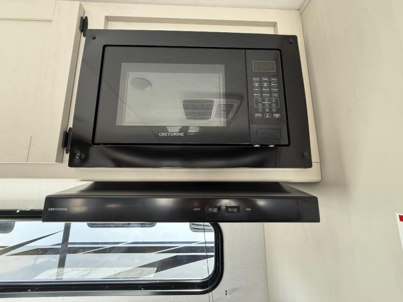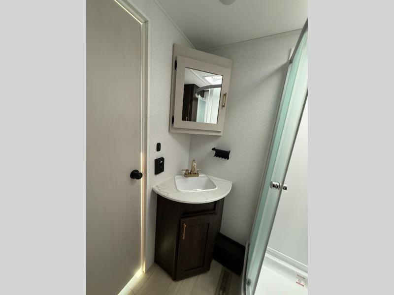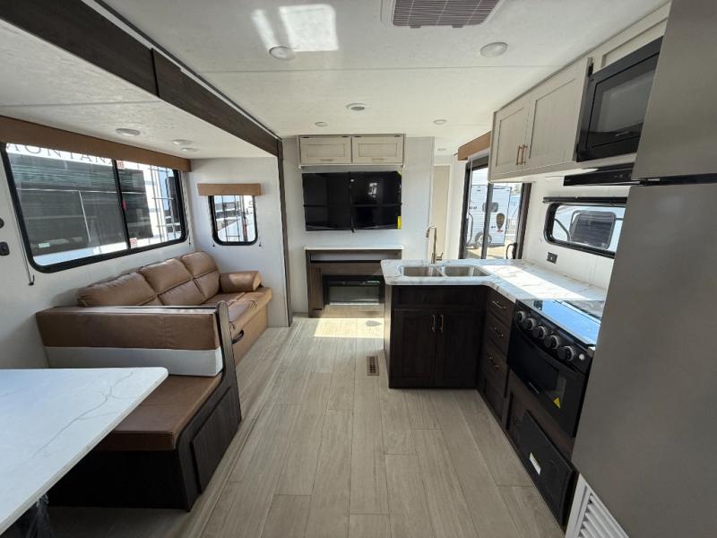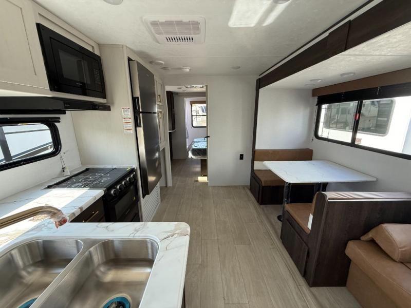 Pack your bags and invite your friends to tag along in this travel trailer! The master suite has a 60" x 74" queen bed slide across from a dresser next to a wardrobe and it's own rear full bathroom with a 30" x 36" shower. The front private bedroom has a king bed slide across from a dresser and a front wardrobe next to an area prepped to add an optional washer and dryer, plus an entrance into the dual entry bathroom which has a 34" radius shower. Both bedrooms have an entrance/exit door to the unit and the 60" x 72" patio door leads directly into the kitchen/living area. The chef can prepare delicious meals with the three burner cooktop then you can enjoy them at the 38" booth dinette next to a 60" jackknife sofa for a relaxing evening by the 50" TV at the entertainment center. You even have an outside mini fridge to enjoy a cold beverage while playing a game of cornhole!