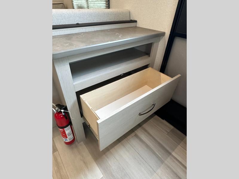 Rear Kitchen Layout: The “RKS” suggests Rear Kitchen with Storage / Slide-out. It gives more counter space & working room in the kitchen area.