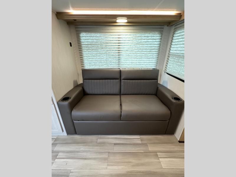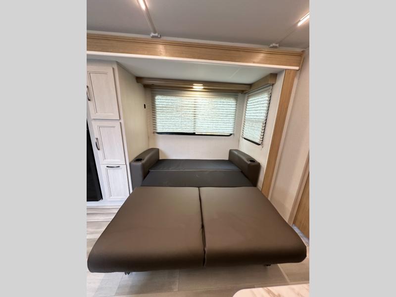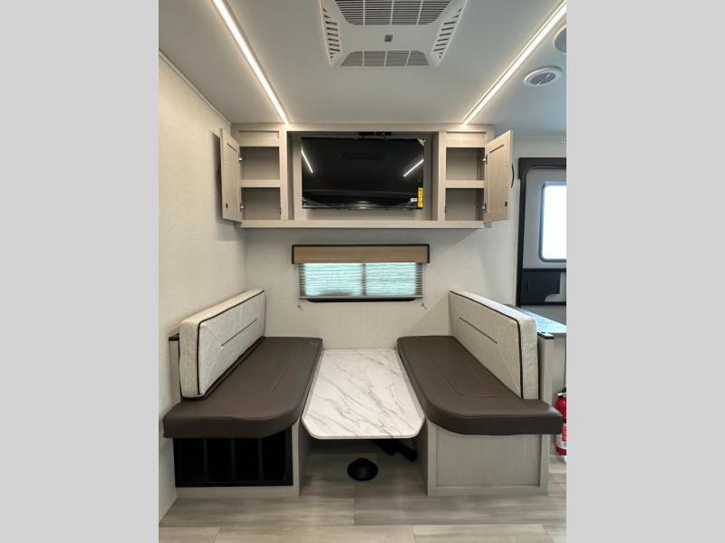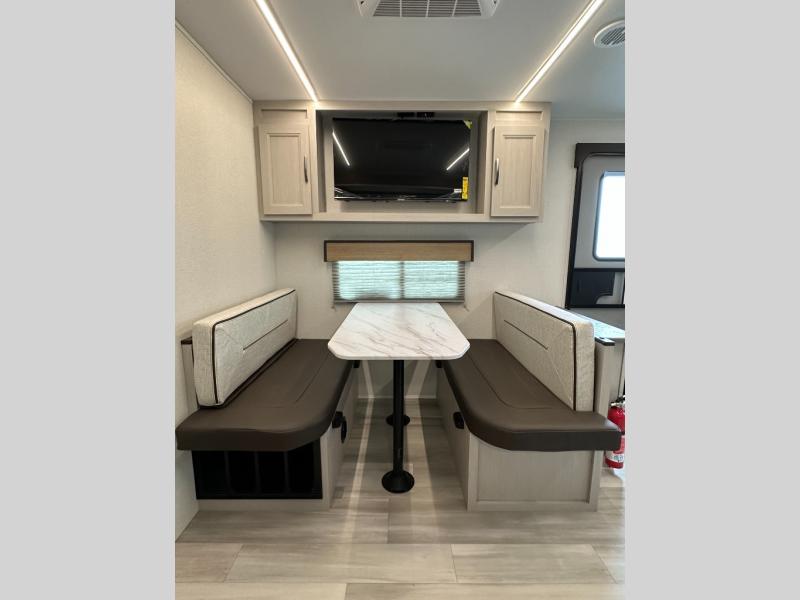 Booth Dinette + Tri-Fold Sofa: Gives seating, dining, and extra sleeping capacity options.