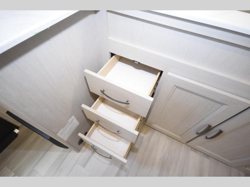 Step inside to find premium finishes, including solid surface countertops, full-extension drawers, and hidden cabinet door hinges—all combining rustic charm with modern flair.
