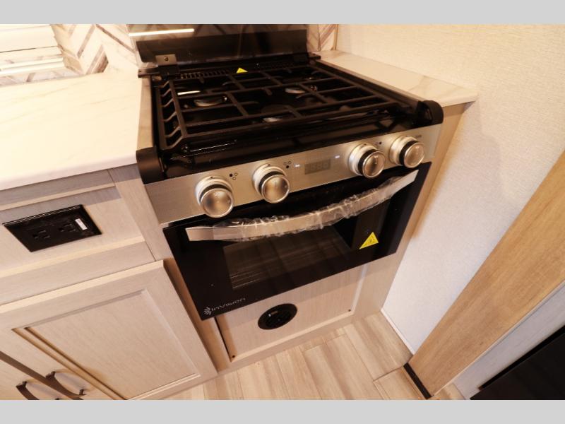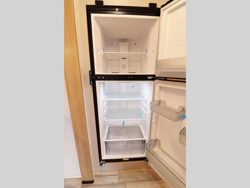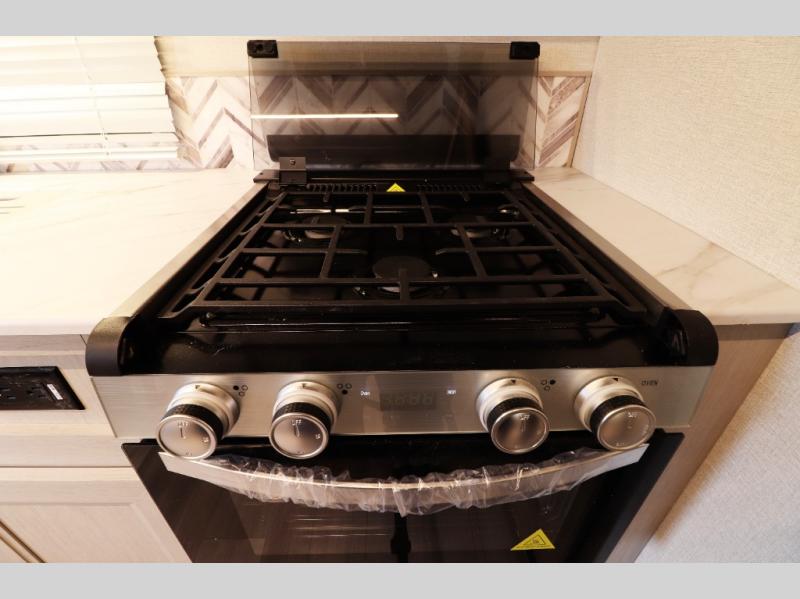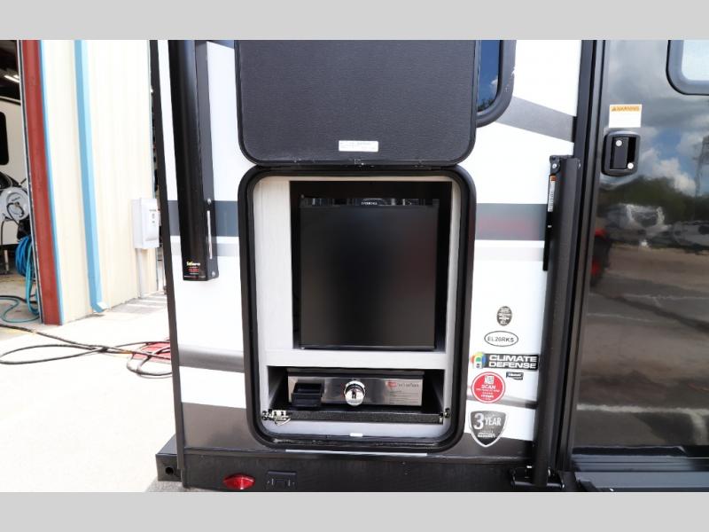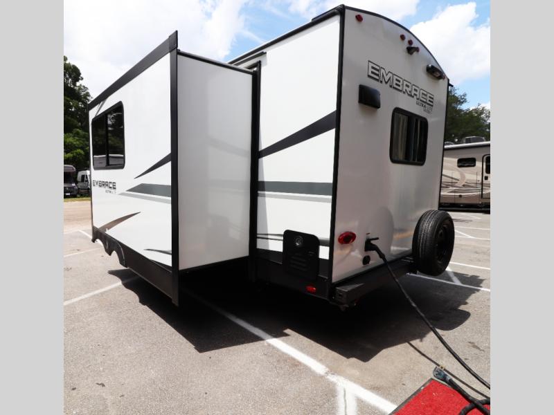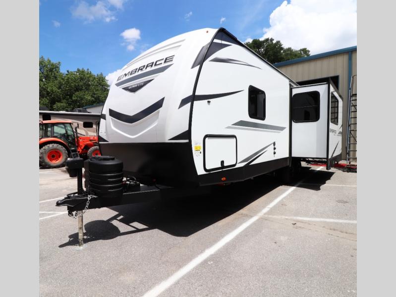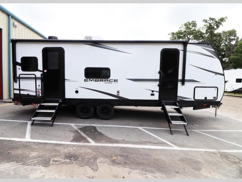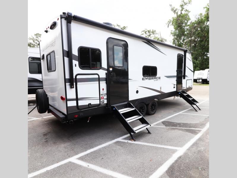 The 2026 Embrace EL26RKS exudes bold, modern styling with a high-gloss fiberglass exterior, premium graphics, and frameless tinted safety glass windows that combine aesthetics with functionality. The painted front cap with LED accent lights enhances its aggressive, upscale look. Solid Step entry stairs and an extra-wide entry door with friction hinge make entry safe and smooth. Plus, the patio-ready power awning with integrated LED lights invites you to relax and entertain outside anytime.