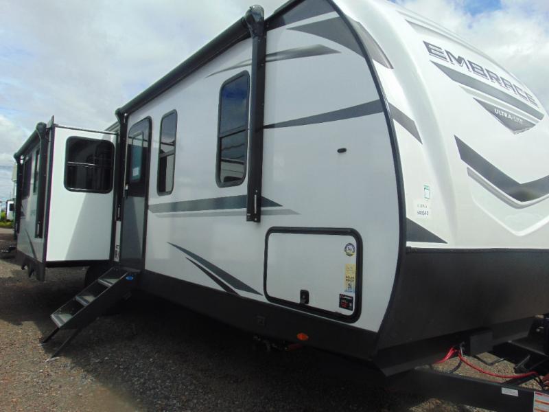 With any Embrace travel trailer by Cruiser you will find Azdel composite laminated walls, and a high gloss fiberglass front cap with LED lighting for a sleek look. There are seamless kitchen countertops and plywood flooring that will be easy to clean, plus residential hardwood cabinets with hidden hinges for a more at-home feel. The slam latch baggage doors with magnetic latches will make loading up easier than ever, plus the pass-through storage includes LED lights you are sure to appreciate. Each model also includes multiple charging stations with 12v and USB ports, a four speaker soundbar system to listen to your playlists, and a dual ducted A/C to keep you cool during those hot summer months!