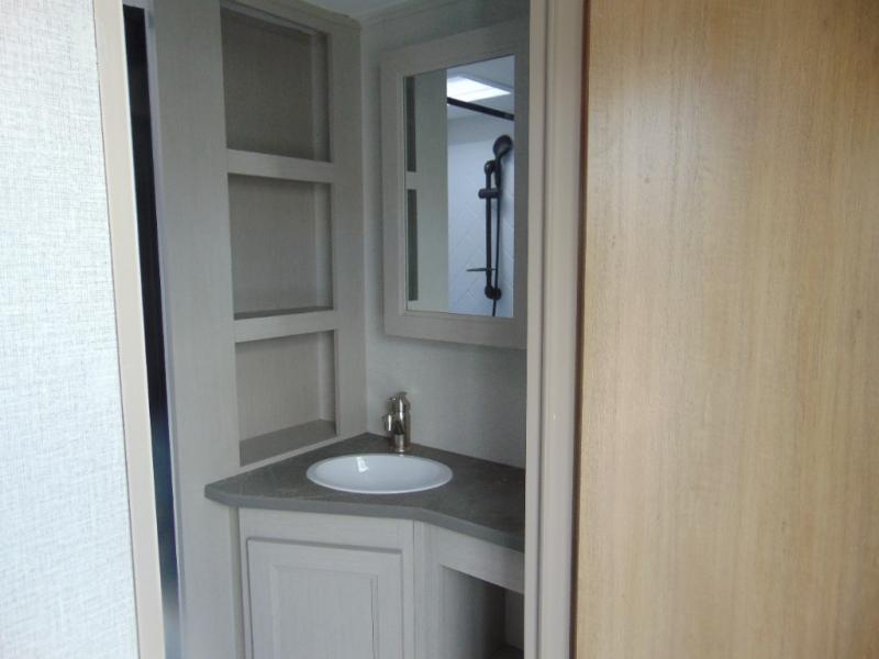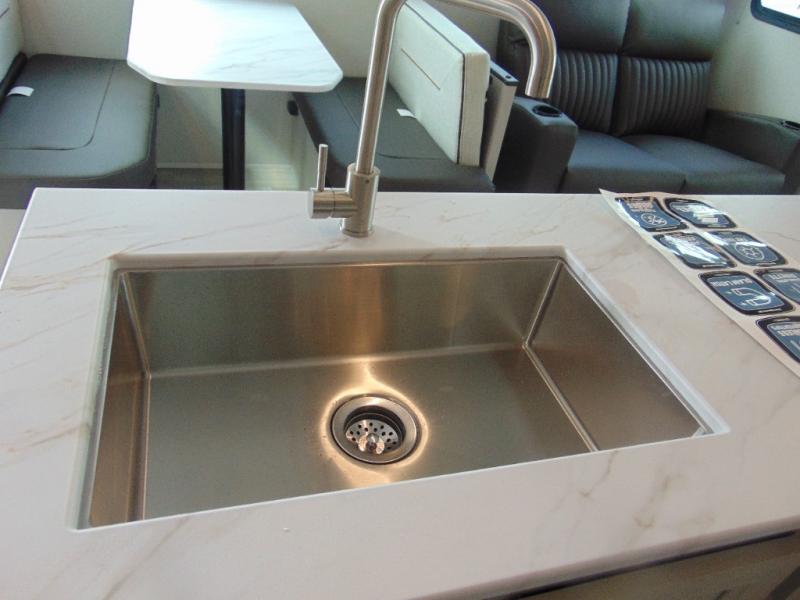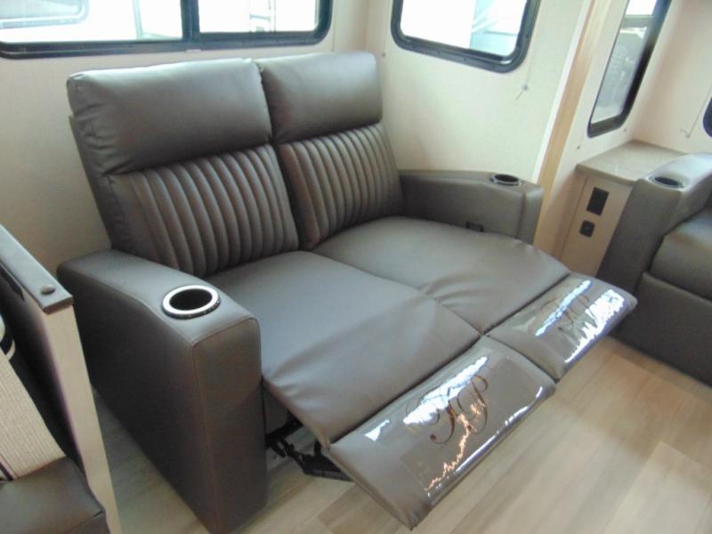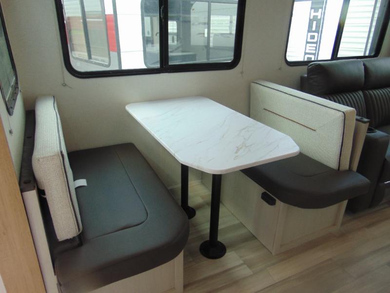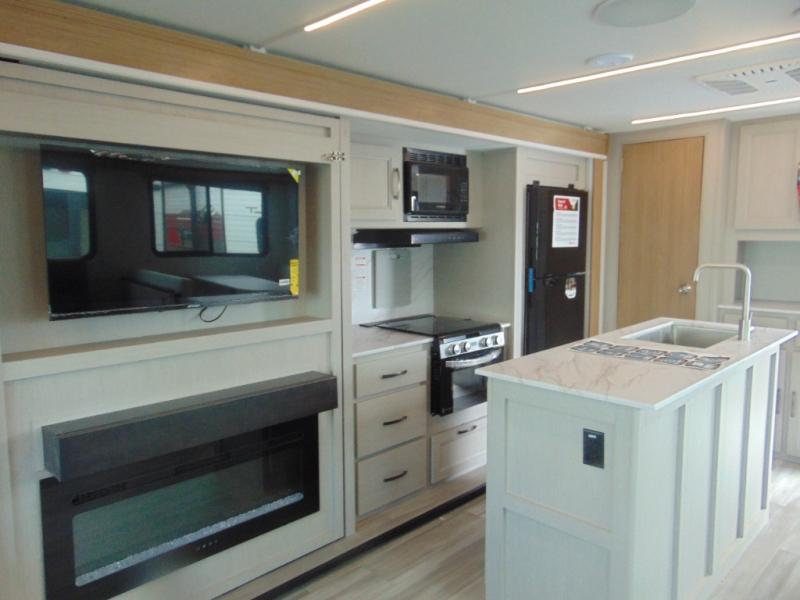 You'll love every minute spent in this spacious travel trailer that can sleep four to five each night. The rear living area will be a favorite place to visit together since there are dual opposing slides, a rear Trifold sofa, a booth dinette, plus a 60" theatre seat across from the entertainment center. A kitchen island in the middle will provide more counter space, and the large pantry can keep all the dry goods and snacks organized. After you've spent your day outdoors, the full bath with a spacious shower, plenty of counter space, and a linen closet will let you freshen up before turning in for the night. Speaking of nighttime, the front private bedroom will provide a great night's rest on the queen-size bed, and there is storage space in the dual wardrobes plus the dresser/wardrobe!
