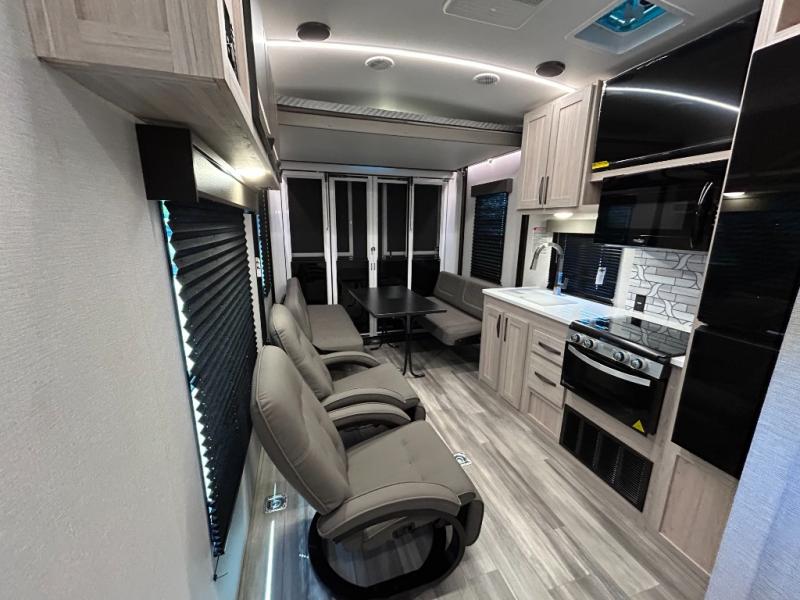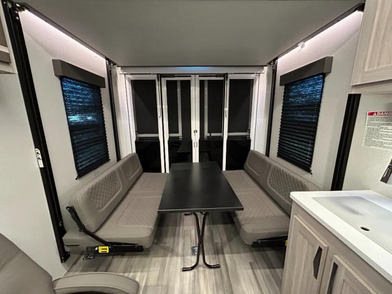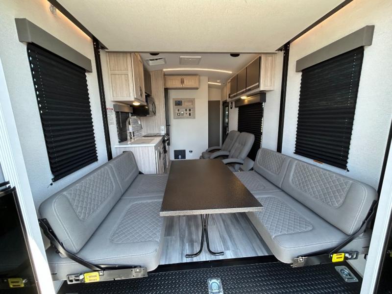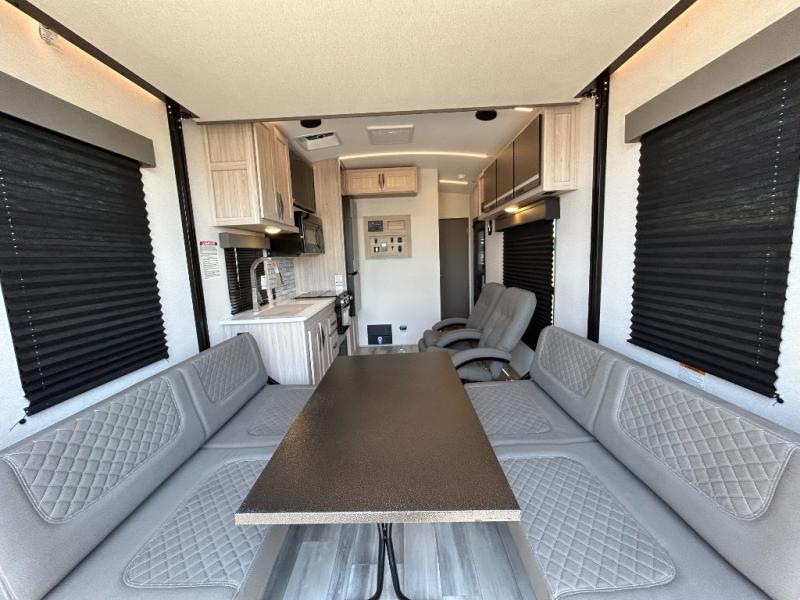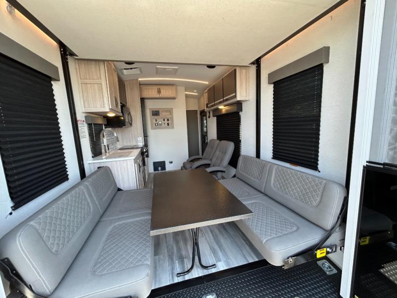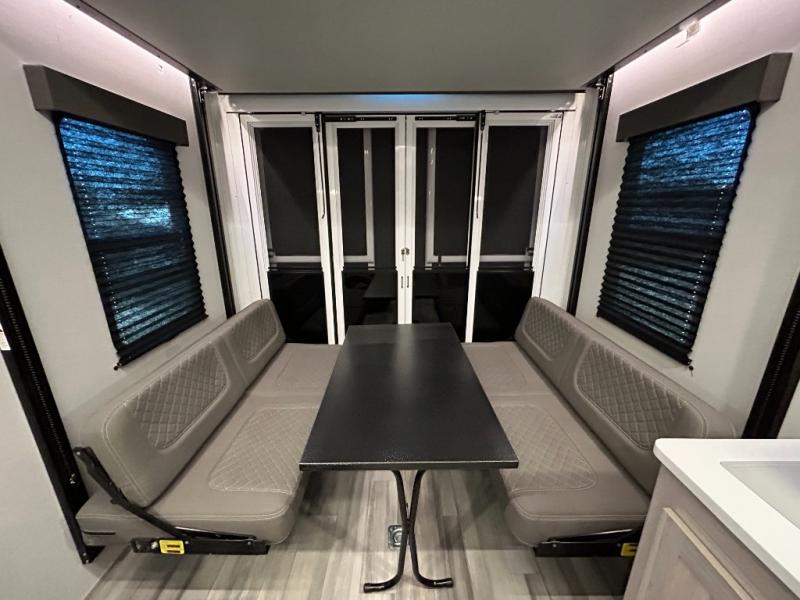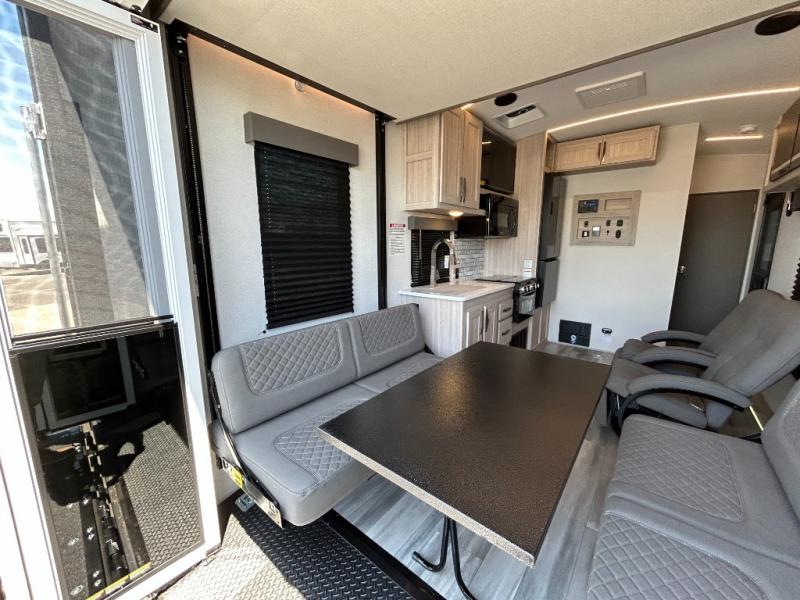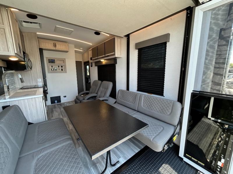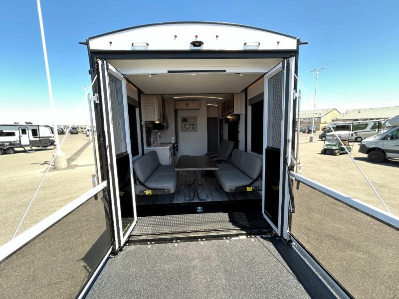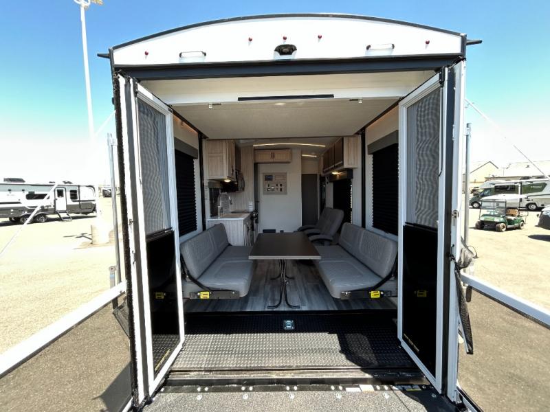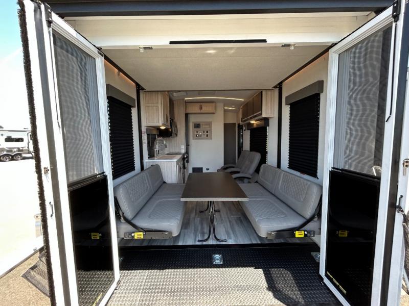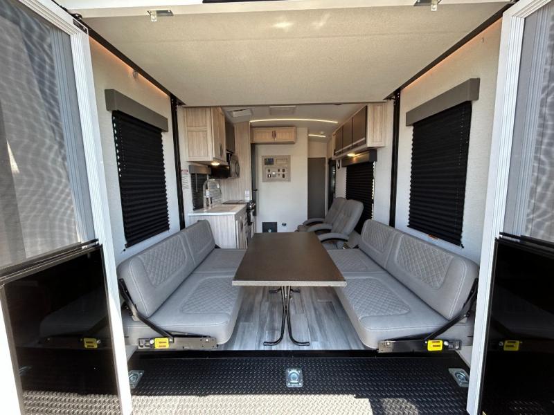 - Toy Hauler Enhancement Package: Seamless Edge Kitchen Countertops, Barreled Ceiling, LED Batton Strip Lighting WI Dimmer, Control Panel with Lighted Switches, Battery Disconnect Euro Recliner Chair(s) & Bay Window (Most Open Concept Models), Tinted Safety Glass Windows, High Rise Faucet and Medicine Cabinet in Bathroom, Designer Box Valances, Night Shades, Roll-Up Rear Screen,Window, 17’ Oven, 10.7 Cu Ft 12V Refrigerator, Indoor/Outdoor Table, Rear Ramp Patio with Folding Rails