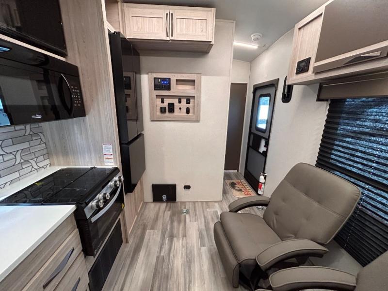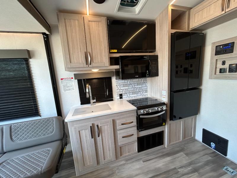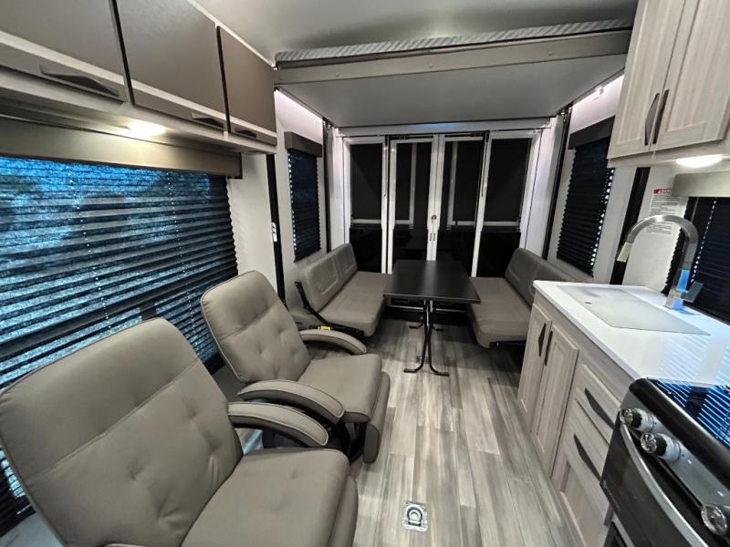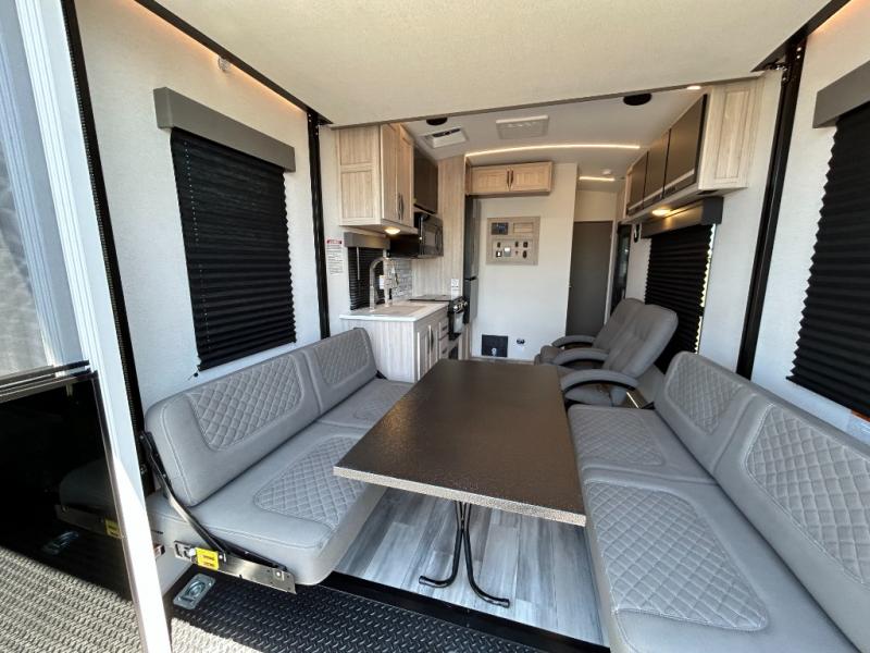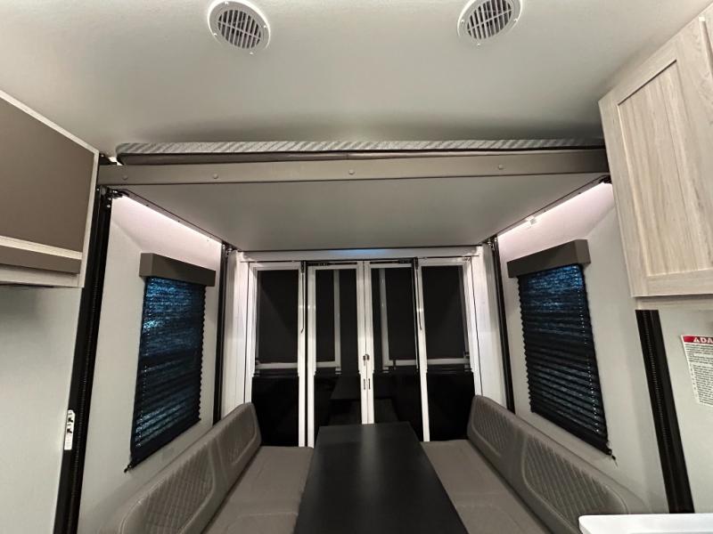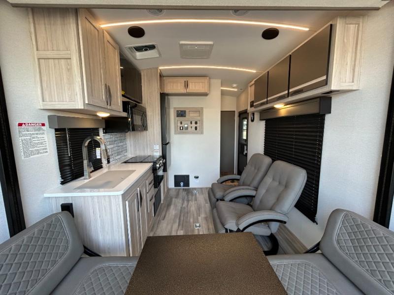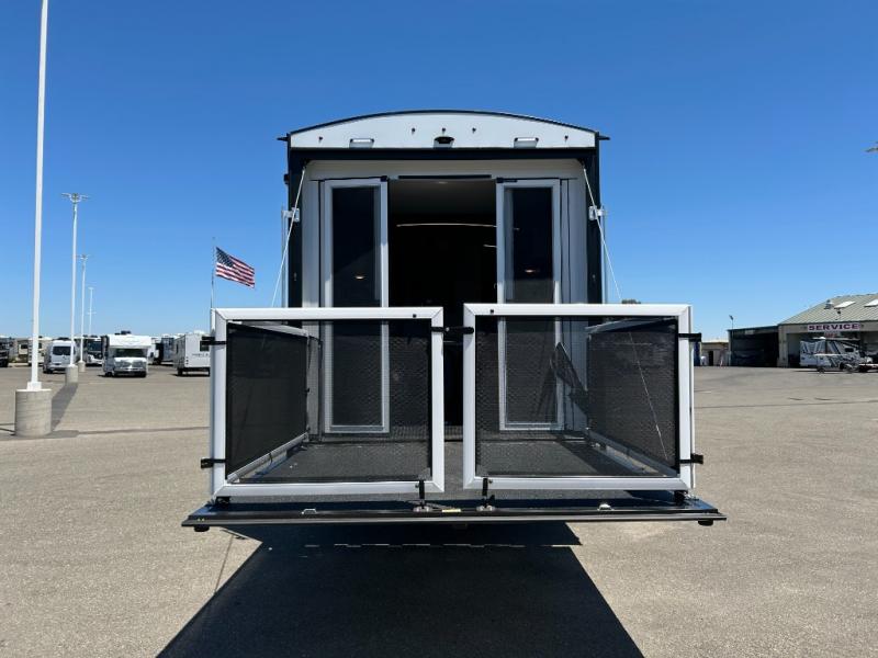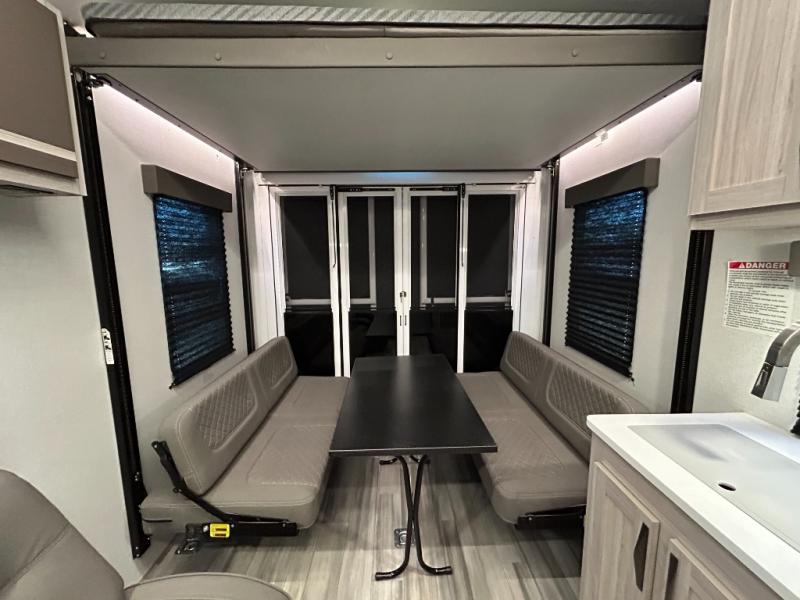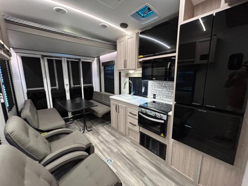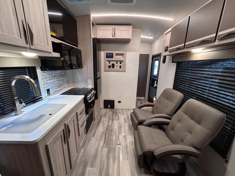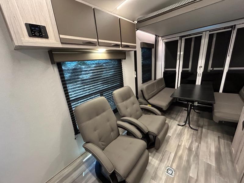 - Toy Hauler Enhancement Package: Seamless Edge Kitchen Countertops, Barreled Ceiling, LED Batton Strip Lighting WI Dimmer, Control Panel with Lighted Switches, Battery Disconnect Euro Recliner Chair(s) & Bay Window (Most Open Concept Models), Tinted Safety Glass Windows, High Rise Faucet and Medicine Cabinet in Bathroom, Designer Box Valances, Night Shades, Roll-Up Rear Screen,Window, 17’ Oven, 10.7 Cu Ft 12V Refrigerator, Indoor/Outdoor Table, Rear Ramp Patio with Folding Rails