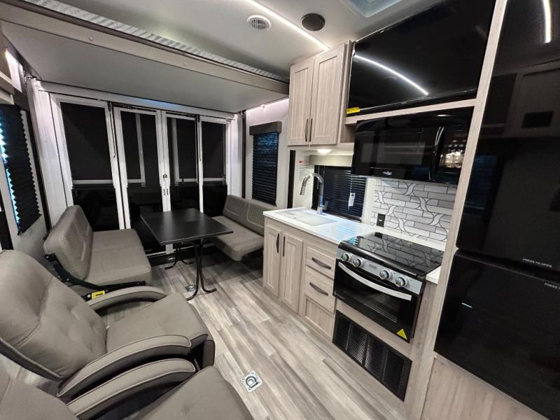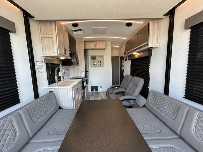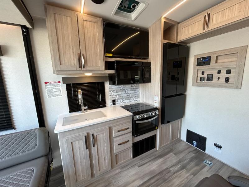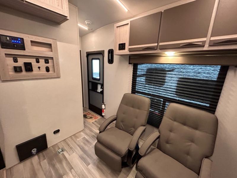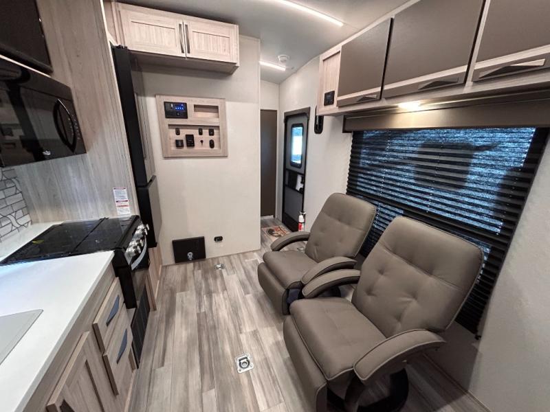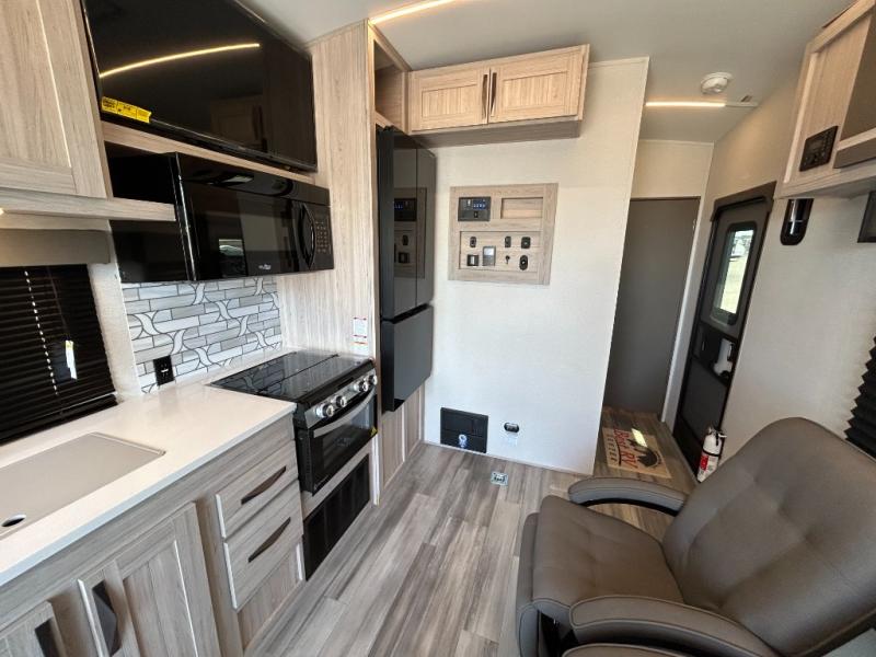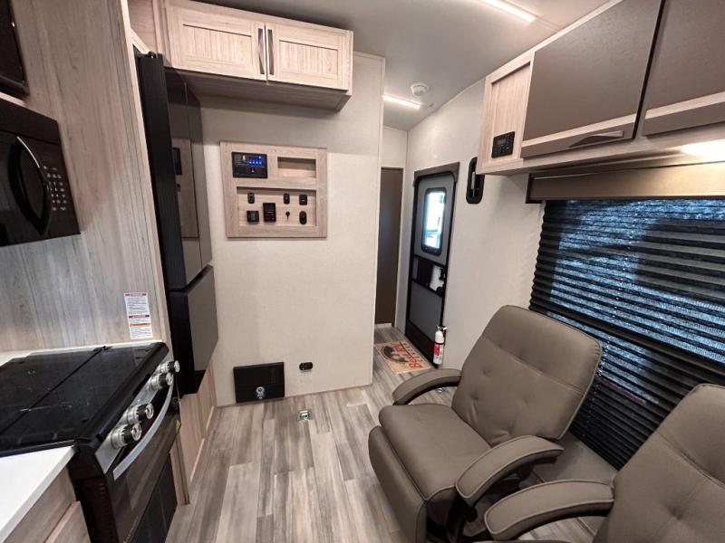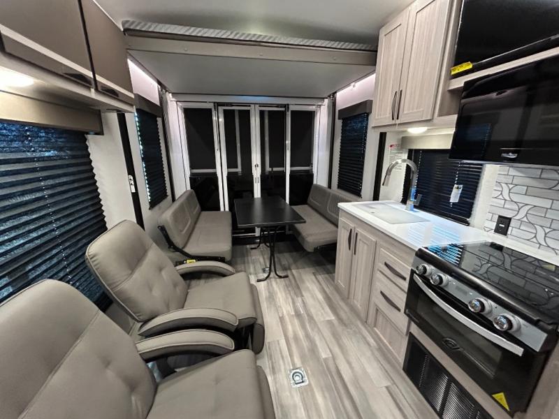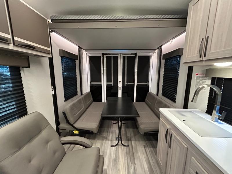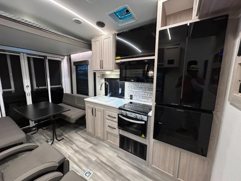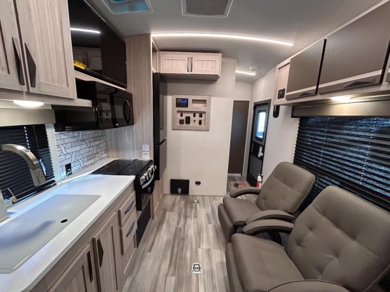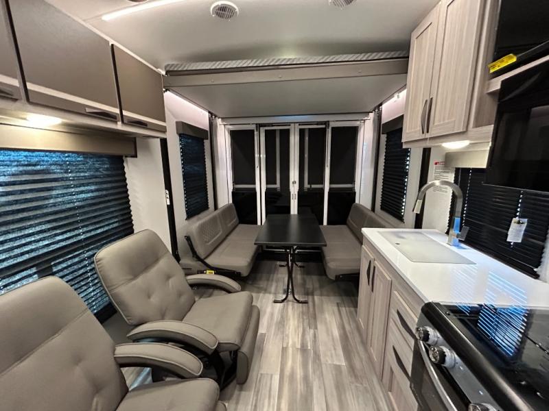 - Toy Hauler Enhancement Package: Seamless Edge Kitchen Countertops, Barreled Ceiling, LED Batton Strip Lighting WI Dimmer, Control Panel with Lighted Switches, Battery Disconnect Euro Recliner Chair(s) & Bay Window (Most Open Concept Models), Tinted Safety Glass Windows, High Rise Faucet and Medicine Cabinet in Bathroom, Designer Box Valances, Night Shades, Roll-Up Rear Screen,Window, 17’ Oven, 10.7 Cu Ft 12V Refrigerator, Indoor/Outdoor Table, Rear Ramp Patio with Folding Rails