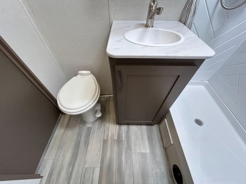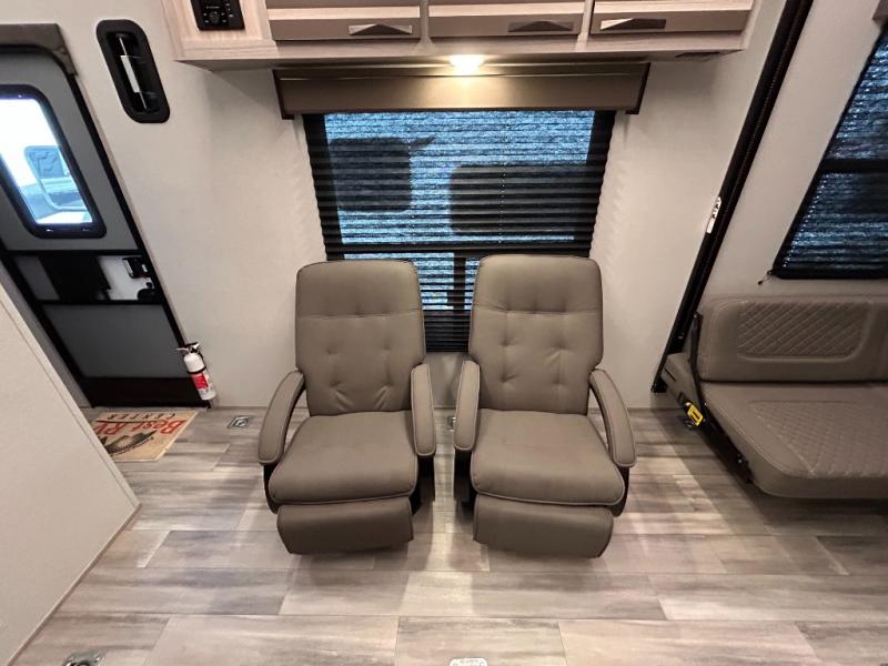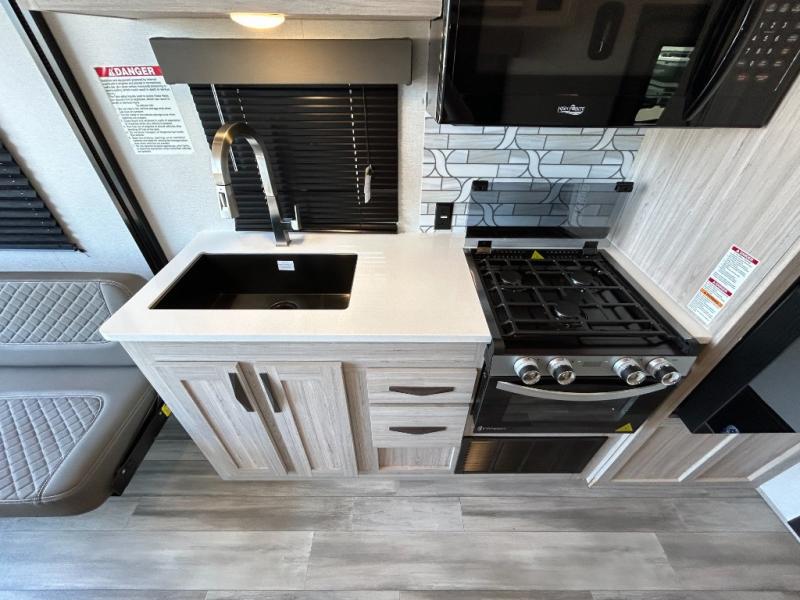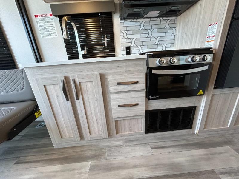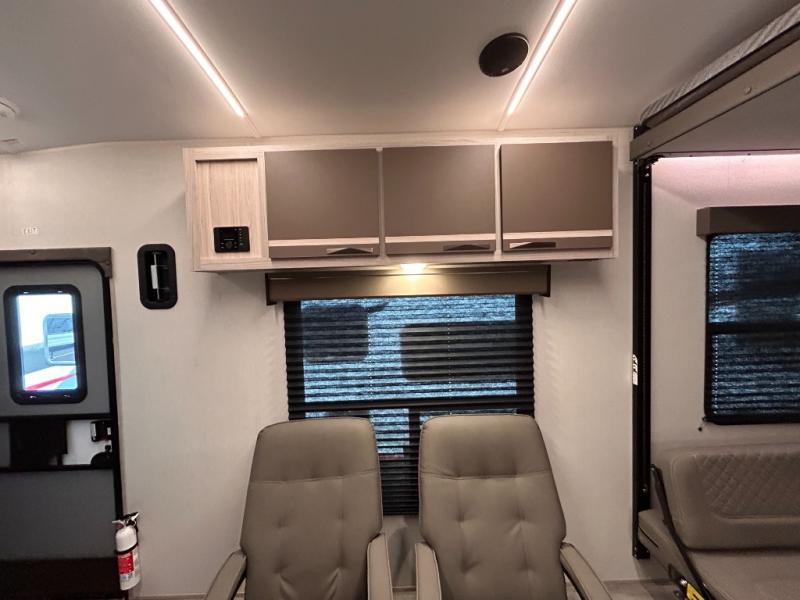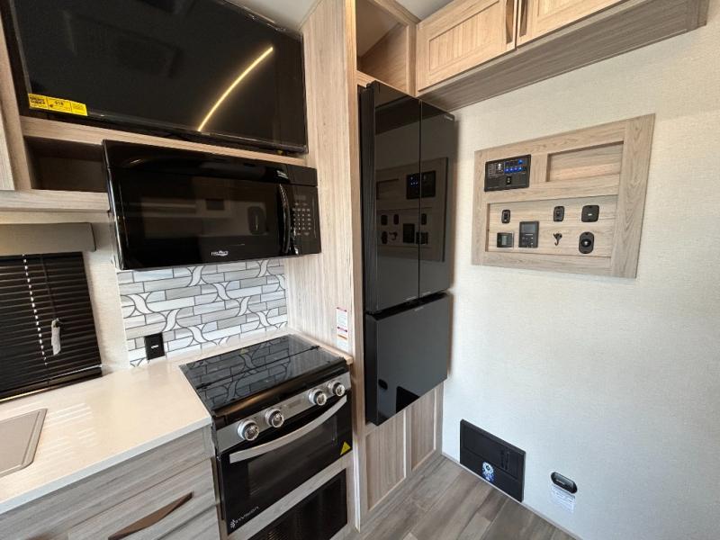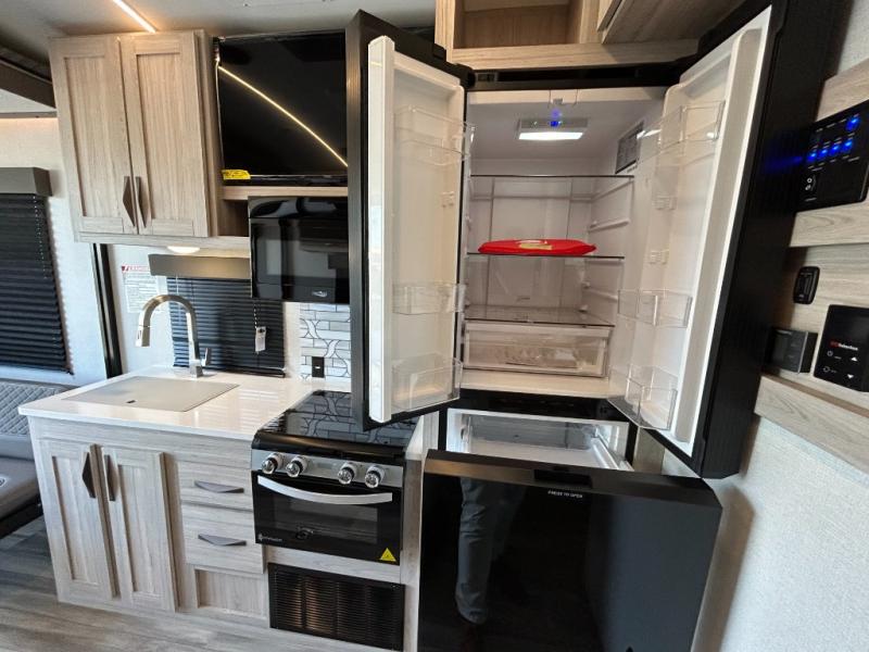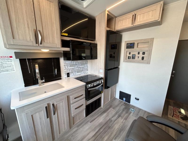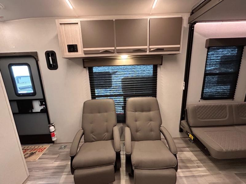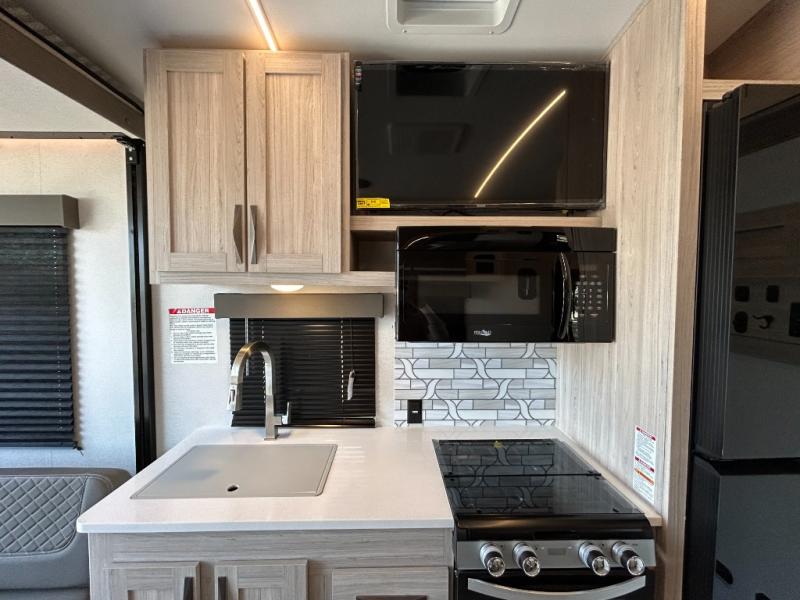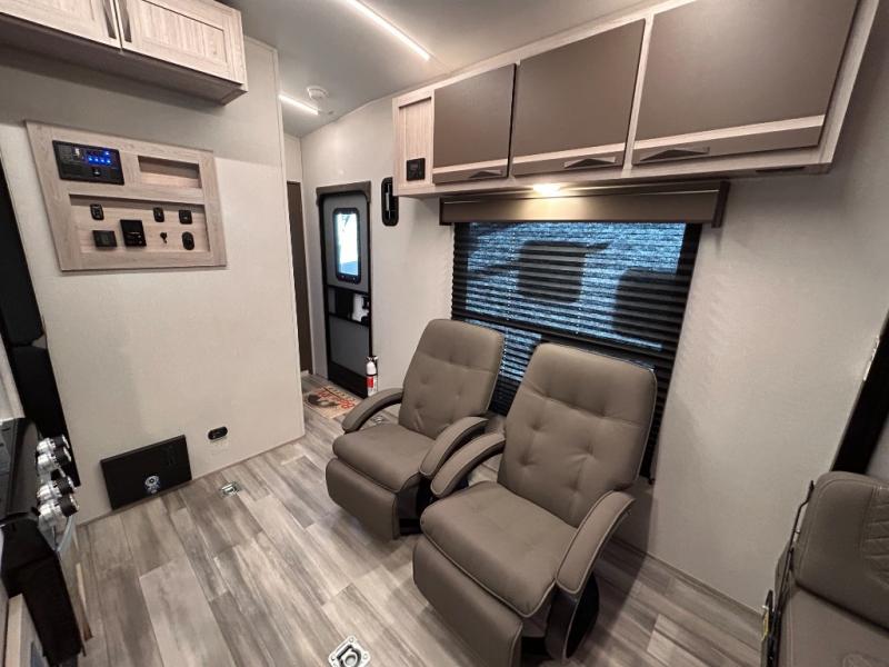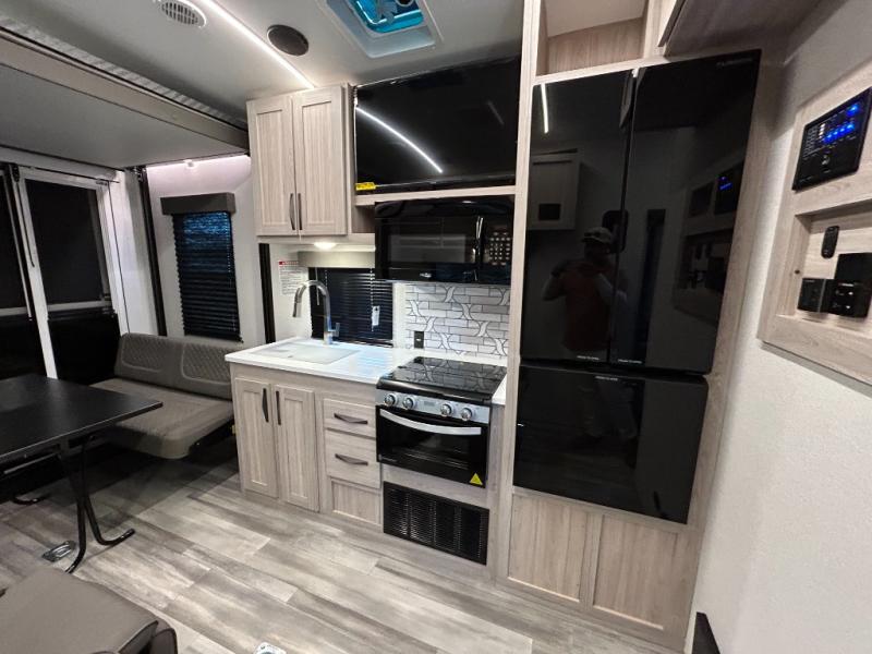 - Toy Hauler Enhancement Package: Seamless Edge Kitchen Countertops, Barreled Ceiling, LED Batton Strip Lighting WI Dimmer, Control Panel with Lighted Switches, Battery Disconnect Euro Recliner Chair(s) & Bay Window (Most Open Concept Models), Tinted Safety Glass Windows, High Rise Faucet and Medicine Cabinet in Bathroom, Designer Box Valances, Night Shades, Roll-Up Rear Screen,Window, 17’ Oven, 10.7 Cu Ft 12V Refrigerator, Indoor/Outdoor Table, Rear Ramp Patio with Folding Rails