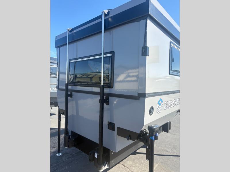 The Cube Series truck camper has an innovative "folding wall" design that can be used even with some subcompact pickup trucks. This smaller footprint allows the camper to fit in most garages in its collapsed form, yet still allows for plenty of great features for camping. The opposing dinette converts to a 75" sleeper bed. You'll also appreciate being able to cook on the two-burner stove with sink combo. Conveniences like the outside shower and optional Thetford electric flushing cassette toilet make your life easier. Setup is easy with the manual camper jacks with removable jack mount system, plus the system of camper tie downs for in truck bed connection.