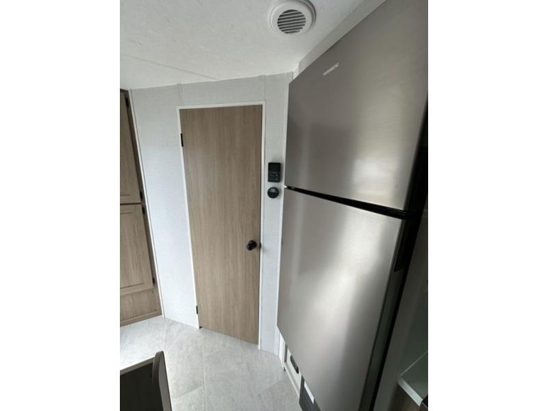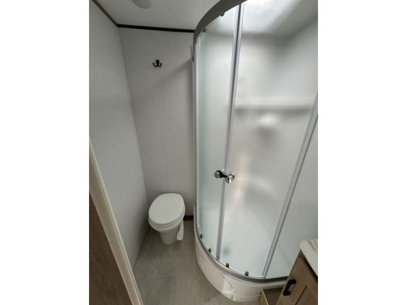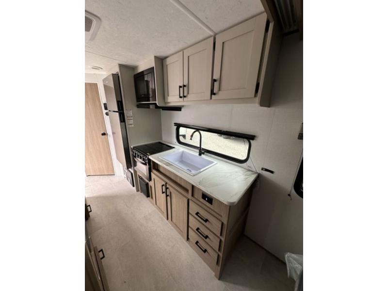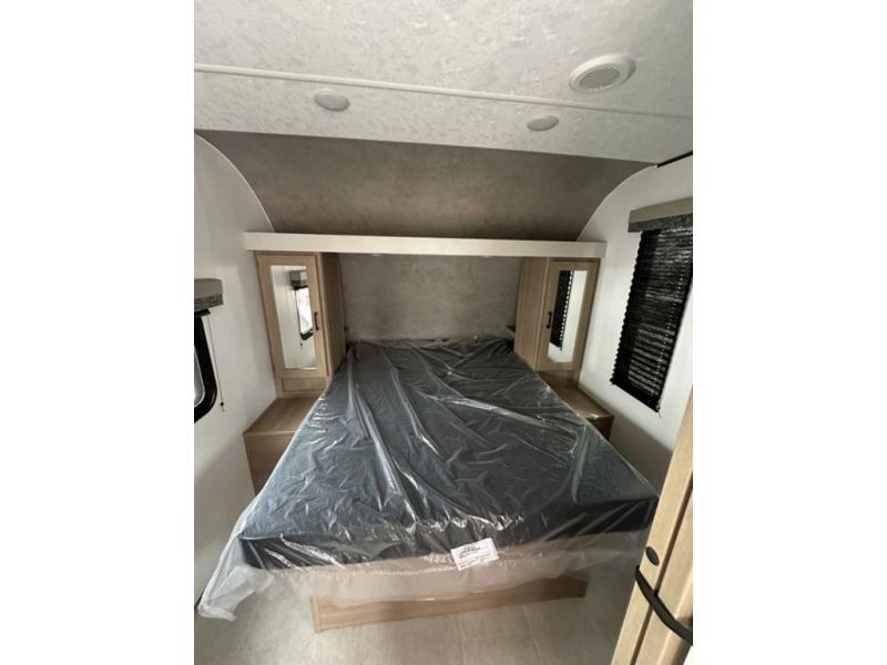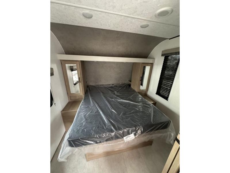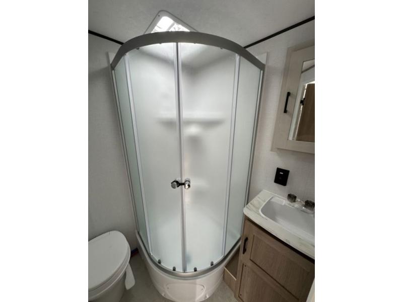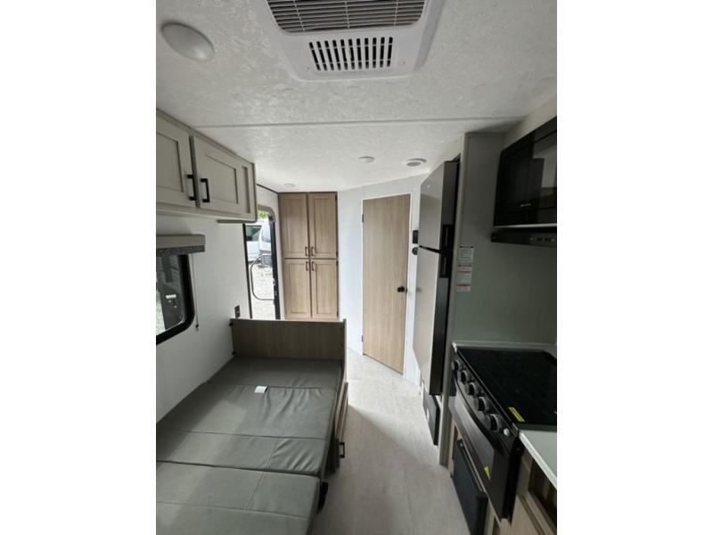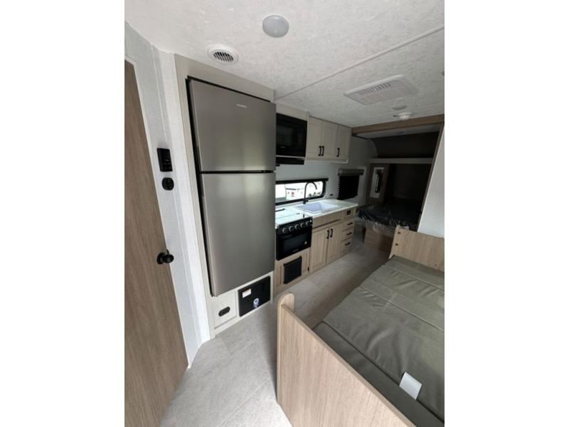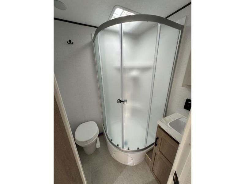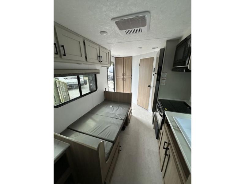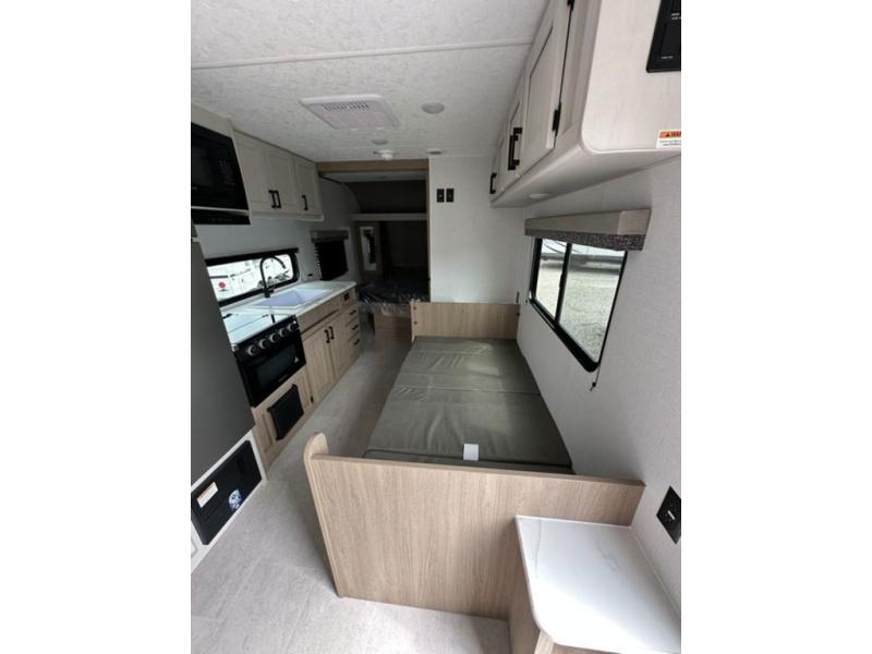 Whatever reason you camp, this lightweight trailer allows you to easily tow to your campsite, and enjoy comforts of home such as your own residential queen bed, wardrobe storage, and a full bathroom with a shower. The booth dinette provides both seating space and sleeping space for a guest. The cook will have an oven and a microwave to make meals, and a 10 cu. ft. 12V refrigerator for cold items, plus a galley sink with high rise faucet to keep the dishes clean.