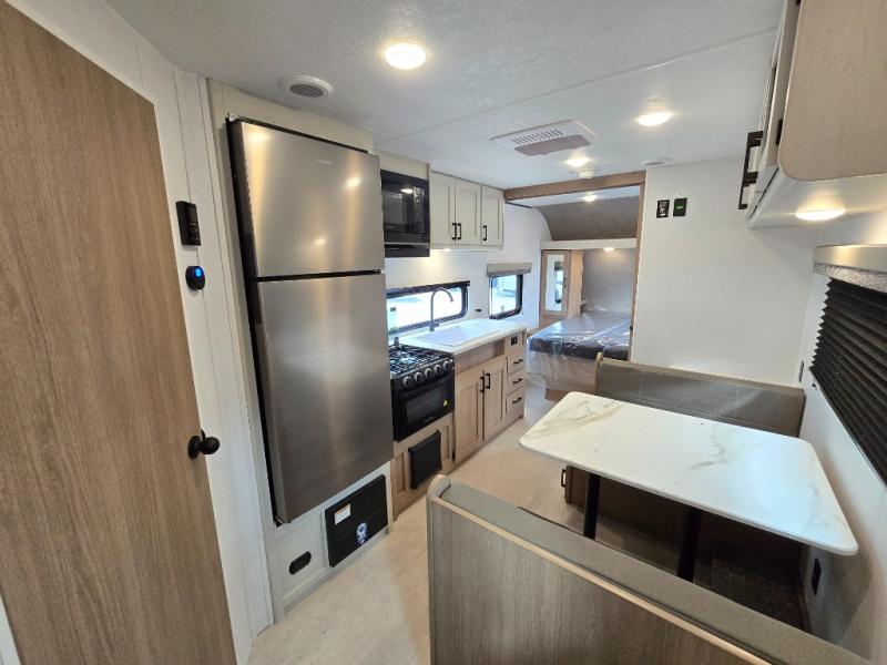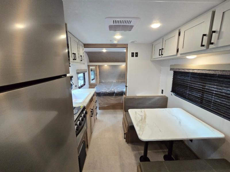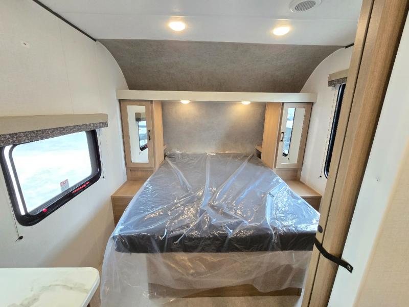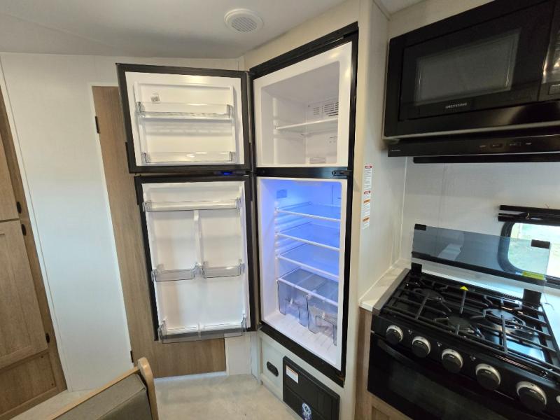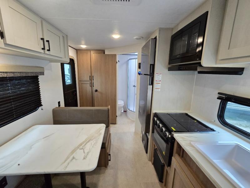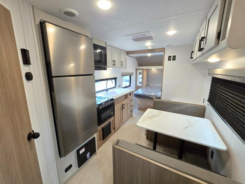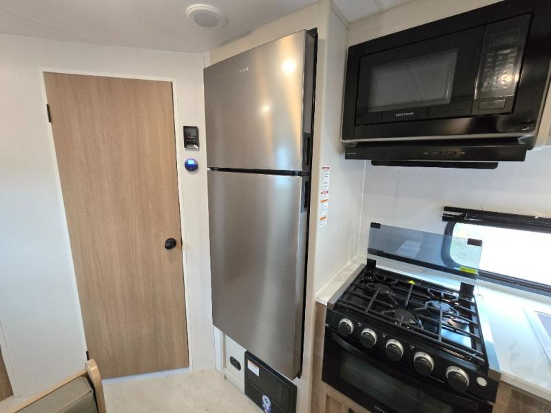 Whatever reason you camp, this lightweight trailer allows you to easily tow to your campsite, and enjoy comforts of home such as your own residential queen bed, wardrobe storage, and a full bathroom with a shower. The booth dinette provides both seating space and sleeping space for a guest. The cook will have an oven and a microwave to make meals, and a 10 cu. ft. 12V refrigerator for cold items, plus a galley sink with high rise faucet to keep the dishes clean.