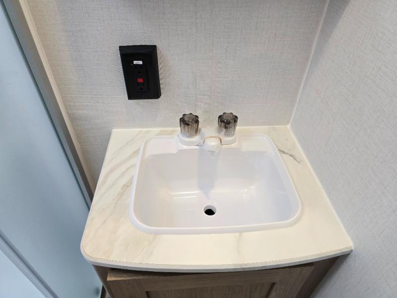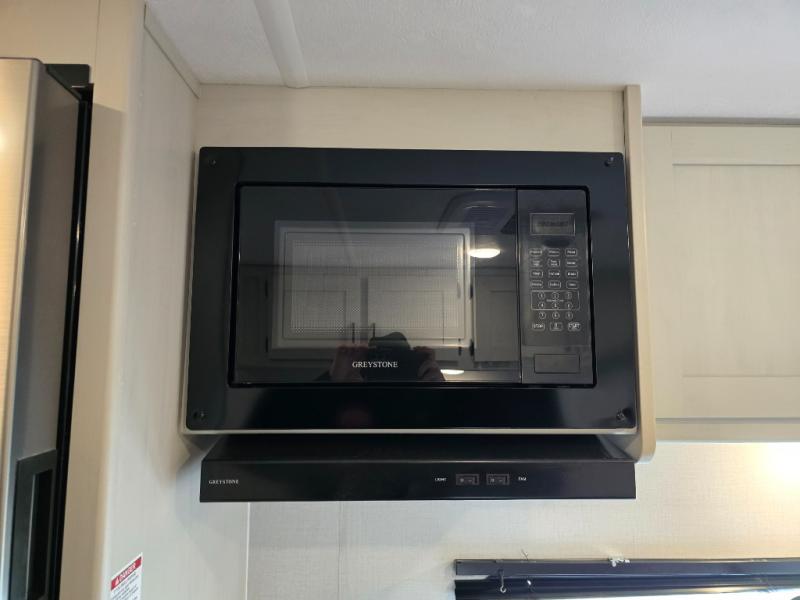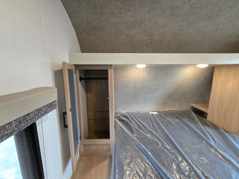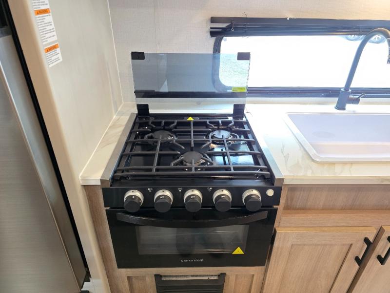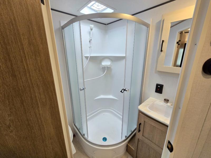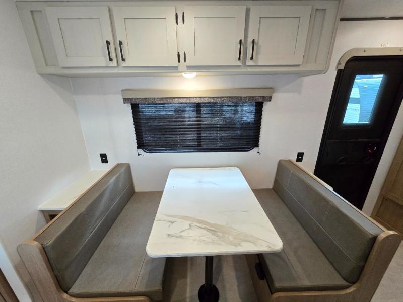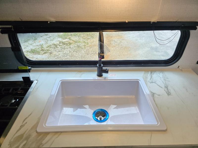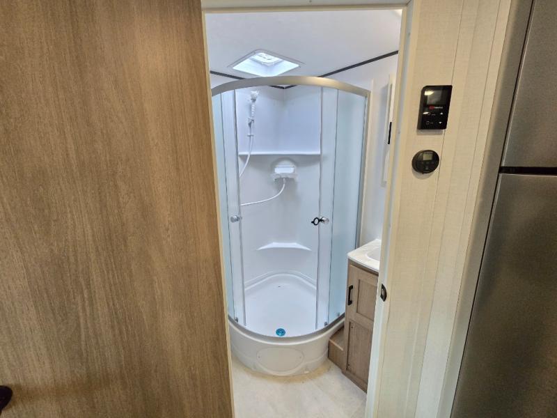 Whatever reason you camp, this lightweight trailer allows you to easily tow to your campsite, and enjoy comforts of home such as your own residential queen bed, wardrobe storage, and a full bathroom with a shower. The booth dinette provides both seating space and sleeping space for a guest. The cook will have an oven and a microwave to make meals, and a 10 cu. ft. 12V refrigerator for cold items, plus a galley sink with high rise faucet to keep the dishes clean.