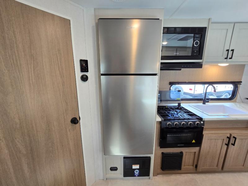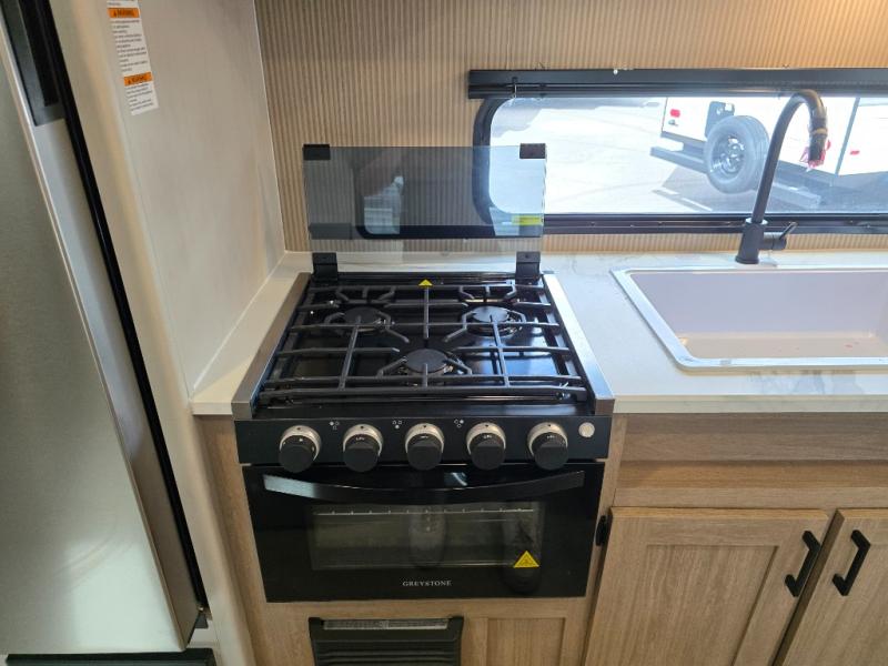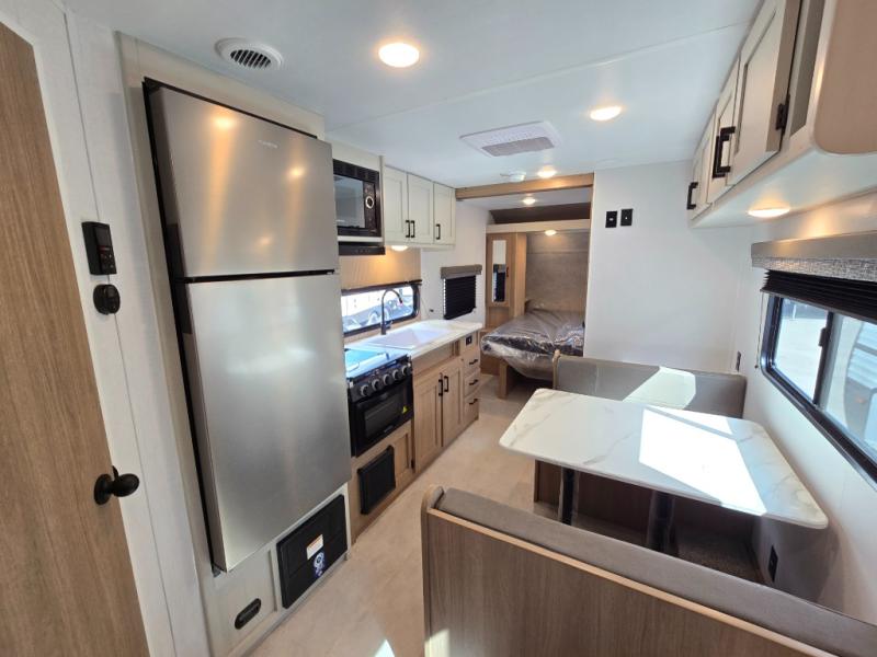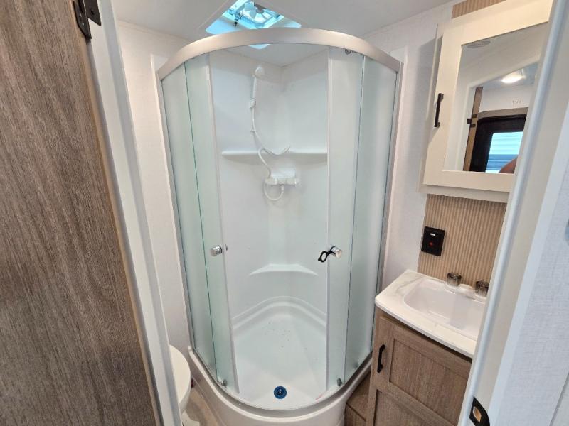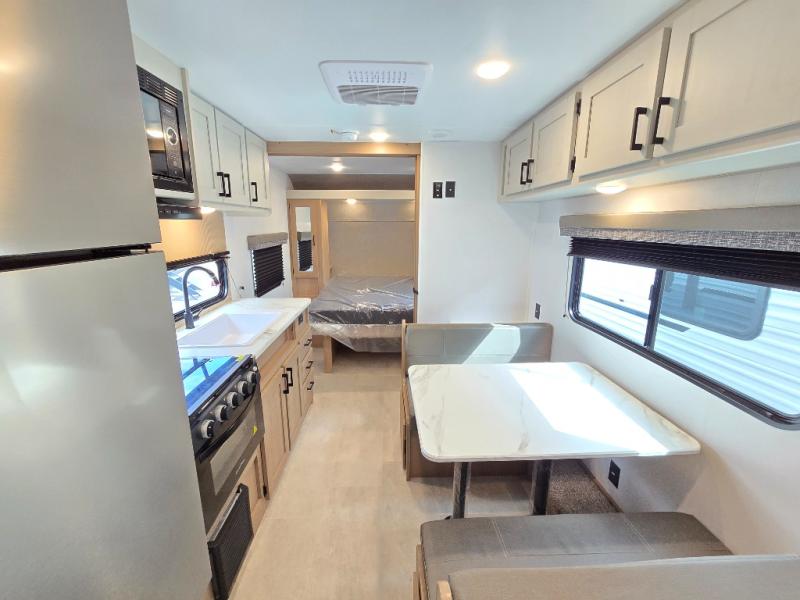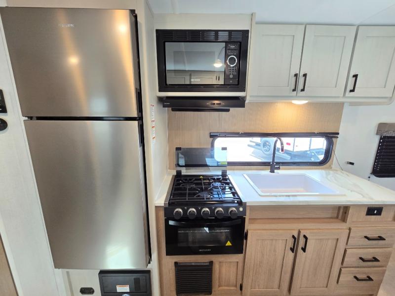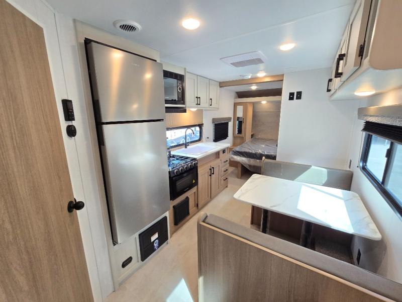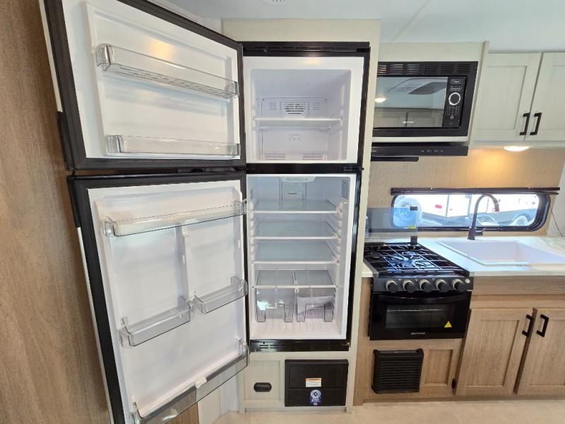 Whatever reason you camp, this lightweight trailer allows you to easily tow to your campsite, and enjoy comforts of home such as your own residential queen bed, wardrobe storage, and a full bathroom with a shower. The booth dinette provides both seating space and sleeping space for a guest. The cook will have an oven and a microwave to make meals, and a 10 cu. ft. 12V refrigerator for cold items, plus a galley sink with high rise faucet to keep the dishes clean.
