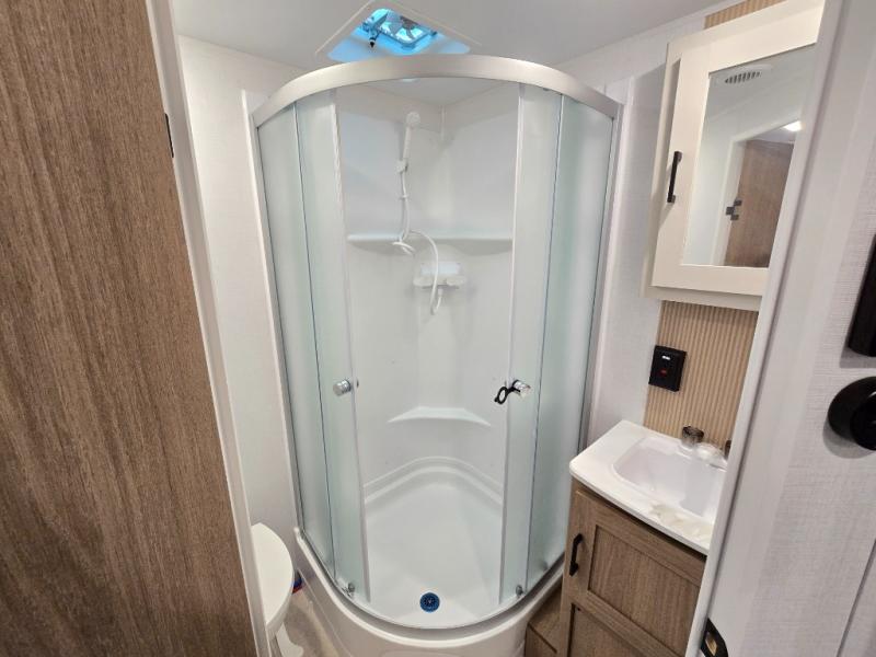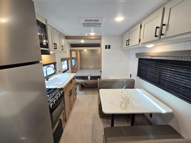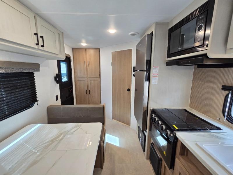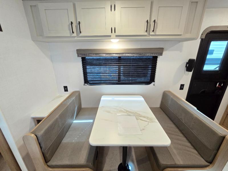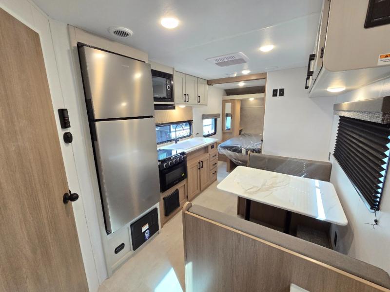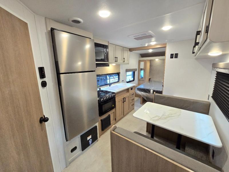 Whatever reason you camp, this lightweight trailer allows you to easily tow to your campsite, and enjoy comforts of home such as your own residential queen bed, wardrobe storage, and a full bathroom with a shower. The booth dinette provides both seating space and sleeping space for a guest. The cook will have an oven and a microwave to make meals, and a 10 cu. ft. 12V refrigerator for cold items, plus a galley sink with high rise faucet to keep the dishes clean.