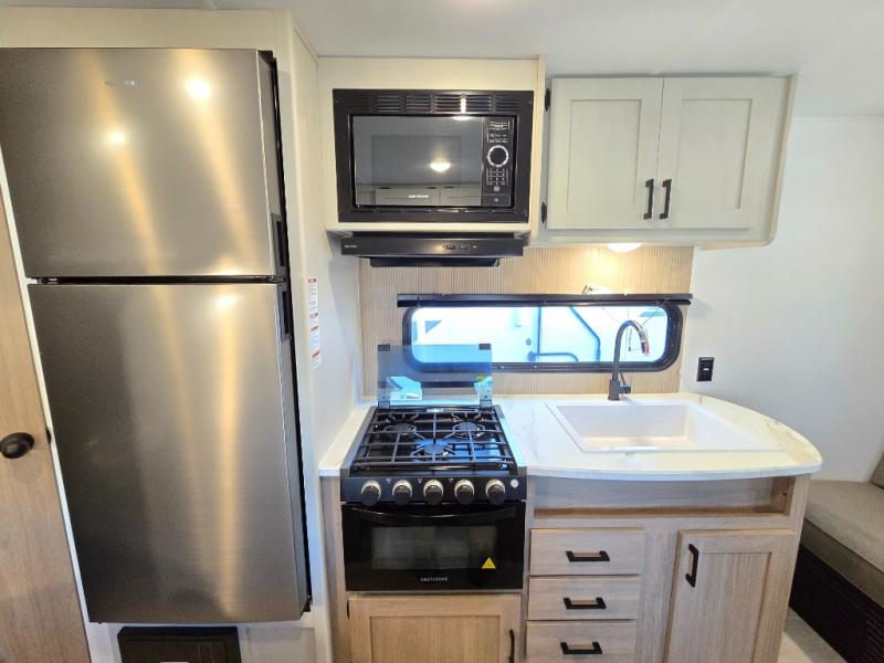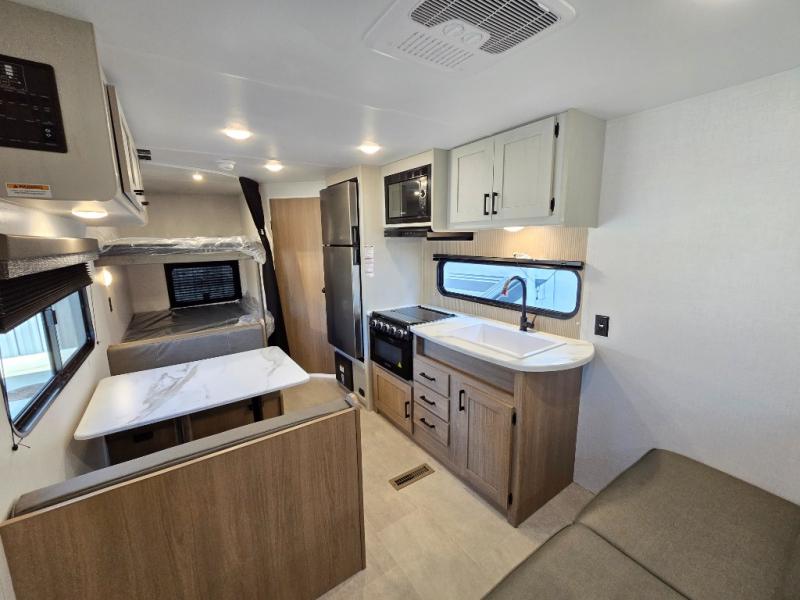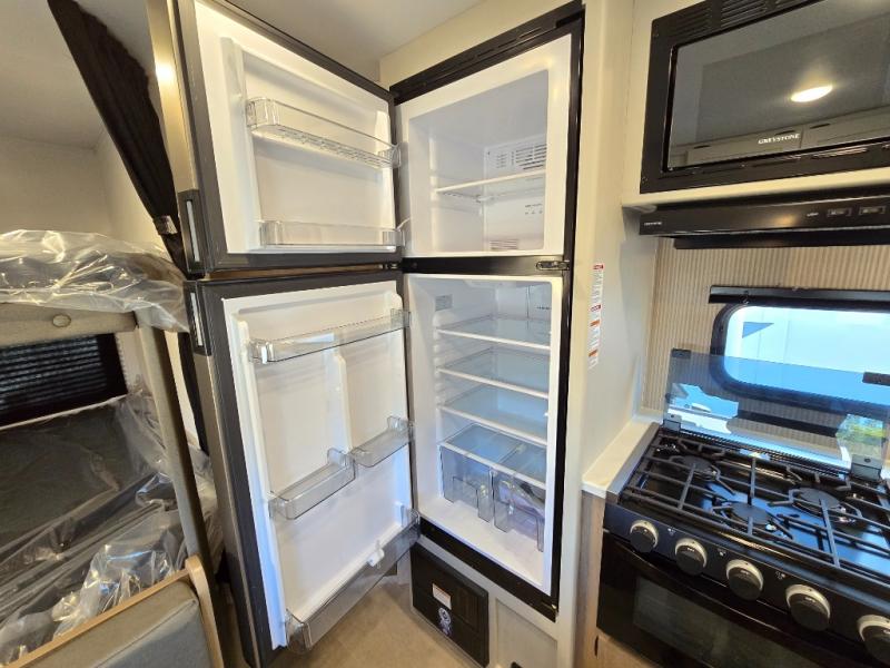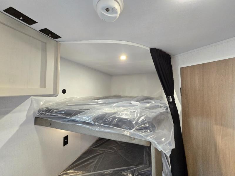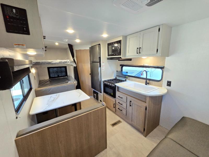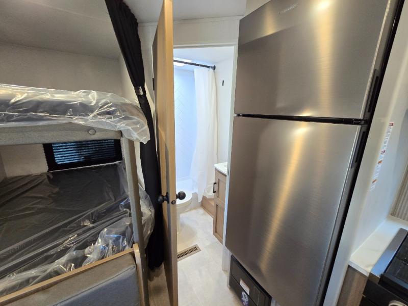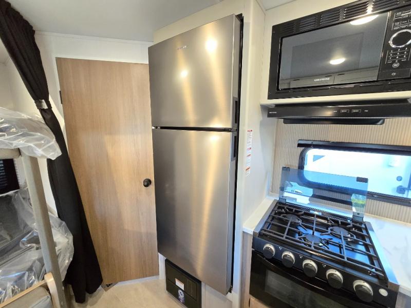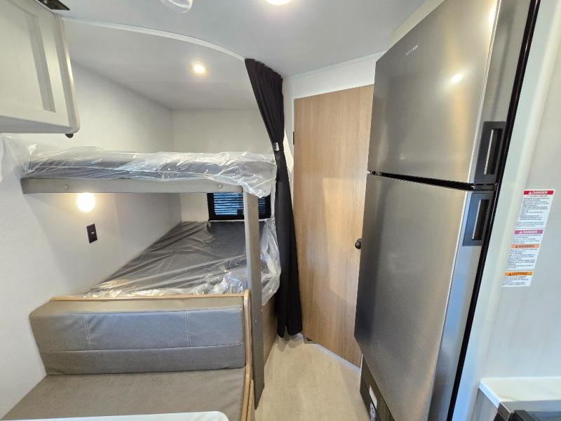 Enjoy privacy in the front bedroom when you close the curtains. You can sleep on your own residential queen bed, and there are two wardrobes to stow away your clothes. Your family and friends can sleep on the double-size bunks in the rear next to the full bathroom with a shower, and the booth dinette as well as the sofa provide extra sleeping space. The 10 cu. ft. 12V refrigerator will hold your cold items, and you can cook using the range top, and keep everything clean using the galley sink with a high rise faucet. And the overhead cabinets will hold your dishes, snacks and such.