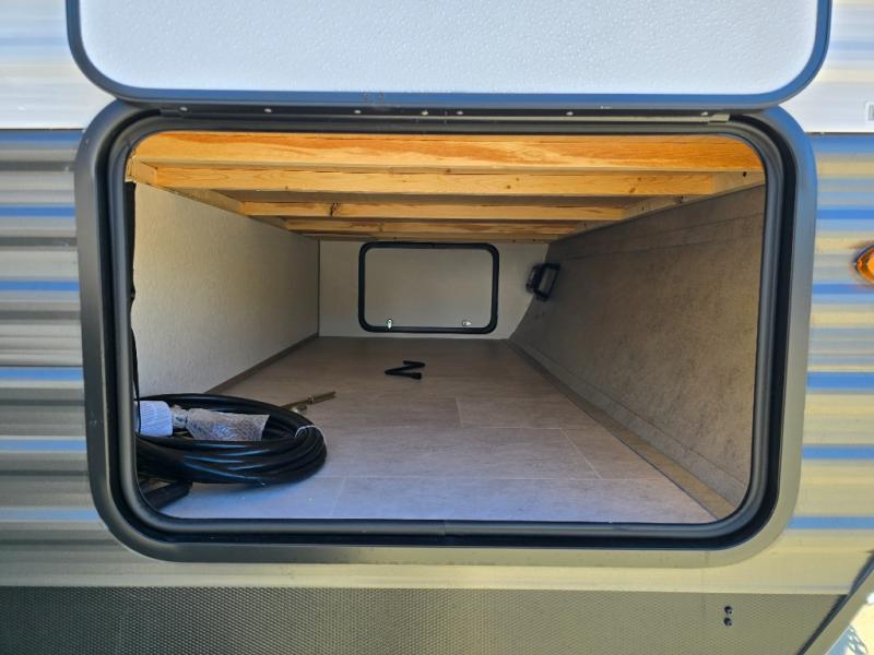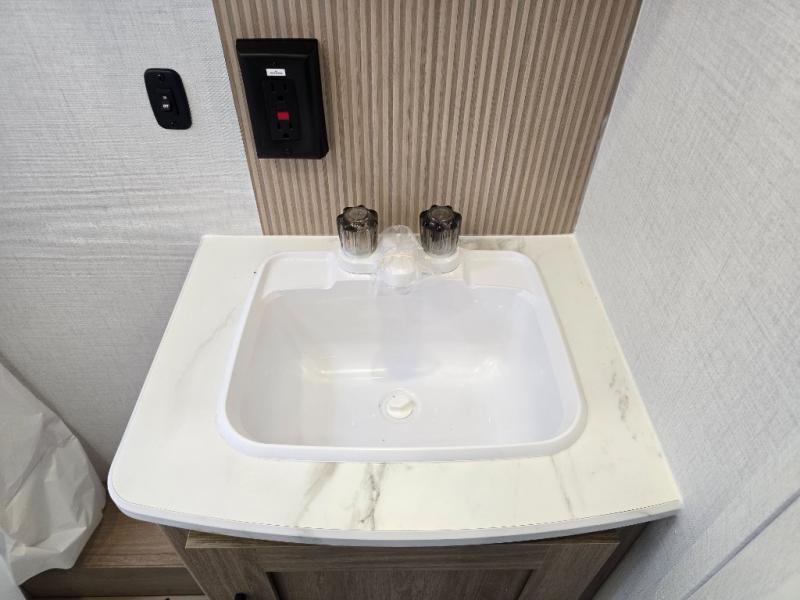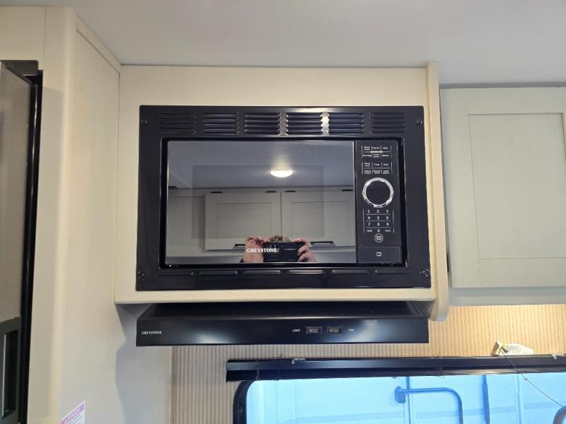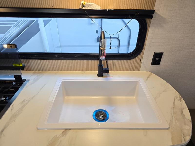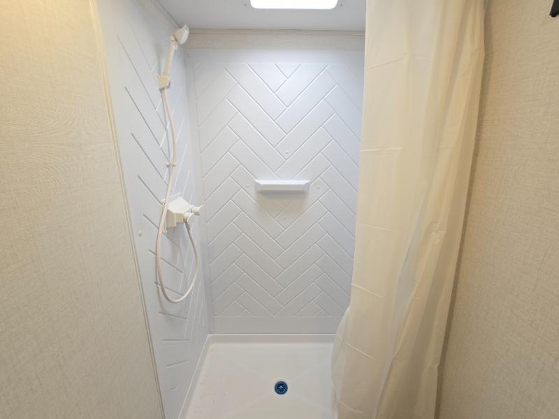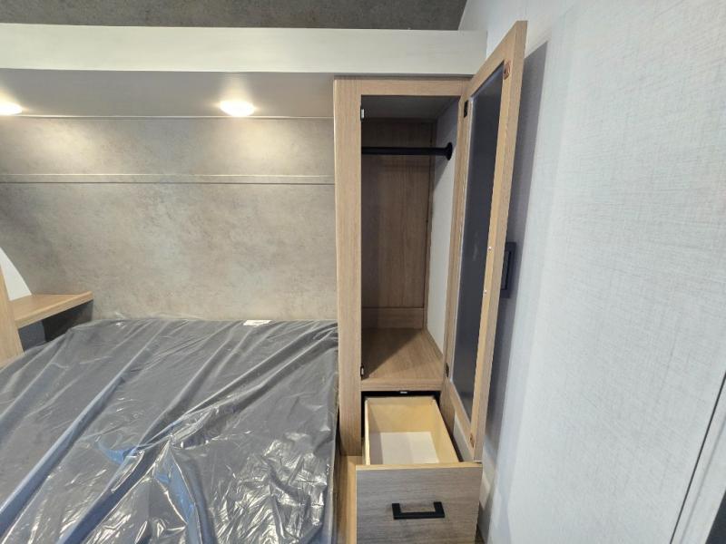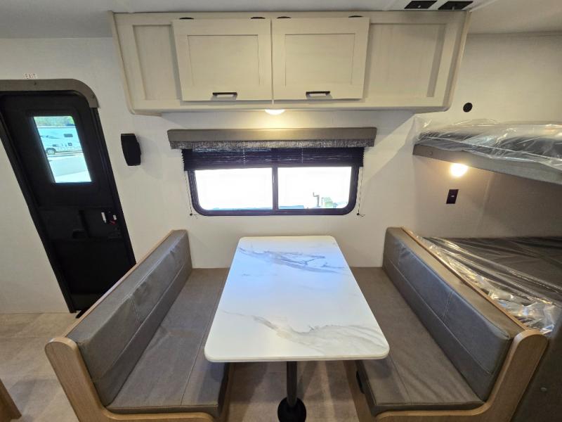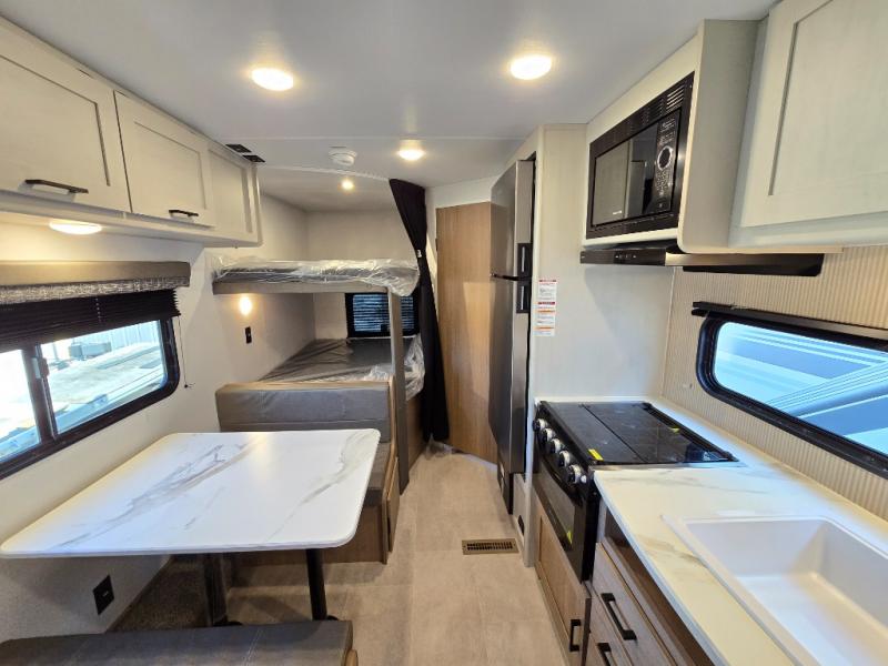 Enjoy privacy in the front bedroom when you close the curtains. You can sleep on your own residential queen bed, and there are two wardrobes to stow away your clothes. Your family and friends can sleep on the double-size bunks in the rear next to the full bathroom with a shower, and the booth dinette as well as the sofa provide extra sleeping space. The 10 cu. ft. 12V refrigerator will hold your cold items, and you can cook using the range top, and keep everything clean using the galley sink with a high rise faucet. And the overhead cabinets will hold your dishes, snacks and such.
