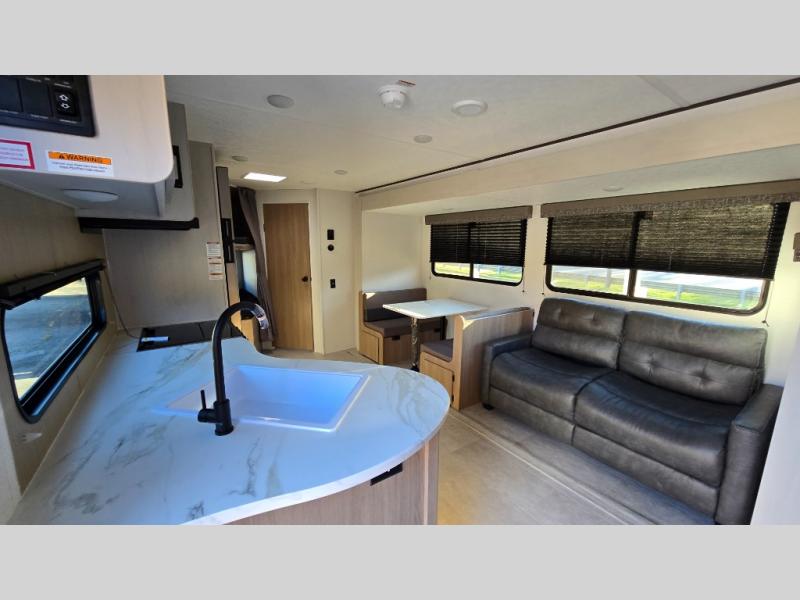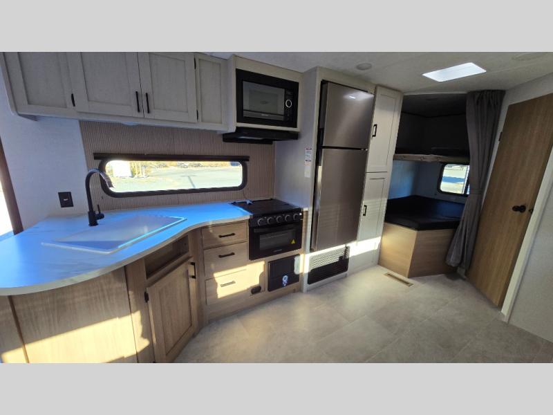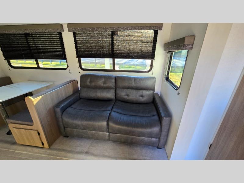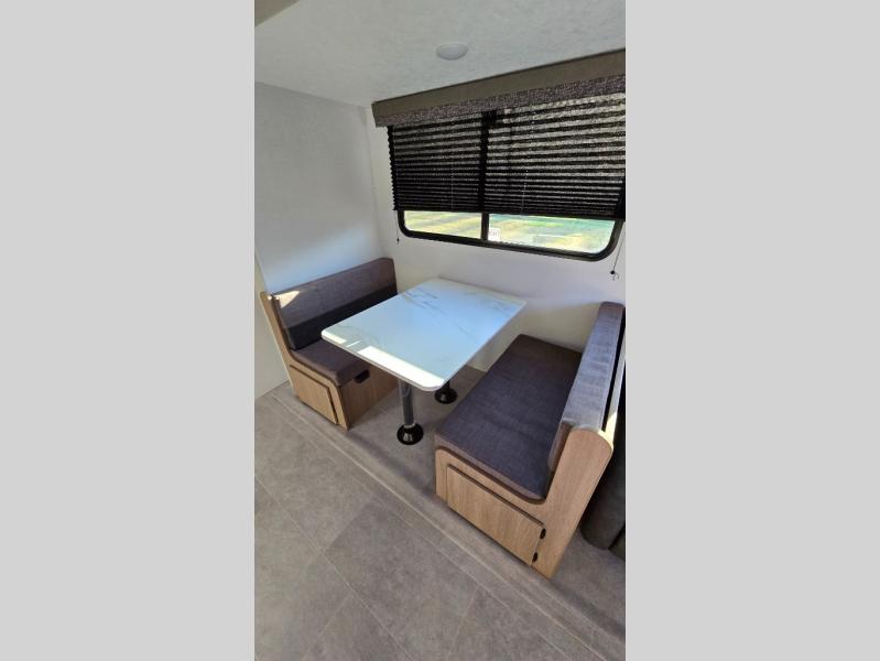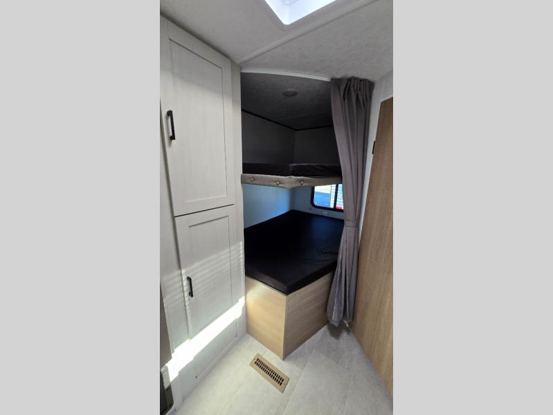 Get ready for fun and relaxation at the campgrounds with this trailer in your campsite. You can fish in the river, hike the trails and relax under the power awning before heading inside to enjoy the comforts of home. You will also enjoy having double access to the private bedroom which offers a residential queen bed and dual closets, plus the full bathroom will keep you refreshed after outdoor fun. The double-size bunks offer sleeping for four, and the furniture doubles as extra sleeping space. The cook will have full amenities including a 10 cu. ft. 12V refrigerator to store lots of cold items. And the large slide gives everyone more floor space.