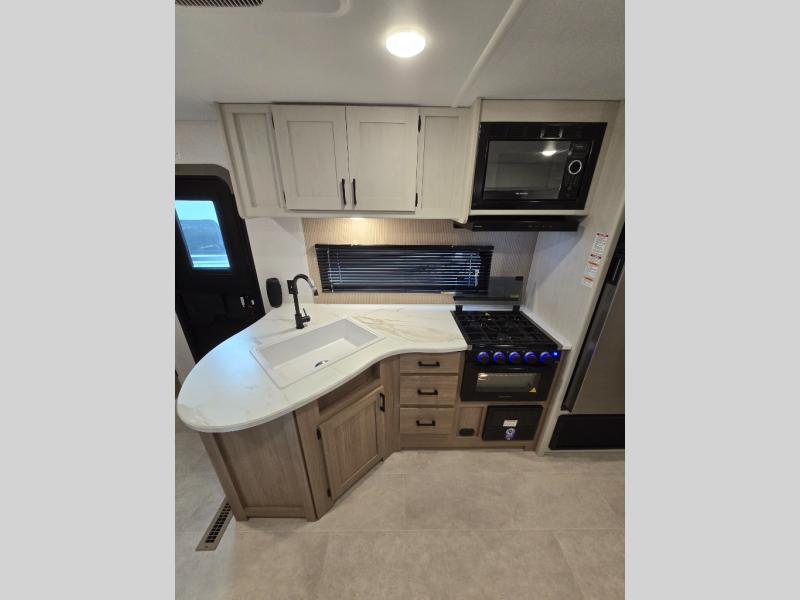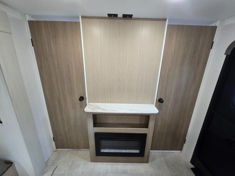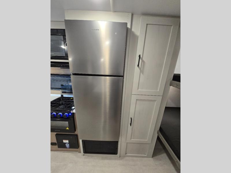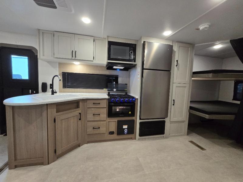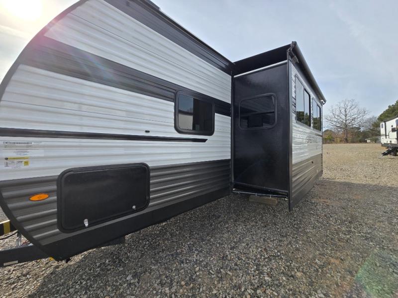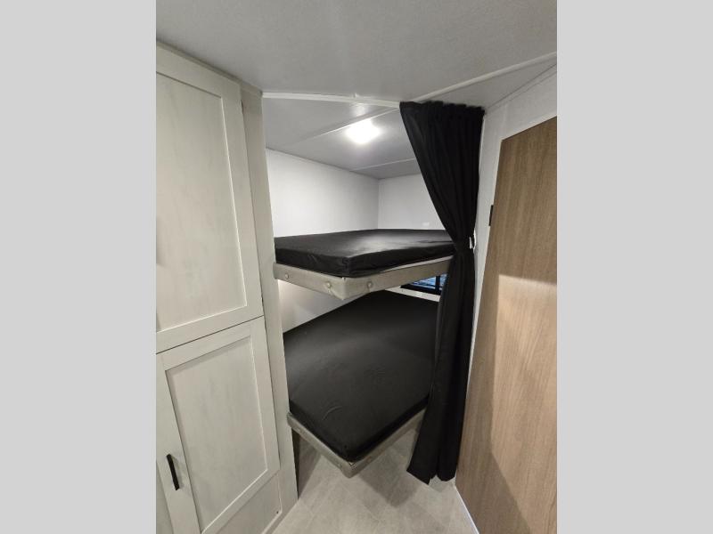 Get ready for fun and relaxation at the campgrounds with this trailer in your campsite. You can fish in the river, hike the trails and relax under the power awning before heading inside to enjoy the comforts of home. You will also enjoy having double access to the private bedroom which offers a residential queen bed and dual closets, plus the full bathroom will keep you refreshed after outdoor fun. The double-size bunks offer sleeping for four, and the furniture doubles as extra sleeping space. The cook will have full amenities including a 10 cu. ft. 12V refrigerator to store lots of cold items. And the large slide gives everyone more floor space.