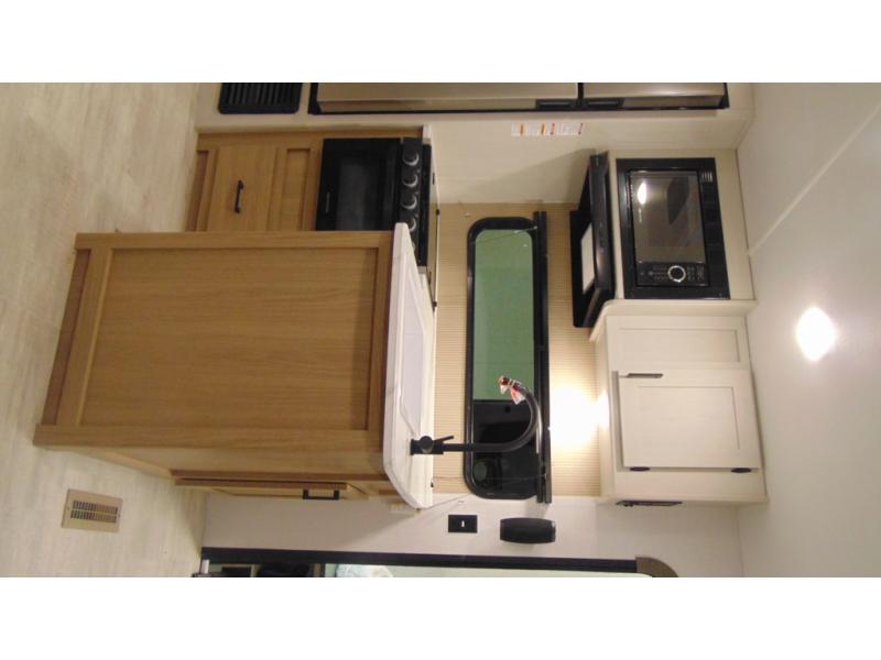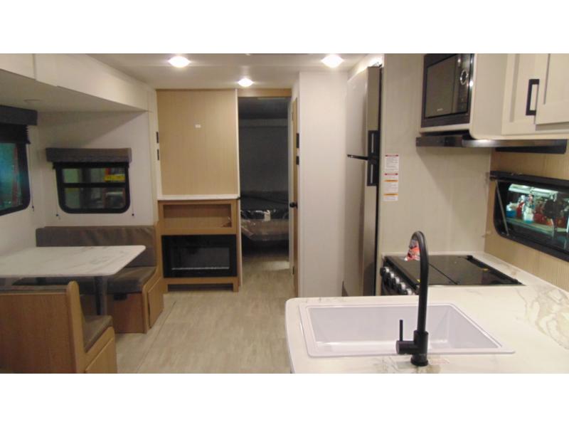 With dual entry doors, you can easily enter and exit this travel trailer! The jackknife sofa with footrest and booth dinette are next to each other near the fireplace, as well as two rear recliners allowing you to visit with other RVers or your family. The cook will have an oven and a microwave to make meals, and a 12V refrigerator for cold items, plus a galley sink to keep the dishes clean. Speaking of being clean, the full bathroom offers a shower with exhaust fan to eliminate unwanted steam as you clean yourself up after a fun day at the beach. The front private bedroom has a residential queen bed and one of the entrance/exit doors so you can slip out for an early morning fishing trip!