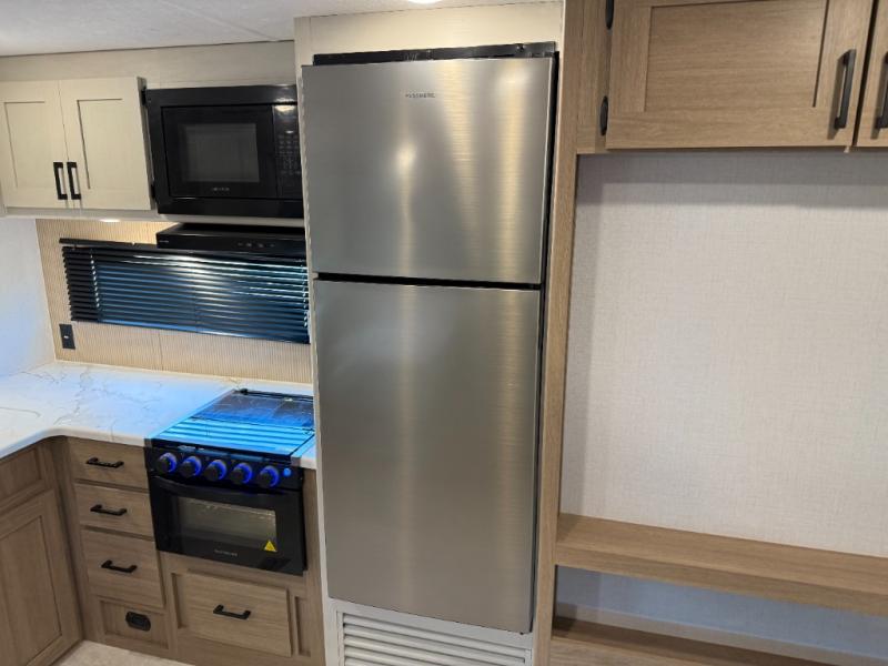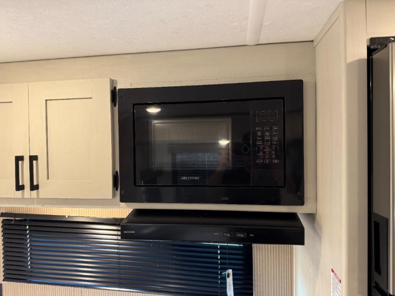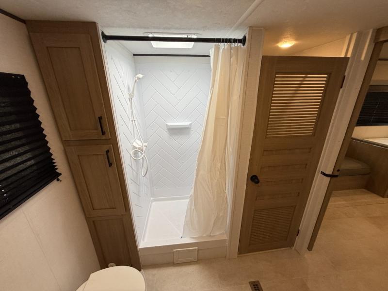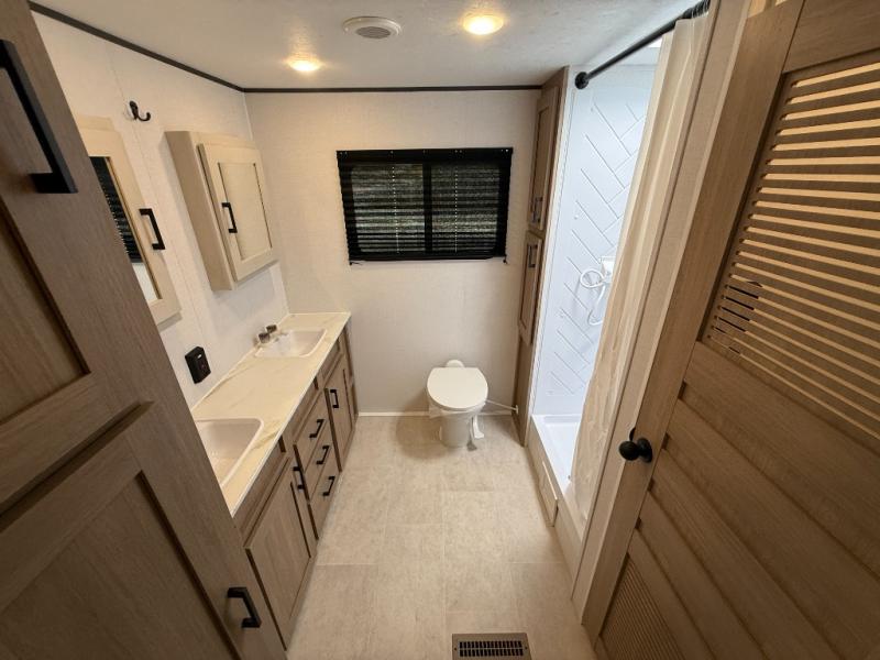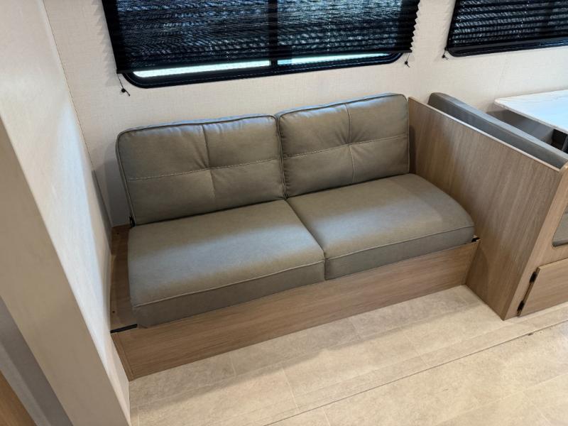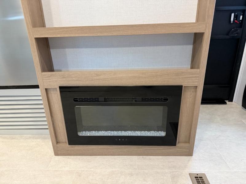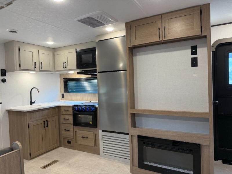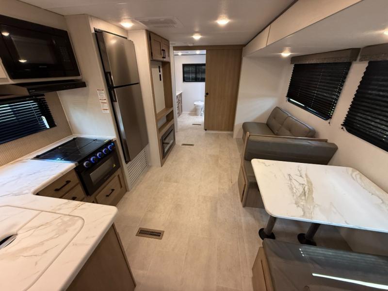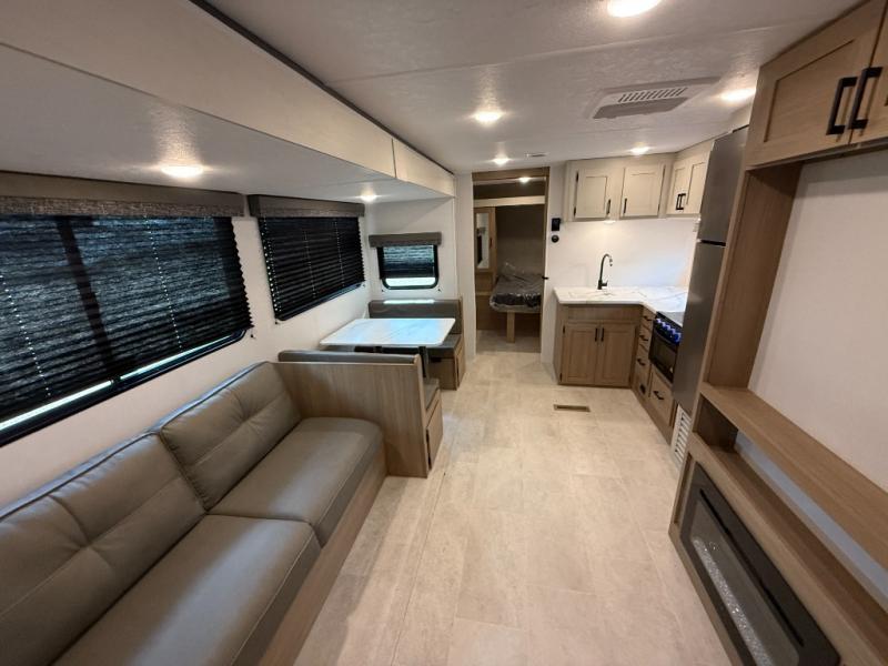 Time spent at the campground in this spacious travel trailer will be time well spent! Once you've unloaded your gear from the exterior pass-through storage, you can head inside to make lunch in the full kitchen, then dine around the U-shaped dinette within the large slide out. There is also a jack knife sofa here, along with a fireplace across from the furniture to make your space cozier. The spacious full rear bath includes a shower with a skylight, dual bath sinks, two linen closets, and a third linen closet with washer and dryer prep! While your guests convert the dinette and sofa to sleeping space, you can take the queen bed in the front private bedroom, complete with dual closets and an overhead shelf for your things!