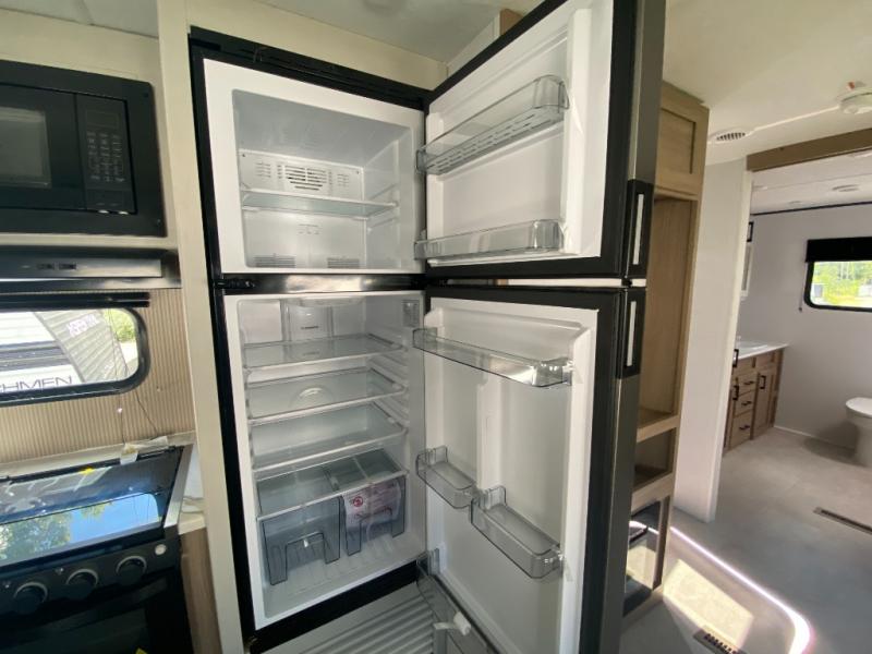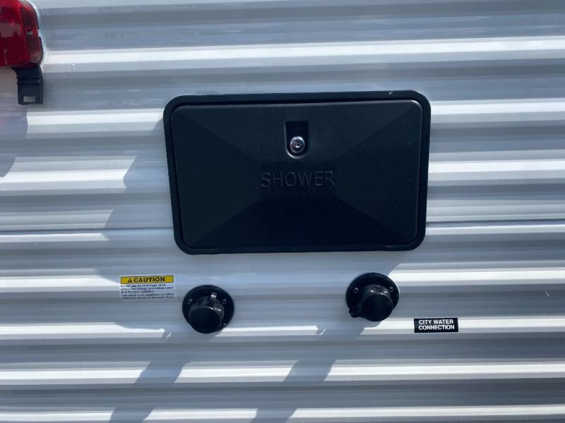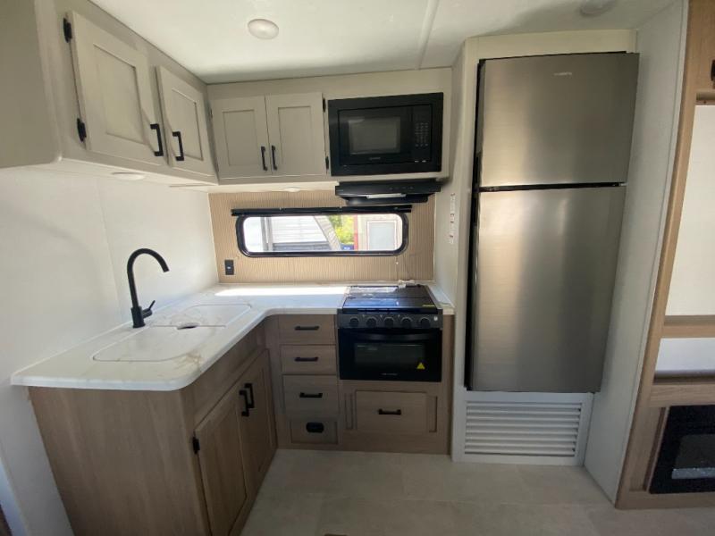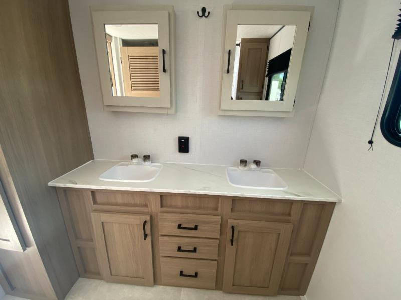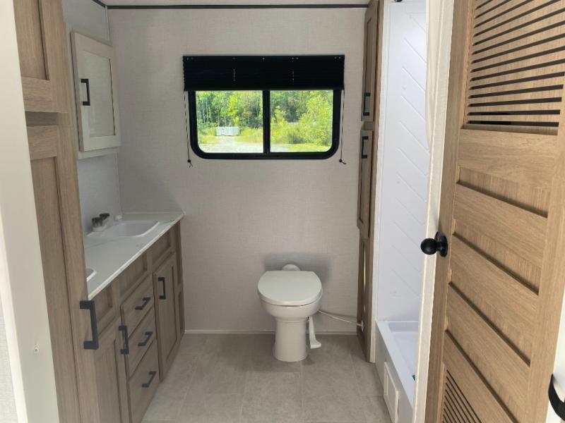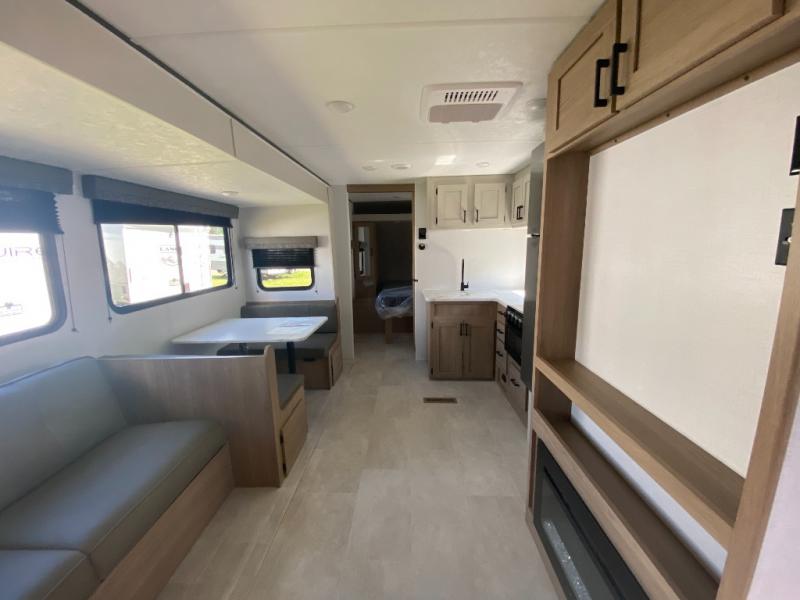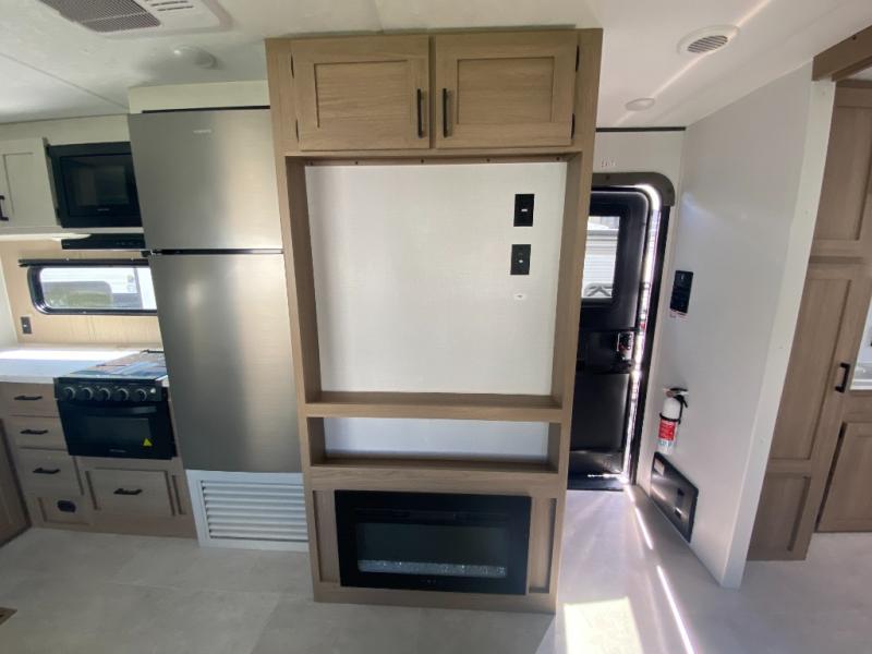 Time spent at the campground in this spacious travel trailer will be time well spent! Once you've unloaded your gear from the exterior pass-through storage, you can head inside to make lunch in the full kitchen, then dine around the U-shaped dinette within the large slide out. There is also a jack knife sofa here, along with a fireplace across from the furniture to make your space cozier. The spacious full rear bath includes a shower with a skylight, dual bath sinks, two linen closets, and a third linen closet with washer and dryer prep! While your guests convert the dinette and sofa to sleeping space, you can take the queen bed in the front private bedroom, complete with dual closets and an overhead shelf for your things!
