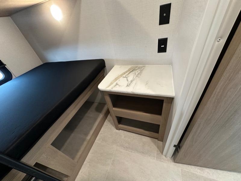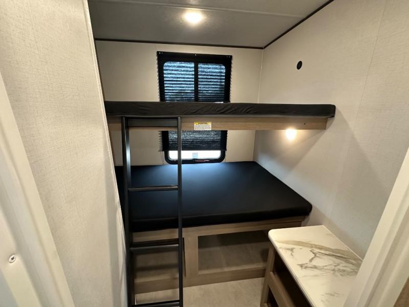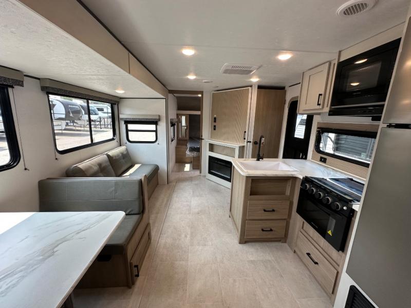 This travel trailer is one your whole crew will love! There is a rear private bunkhouse with double-size bunks for the little ones, a front private bedroom for you, and a booth dinette and jackknife sofa for even more sleeping space! The chef has their choice to cook indoors on the three burner range and microwave oven, or head outdoors to cook on the outdoor kitchen! The full bath will let everyone clean up each day, and the fireplace and large slide out will make your space feel more like home. And don't overlook the pass-through storage and 16' power awning with LED lights!