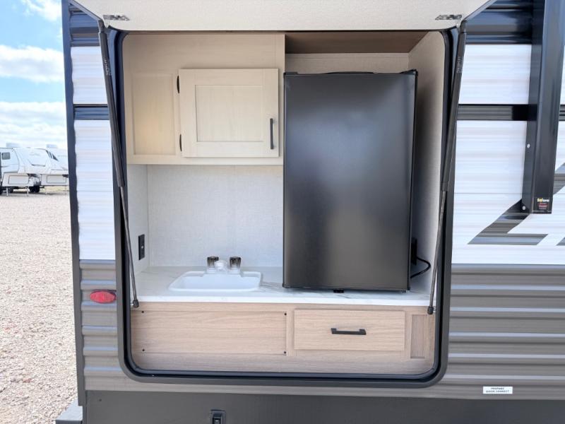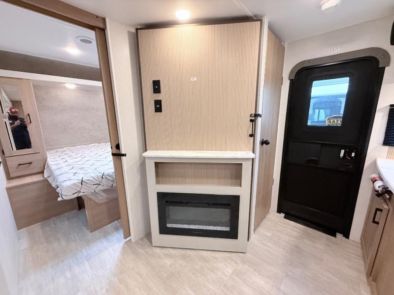 This travel trailer is one your whole crew will love! There is a rear private bunkhouse with double-size bunks for the little ones, a front private bedroom for you, and a booth dinette and jackknife sofa for even more sleeping space! The chef has their choice to cook indoors on the three burner range and microwave oven, or head outdoors to cook on the outdoor kitchen! The full bath will let everyone clean up each day, and the fireplace and large slide out will make your space feel more like home. And don't overlook the pass-through storage and 16' power awning with LED lights!