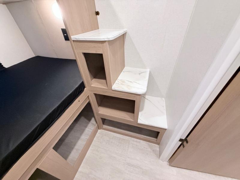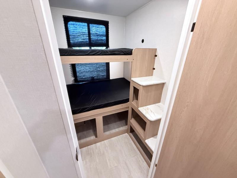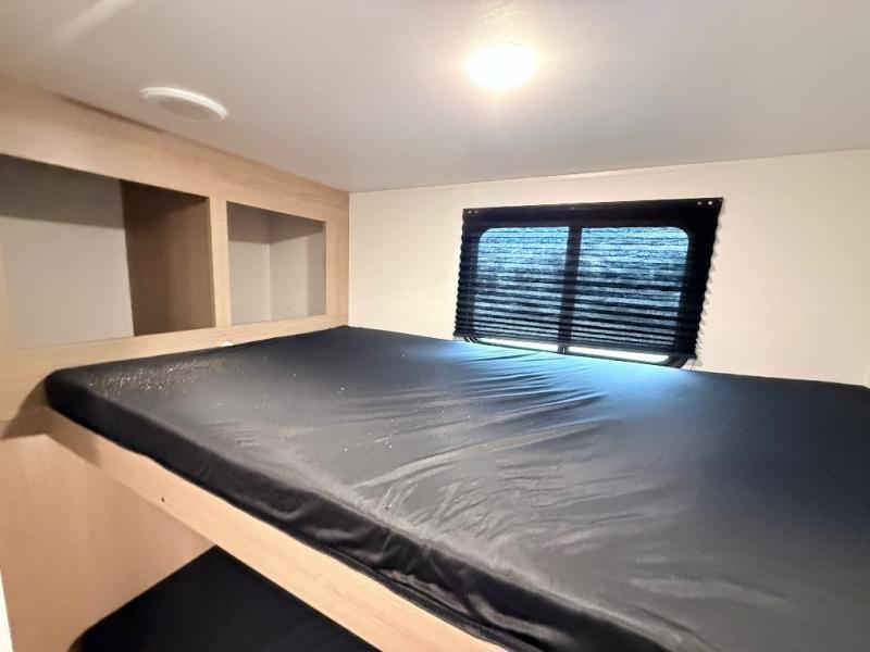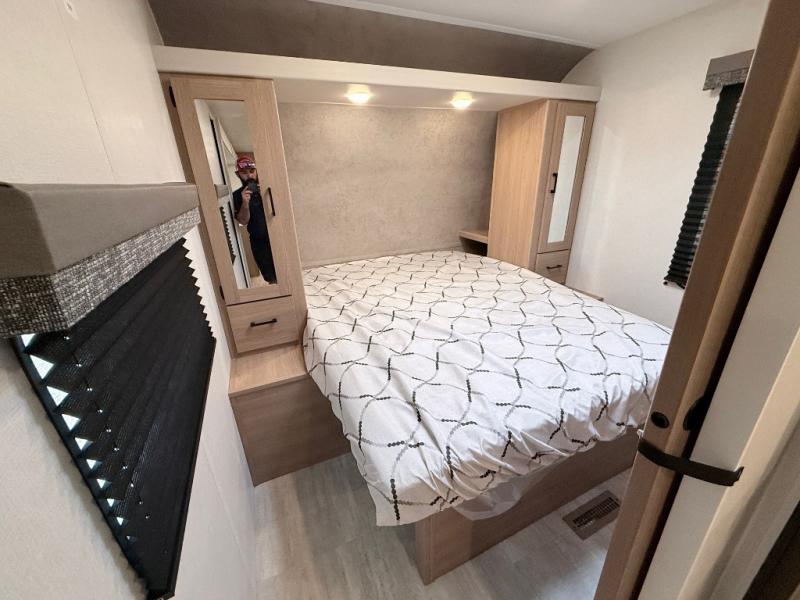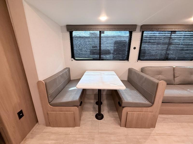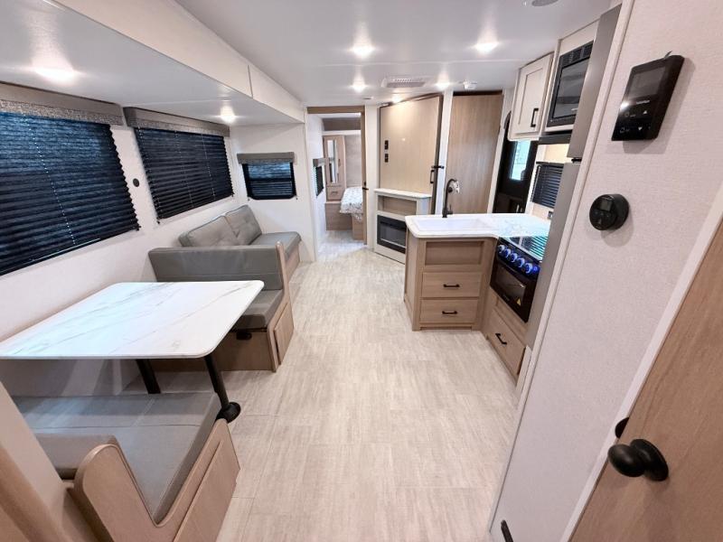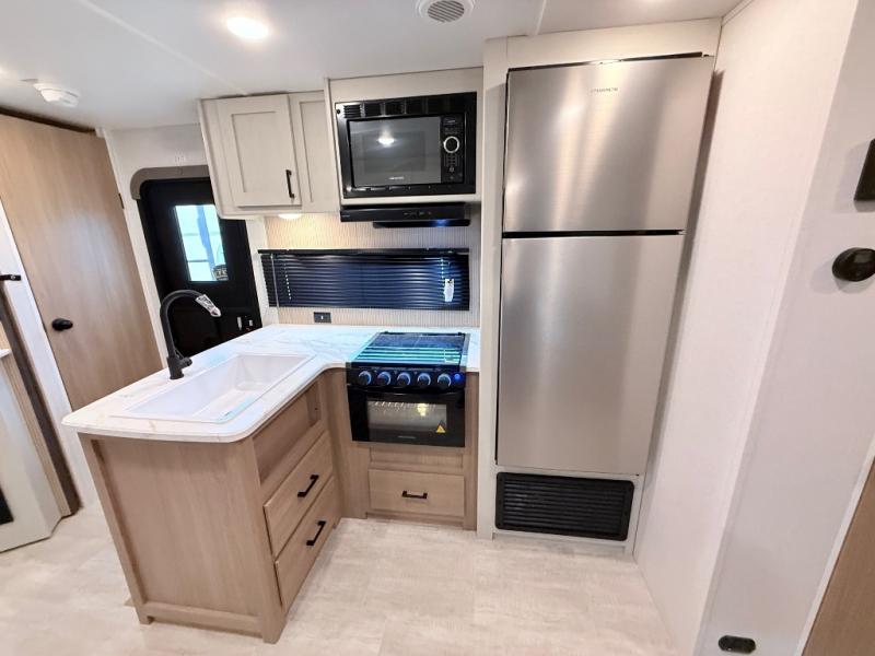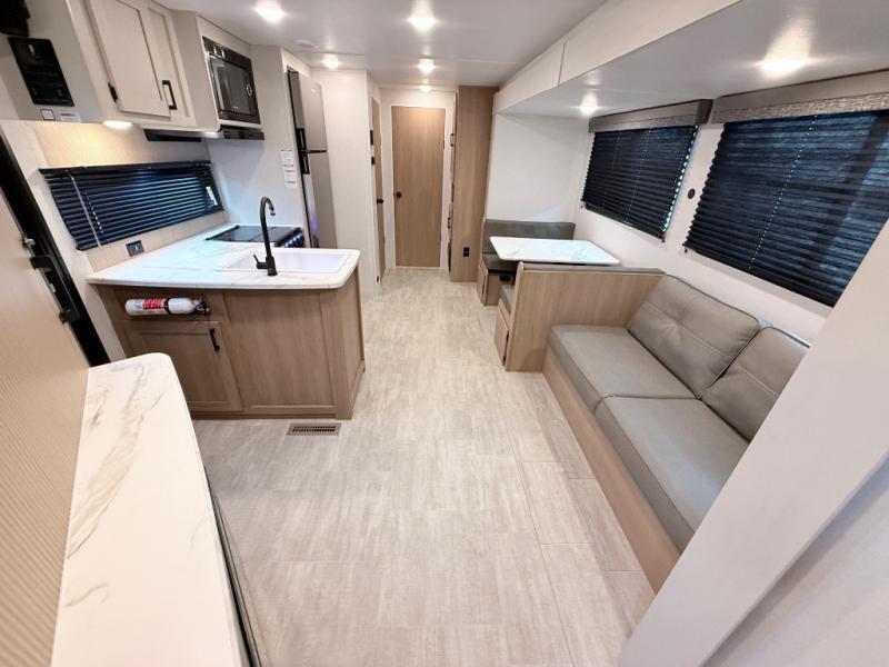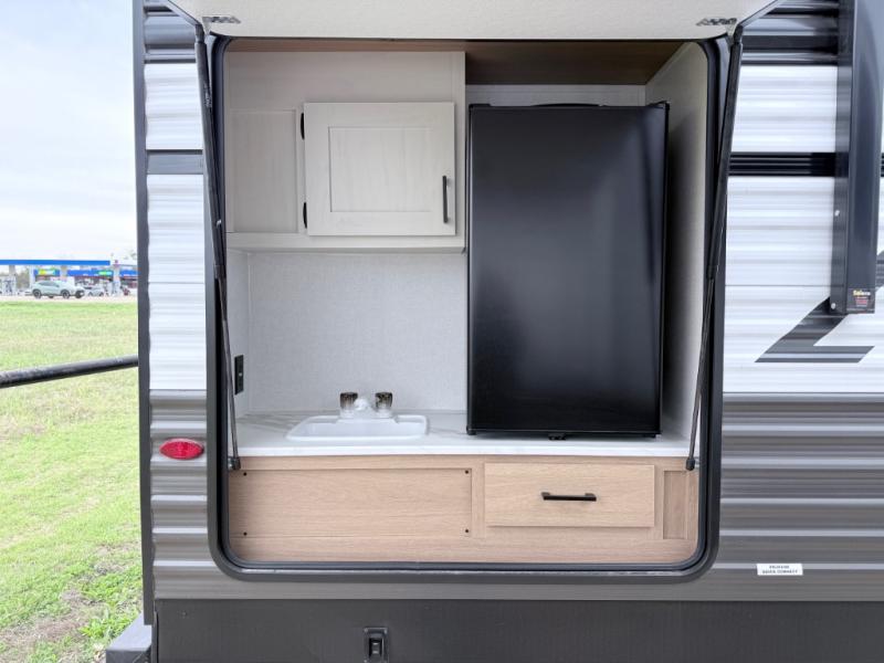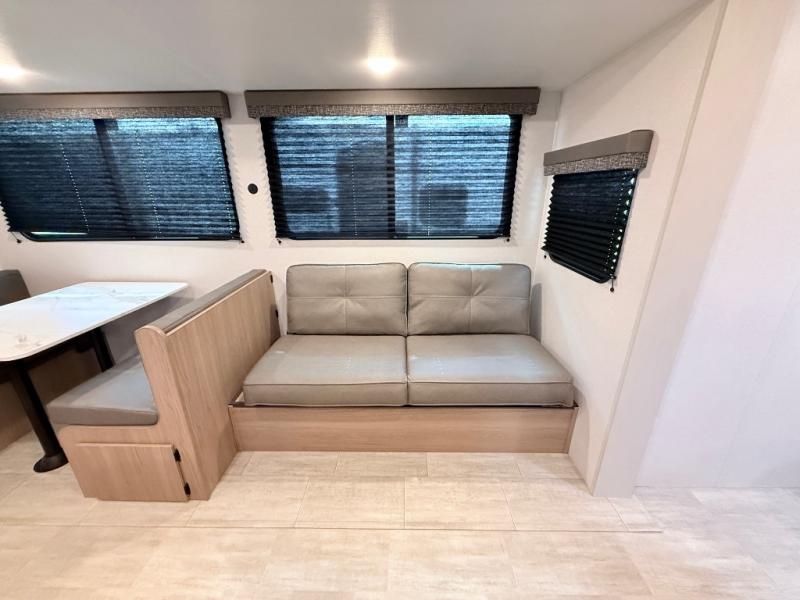 This travel trailer is one your whole crew will love! There is a rear private bunkhouse with double-size bunks for the little ones, a front private bedroom for you, and a booth dinette and jackknife sofa for even more sleeping space! The chef has their choice to cook indoors on the three burner range and microwave oven, or head outdoors to cook on the outdoor kitchen! The full bath will let everyone clean up each day, and the fireplace and large slide out will make your space feel more like home. And don't overlook the pass-through storage and 16' power awning with LED lights!