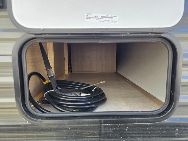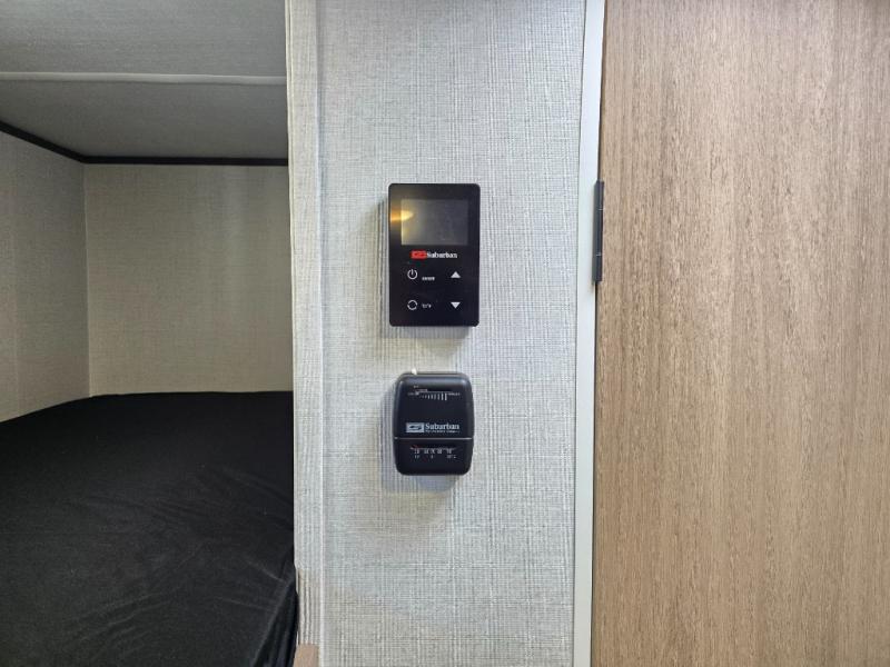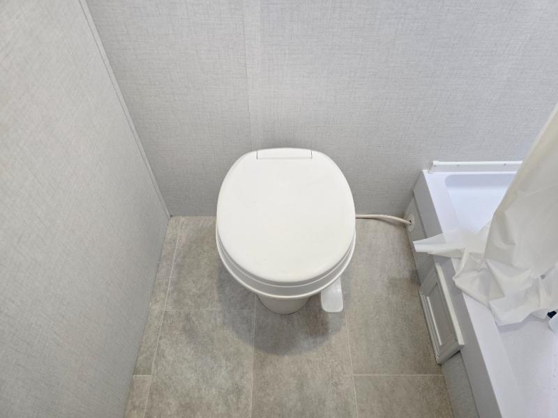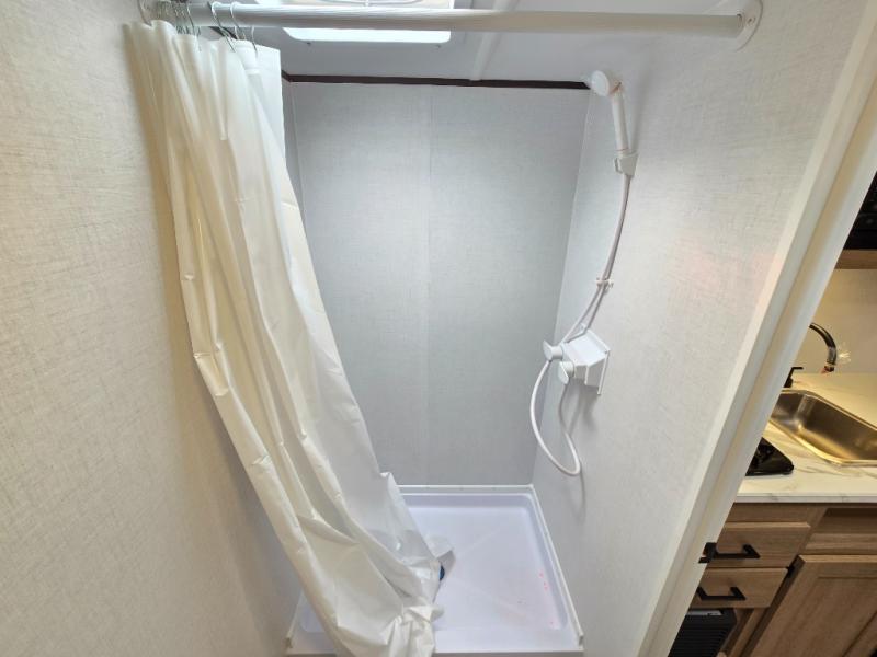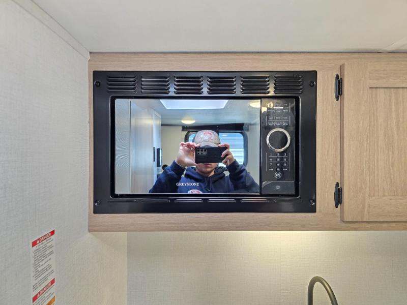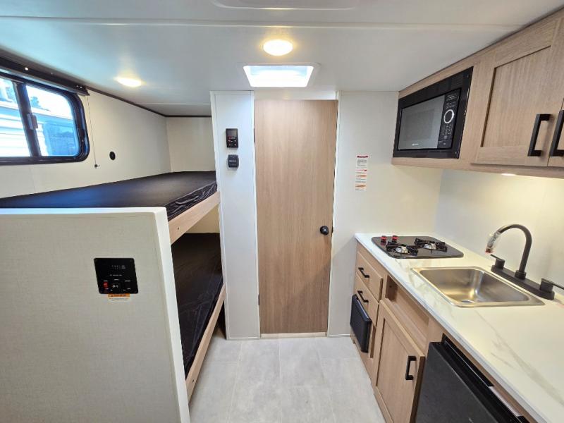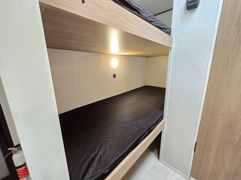 This lightweight unit may surprise you with the comfort found inside. You can sleep comfortably each night on the front queen bed with overhead cabinets, while your guests or littles ones take the bunk beds with a hinged top bunk. A two-burner cooktop and microwave oven will let you make breakfast for everyone in the morning, and the private shower and toilet inside means you won't have to use the camp's facilities to get ready.