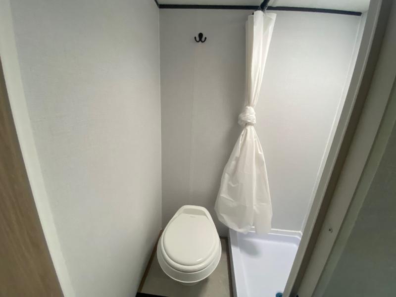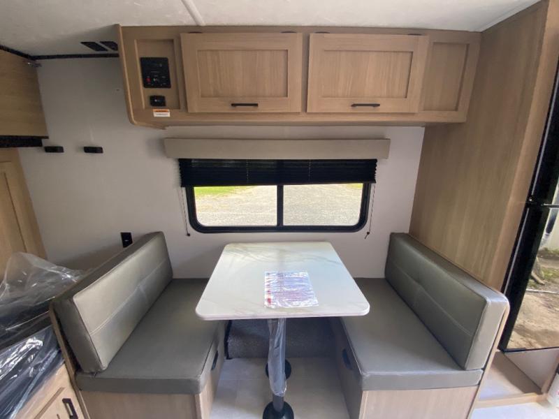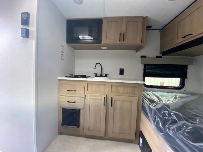 This lightweight unit may surprise you with the comfort found inside. You can sleep comfortably each night on the front 54" x 74" full-size bed with a 36" x 92" fold-down bunk above, and there is a wardrobe to keep your things tidy. A two-burner cooktop and microwave oven will let you make breakfast for everyone in the morning, and the booth dinette provides a place to dine together.