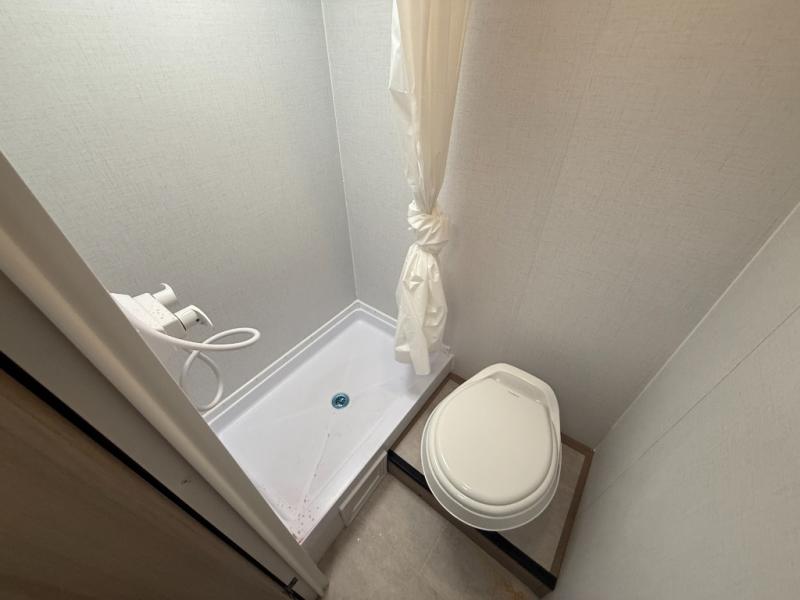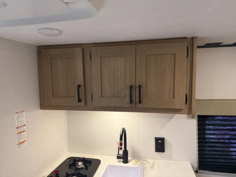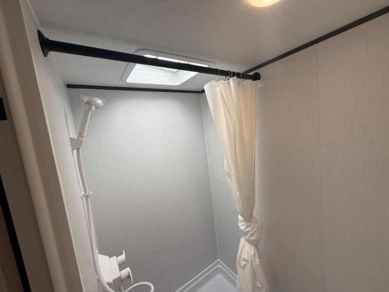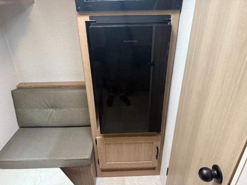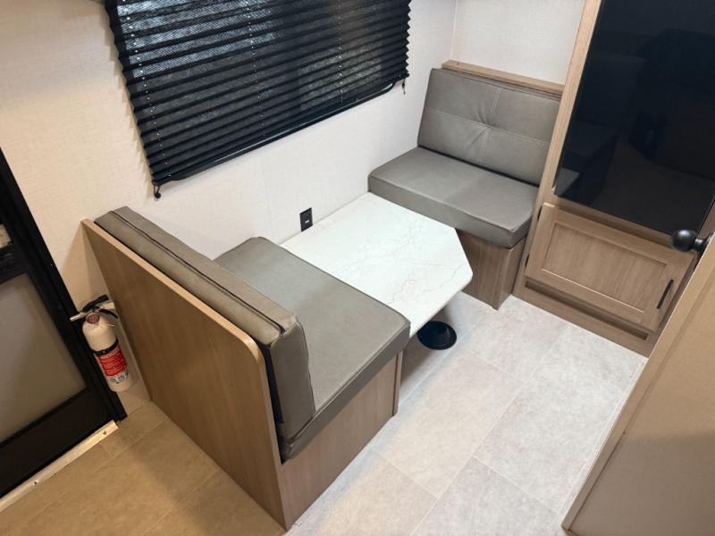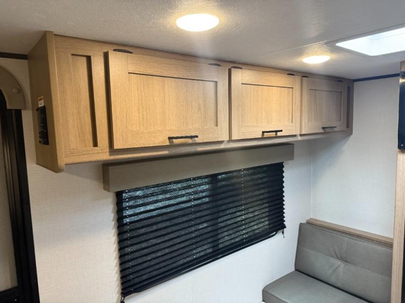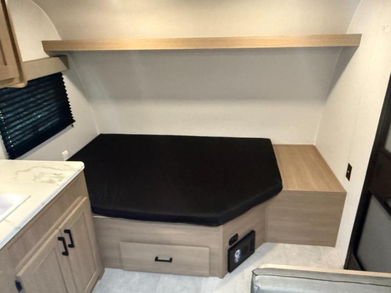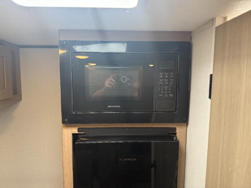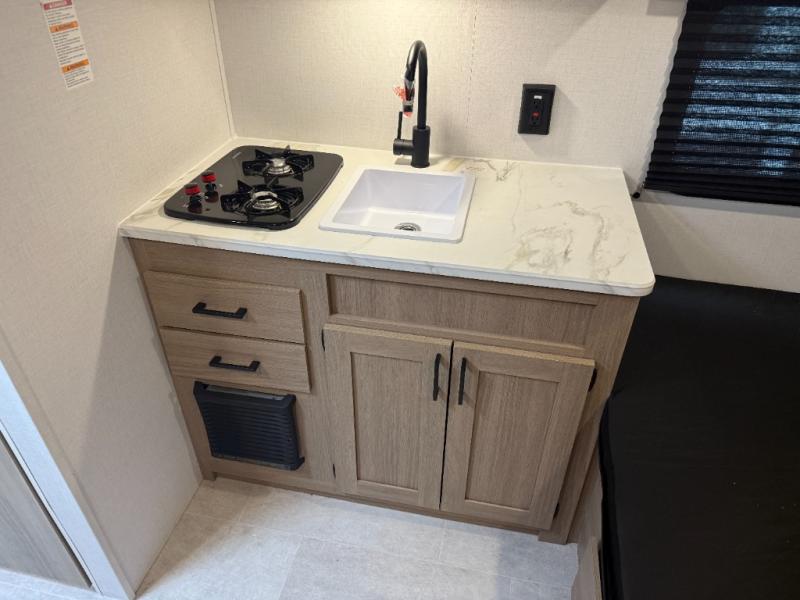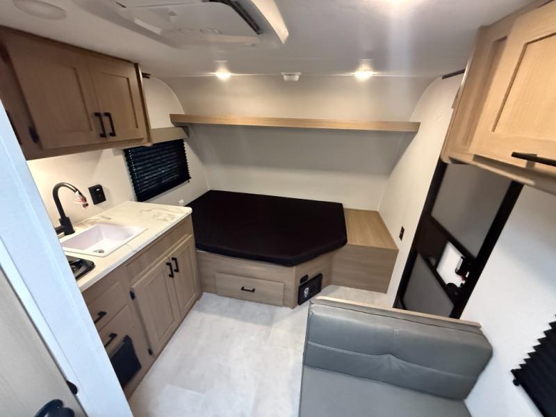 This lightweight unit may surprise you with the comfort found inside. You can sleep comfortably each night on the front full-size bed with an overhead cabinet, and there is a booth dinette that can sleep one to two more. A two-burner cooktop and microwave oven will let you make breakfast for everyone in the morning, and the private bath inside means you won't have to use the camp's facilities to get ready.