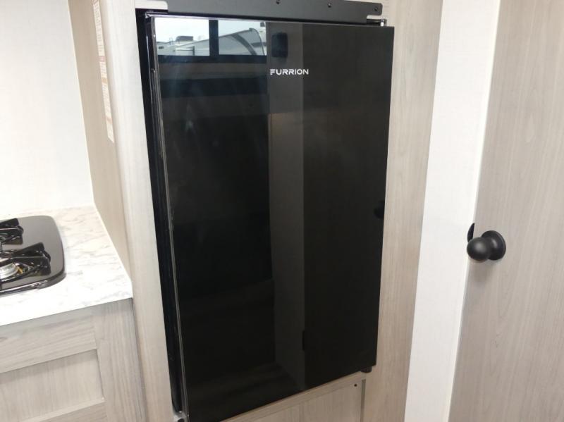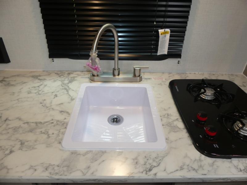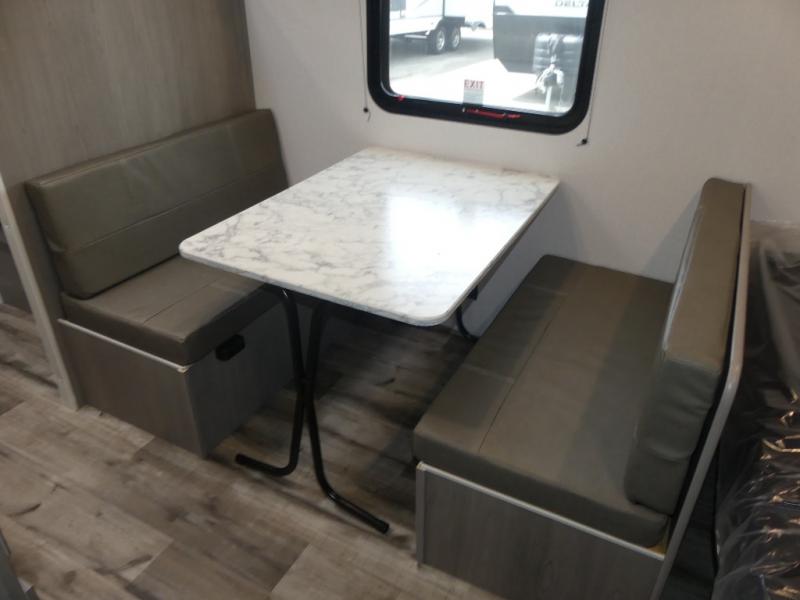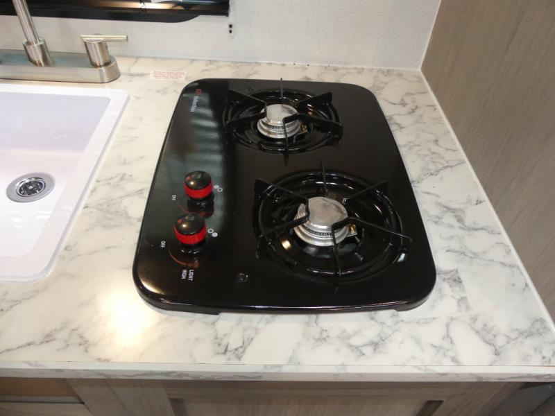 A perfect trailer for your family of three to five featuring a set of bunk beds for the kids, a queen bed up front for you, and the booth dinette that can be converted to sleep one or two more depending on size. For meals, there is a two burner cooktop and sink, plus a 3.3 cu. ft. refrigerator for your perishables. Overhead cabinetry can be found along both sides for your dishes and things. You will all appreciate the convenience of having your own private shower and toilet so that you don't need to use the campground facilities at night. If you enjoy spending time outside, an awning is available to provide even more living space outdoors!