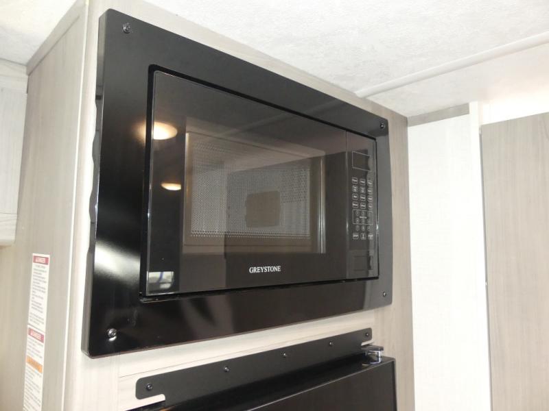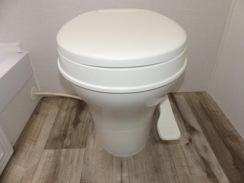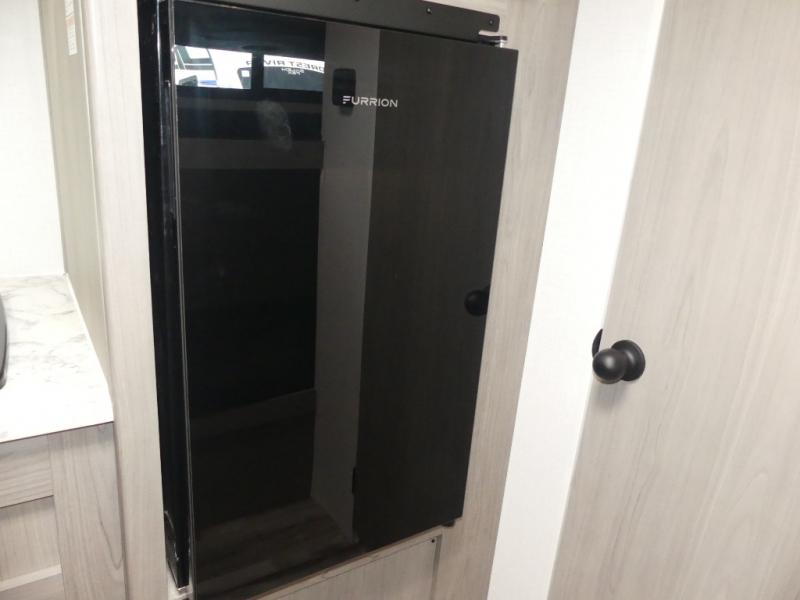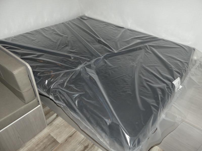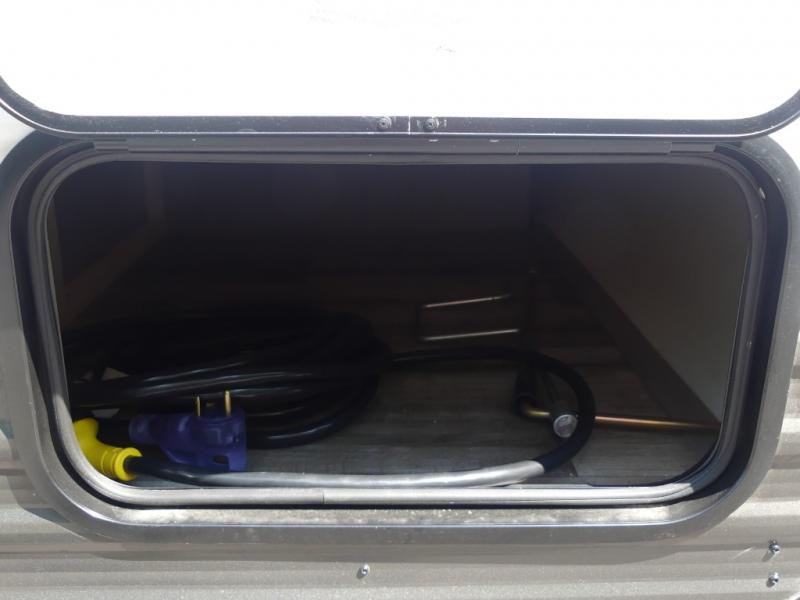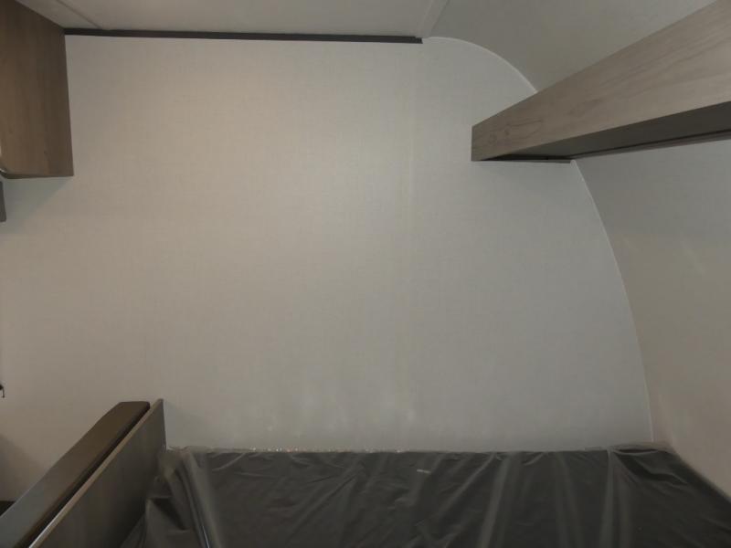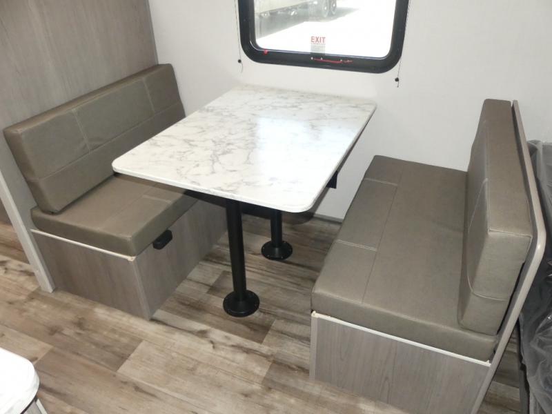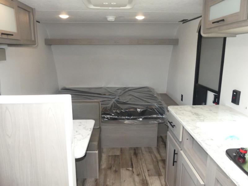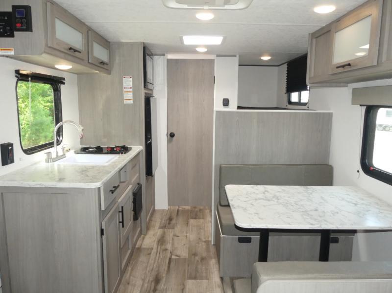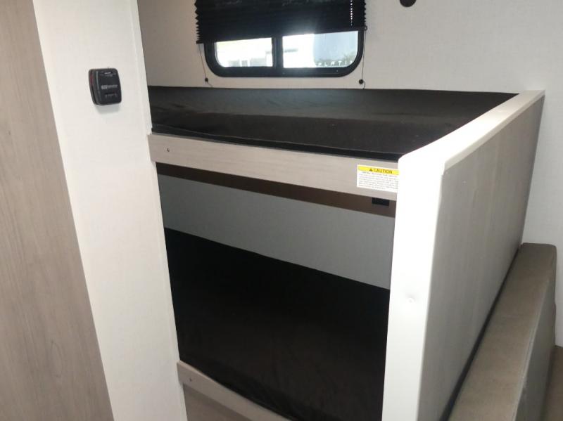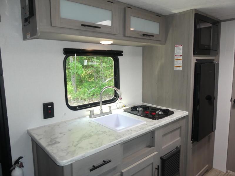 A perfect trailer for your family of three to five featuring a set of bunk beds for the kids, a queen bed up front for you, and the booth dinette that can be converted to sleep one or two more depending on size. For meals, there is a two burner cooktop and sink, plus a 3.3 cu. ft. refrigerator for your perishables. Overhead cabinetry can be found along both sides for your dishes and things. You will all appreciate the convenience of having your own private shower and toilet so that you don't need to use the campground facilities at night. If you enjoy spending time outside, an awning is available to provide even more living space outdoors!