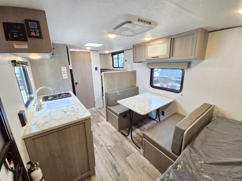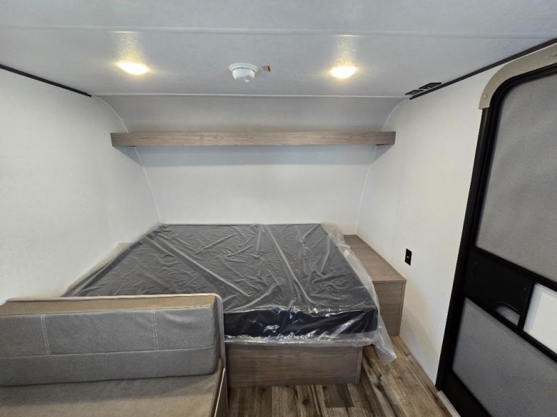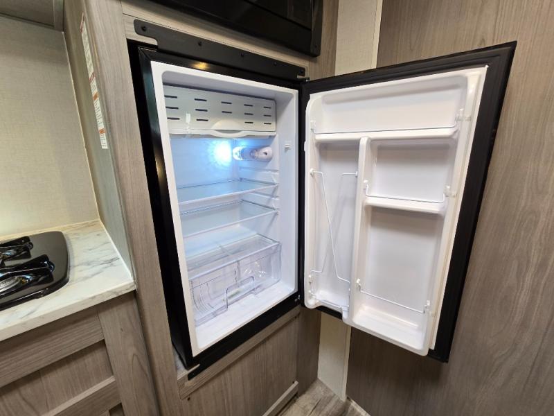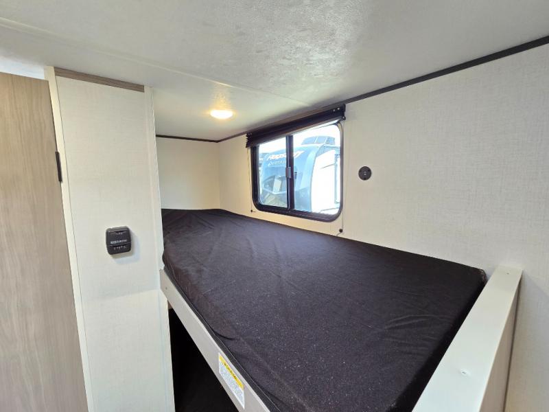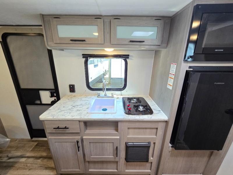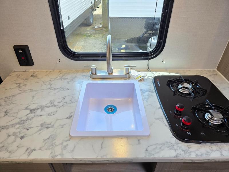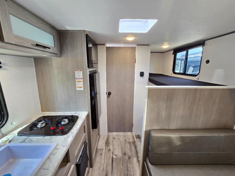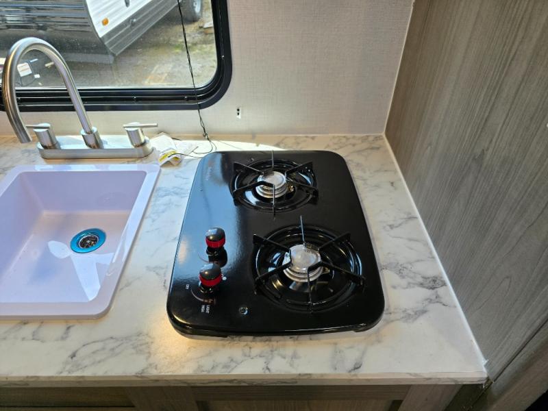 A perfect trailer for your family of three to five featuring a set of bunk beds for the kids, a queen bed up front for you, and the booth dinette that can be converted to sleep one or two more depending on size. For meals, there is a two burner cooktop and sink, plus a 3.3 cu. ft. refrigerator for your perishables. Overhead cabinetry can be found along both sides for your dishes and things. You will all appreciate the convenience of having your own private shower and toilet so that you don't need to use the campground facilities at night. If you enjoy spending time outside, an awning is available to provide even more living space outdoors!