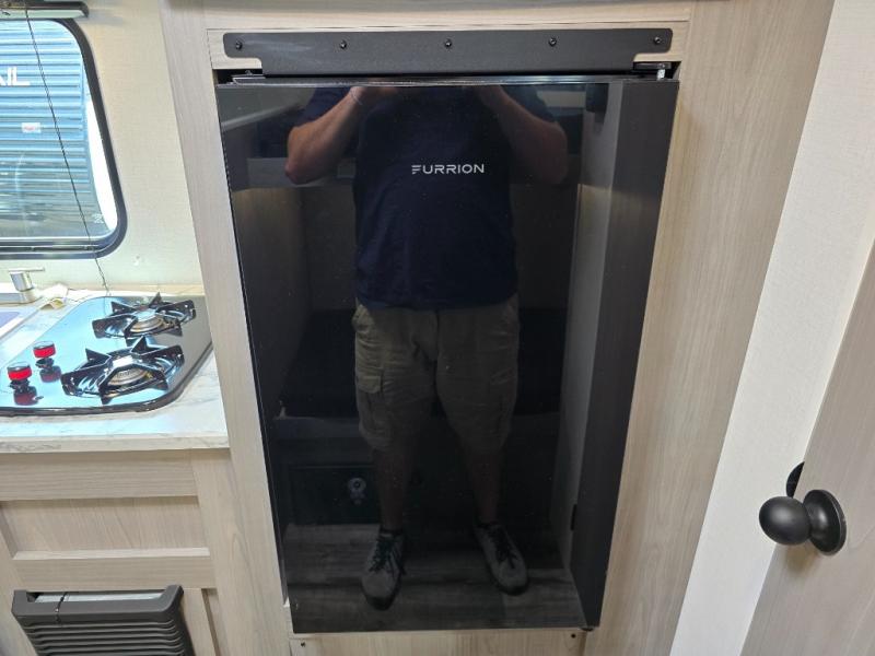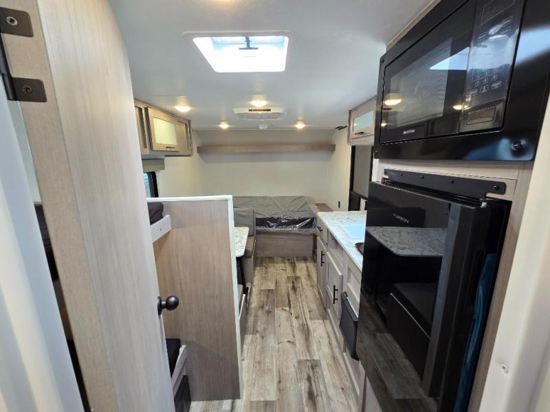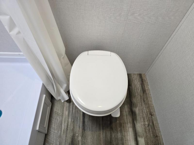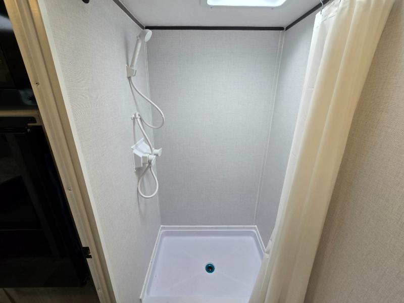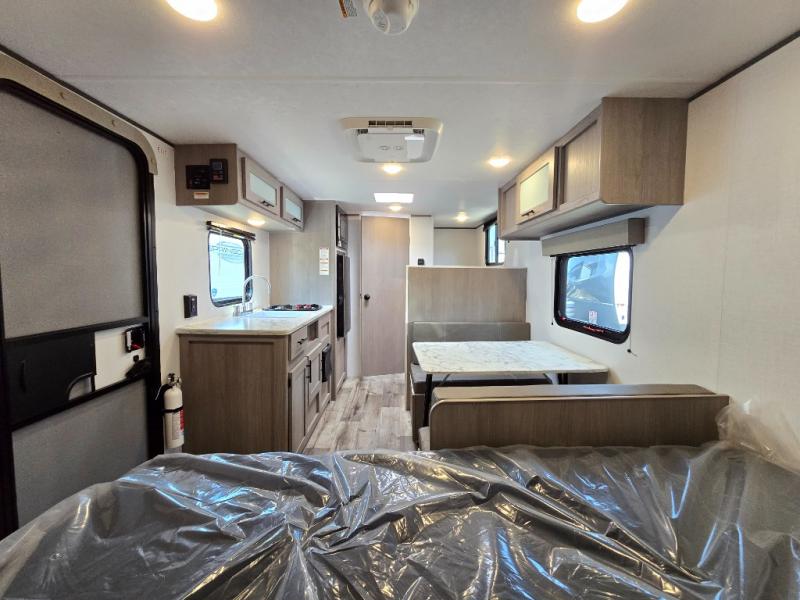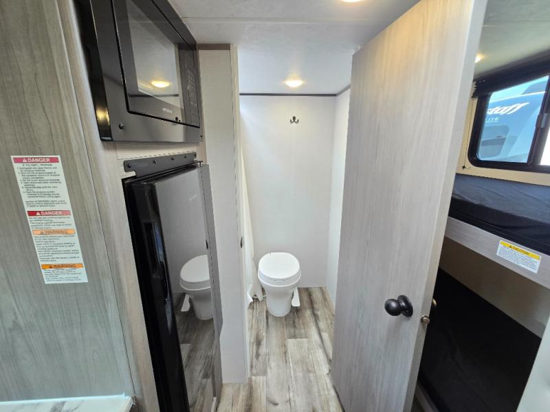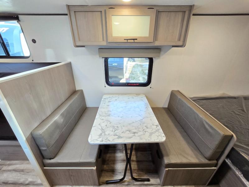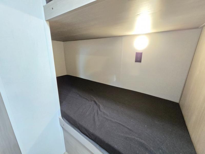 A perfect trailer for your family of three to five featuring a set of bunk beds for the kids, a queen bed up front for you, and the booth dinette that can be converted to sleep one or two more depending on size. For meals, there is a two burner cooktop and sink, plus a 3.3 cu. ft. refrigerator for your perishables. Overhead cabinetry can be found along both sides for your dishes and things. You will all appreciate the convenience of having your own private shower and toilet so that you don't need to use the campground facilities at night. If you enjoy spending time outside, an awning is available to provide even more living space outdoors!