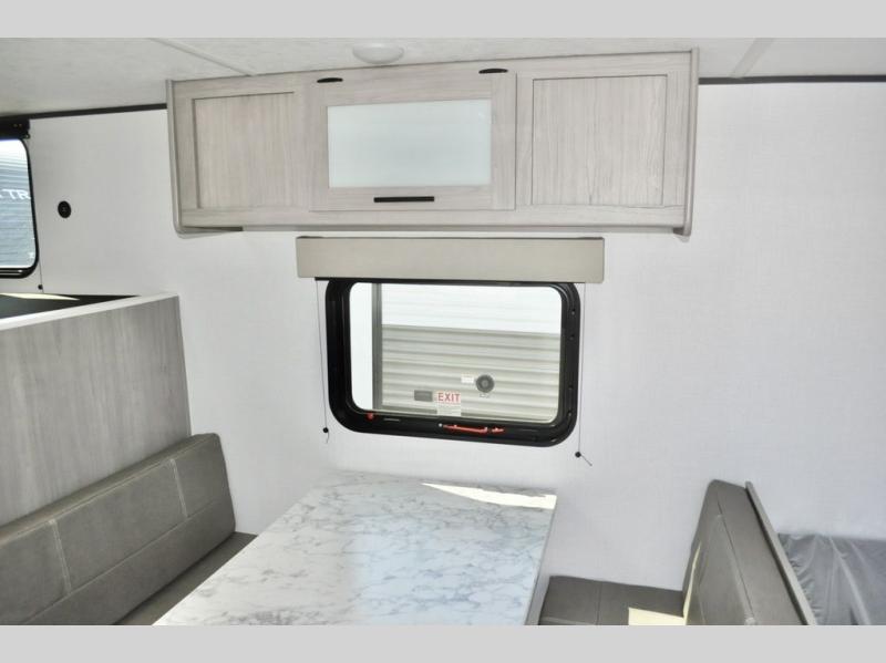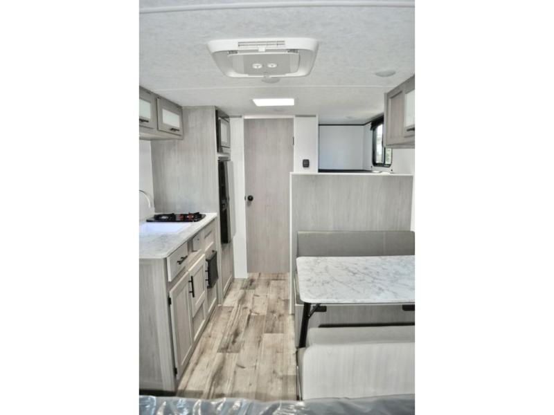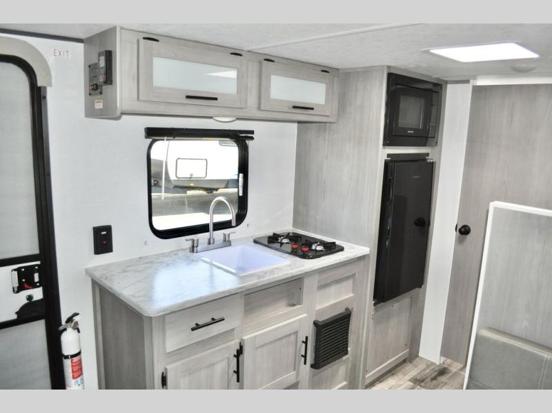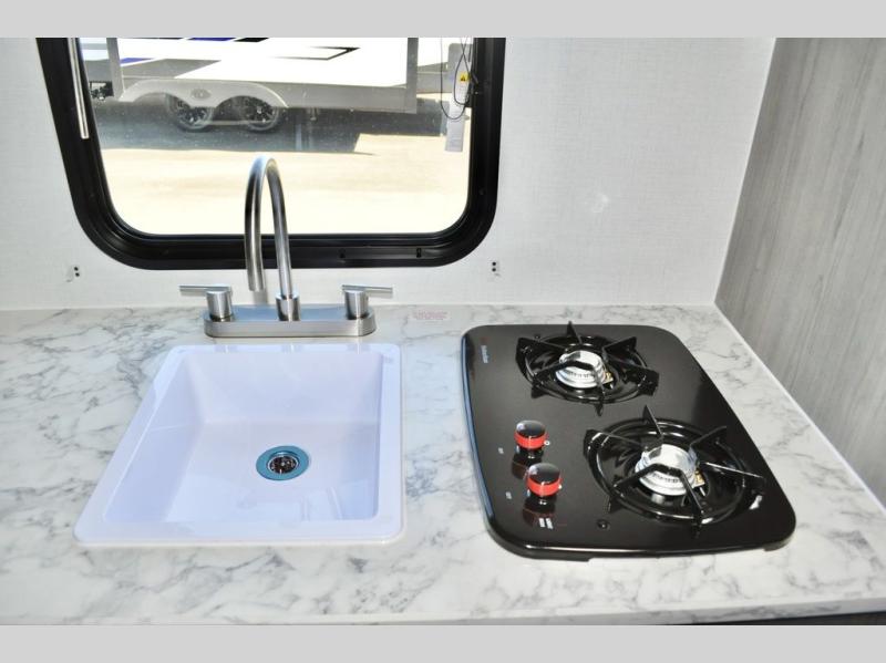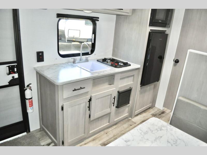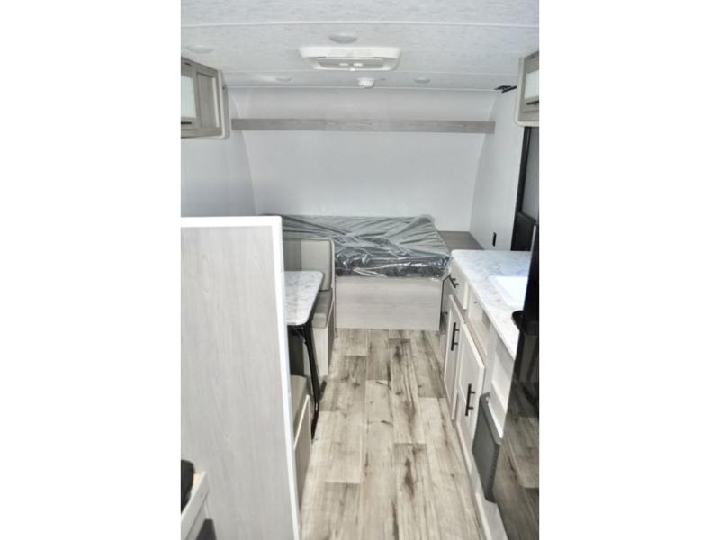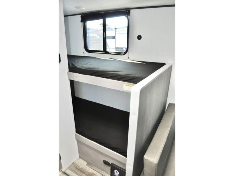 A perfect trailer for your family of three to five featuring a set of bunk beds for the kids, a queen bed up front for you, and the booth dinette that can be converted to sleep one or two more depending on size. For meals, there is a two burner cooktop and sink, plus a 3.3 cu. ft. refrigerator for your perishables. Overhead cabinetry can be found along both sides for your dishes and things. You will all appreciate the convenience of having your own private shower and toilet so that you don't need to use the campground facilities at night. If you enjoy spending time outside, an awning is available to provide even more living space outdoors!