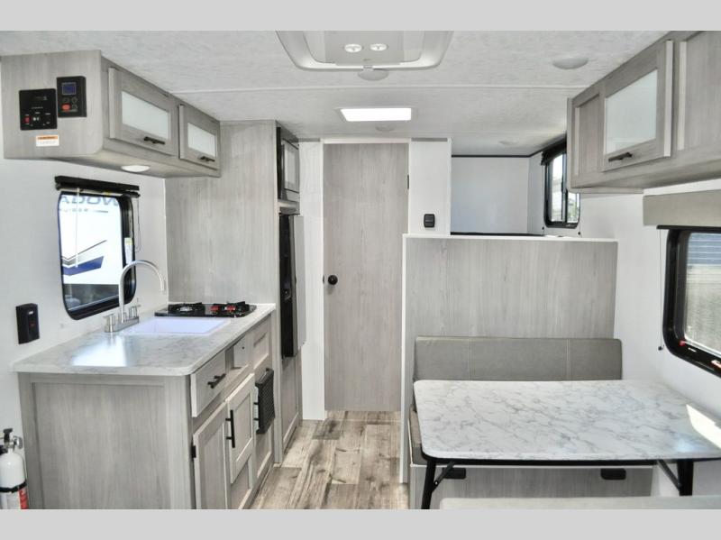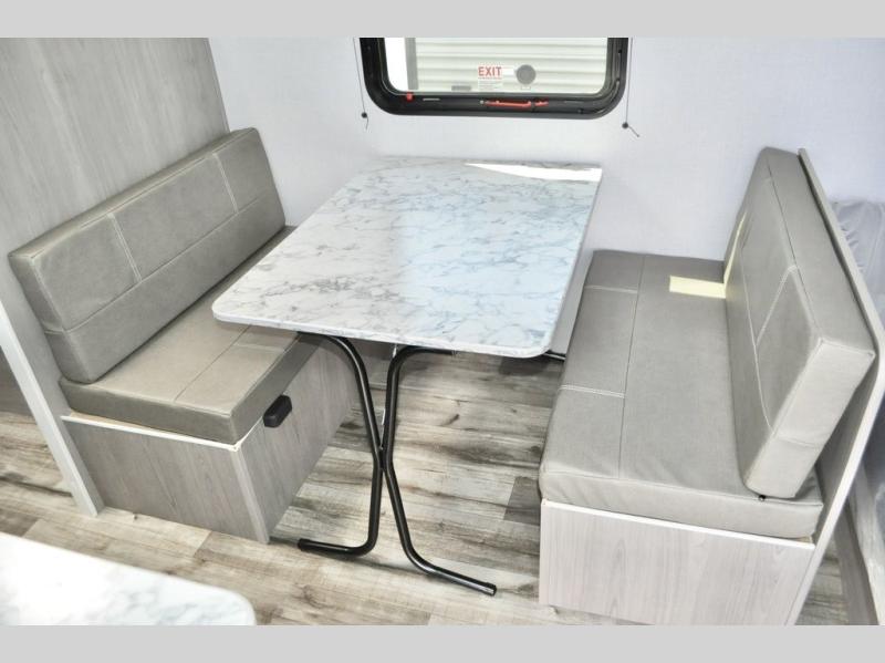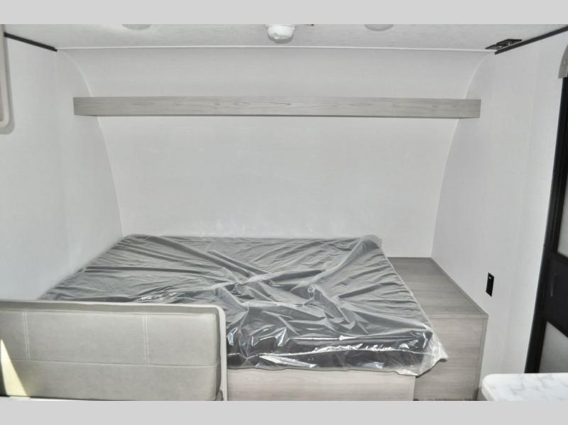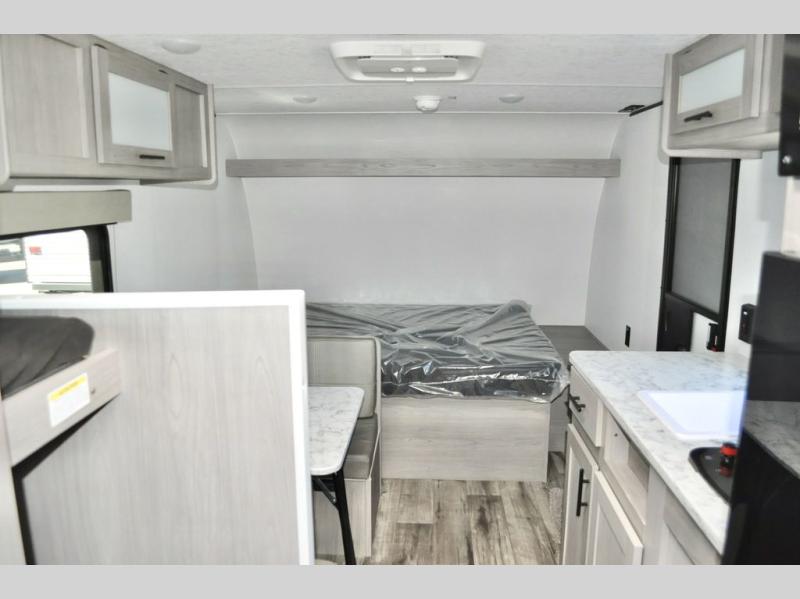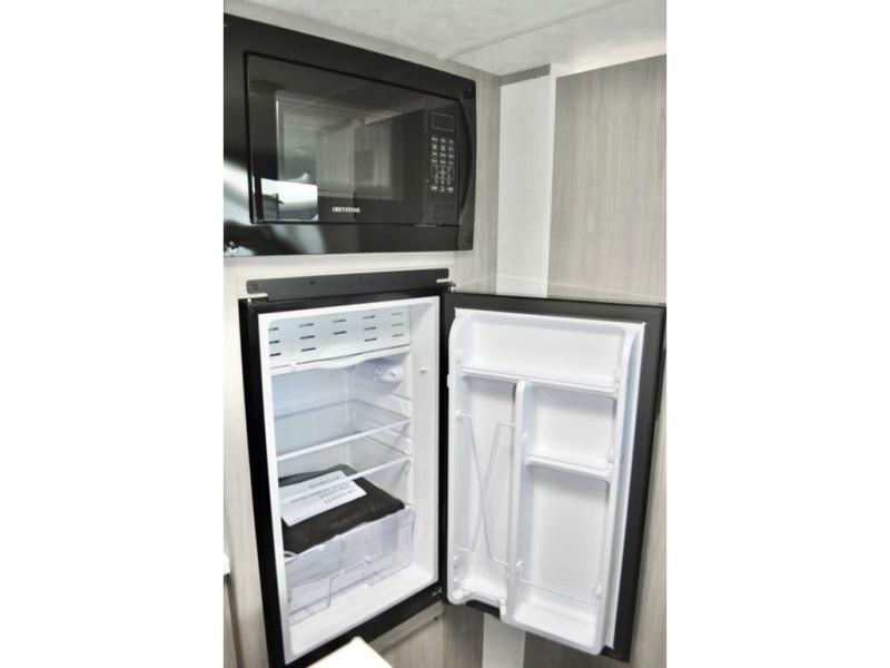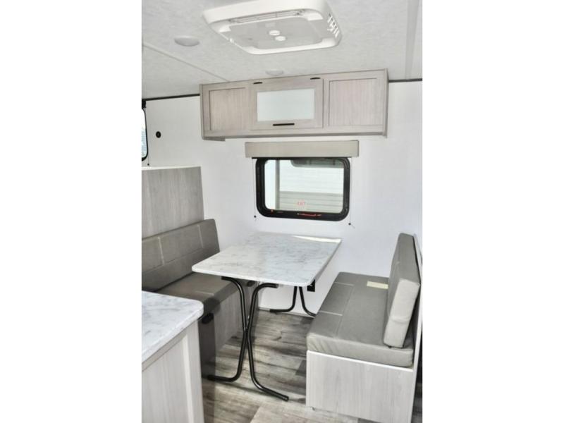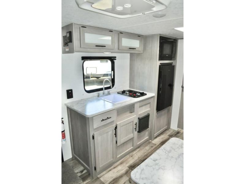 A perfect trailer for your family of three to five featuring a set of bunk beds for the kids, a queen bed up front for you, and the booth dinette that can be converted to sleep one or two more depending on size. For meals, there is a two burner cooktop and sink, plus a 3.3 cu. ft. refrigerator for your perishables. Overhead cabinetry can be found along both sides for your dishes and things. You will all appreciate the convenience of having your own private shower and toilet so that you don't need to use the campground facilities at night. If you enjoy spending time outside, an awning is available to provide even more living space outdoors!