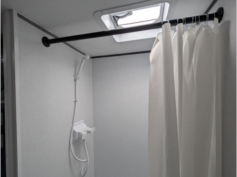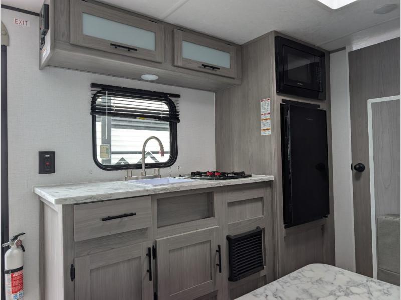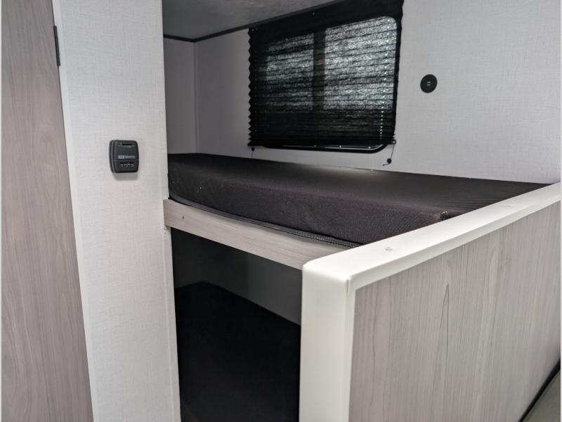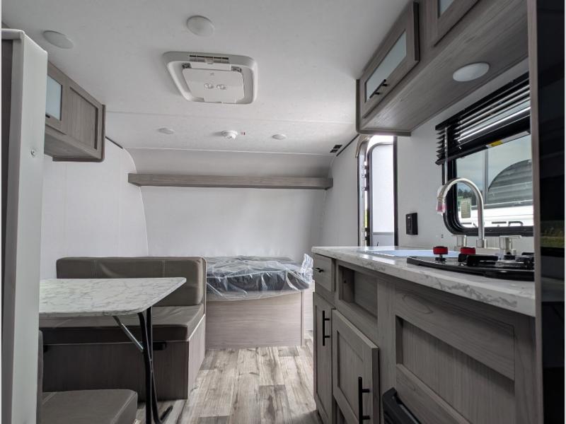 A perfect trailer for your family of three to five featuring a set of bunk beds for the kids, a queen bed up front for you, and the booth dinette that can be converted to sleep one or two more depending on size. For meals, there is a two burner cooktop and sink, plus a 3.3 cu. ft. refrigerator for your perishables. Overhead cabinetry can be found along both sides for your dishes and things. You will all appreciate the convenience of having your own private shower and toilet so that you don't need to use the campground facilities at night. If you enjoy spending time outside, an awning is available to provide even more living space outdoors!