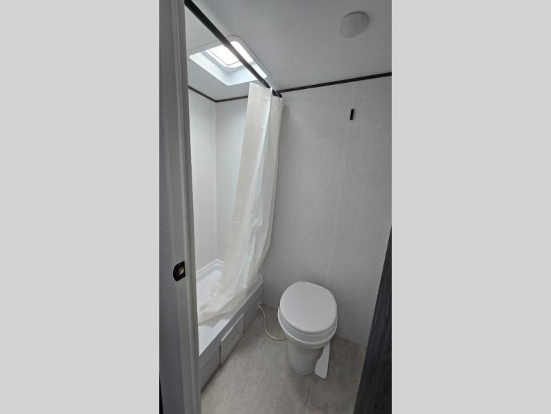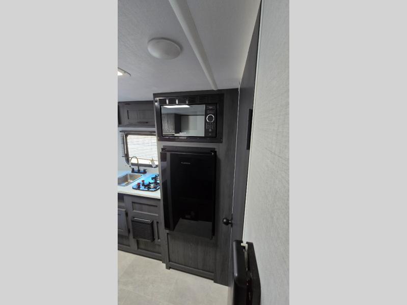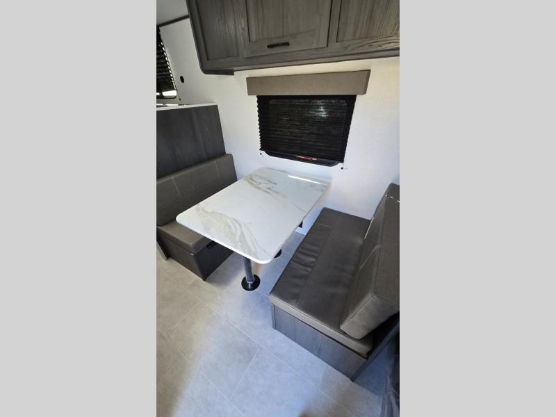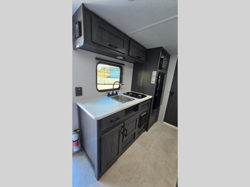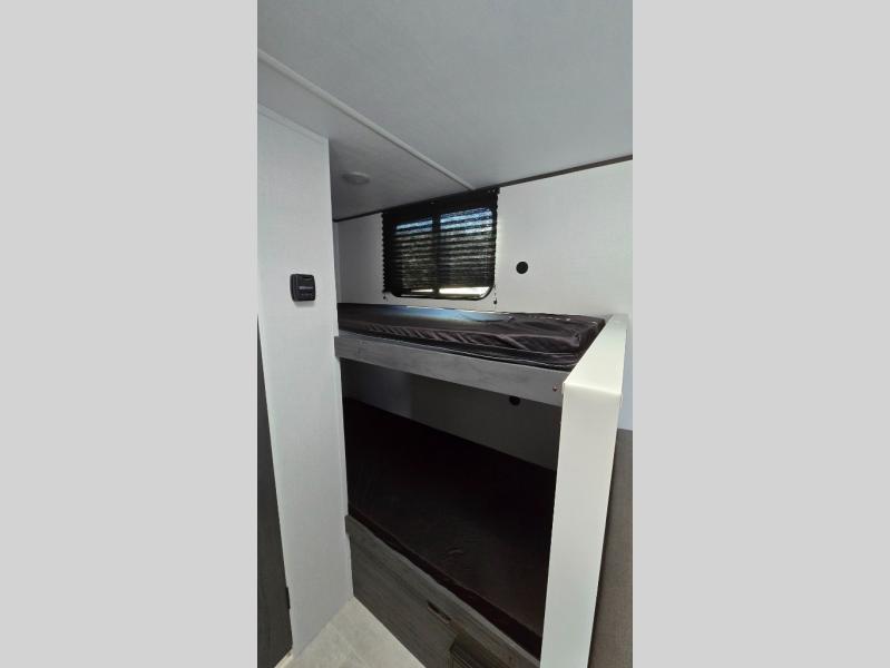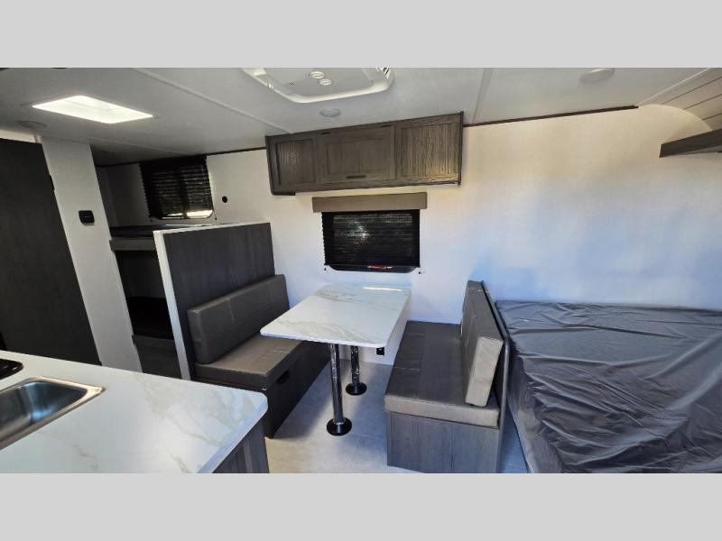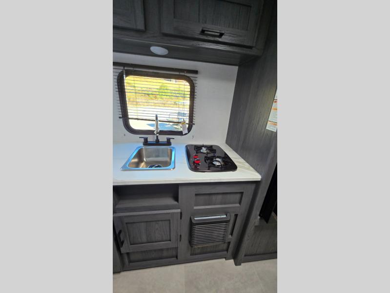A perfect trailer for your family of three to five featuring a set of bunk beds for the kids, a queen bed up front for you, and the booth dinette that can be converted to sleep one or two more depending on size. For meals, there is a two-burner cooktop and sink, plus a 3.3 cu. ft. refrigerator for your perishables. Overhead cabinetry can be found along both sides for your dishes and things. You will all appreciate the convenience of having your own private shower and toilet so that you don't need to use the campground facilities at night. If you enjoy spending time outside, an awning is available to provide even more living space outdoors!
