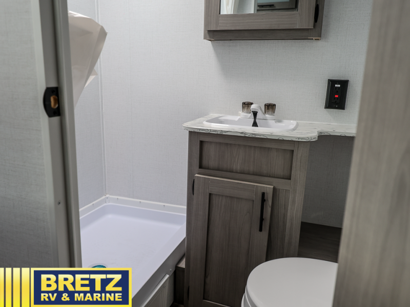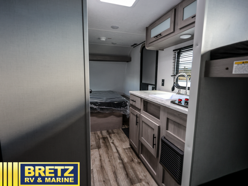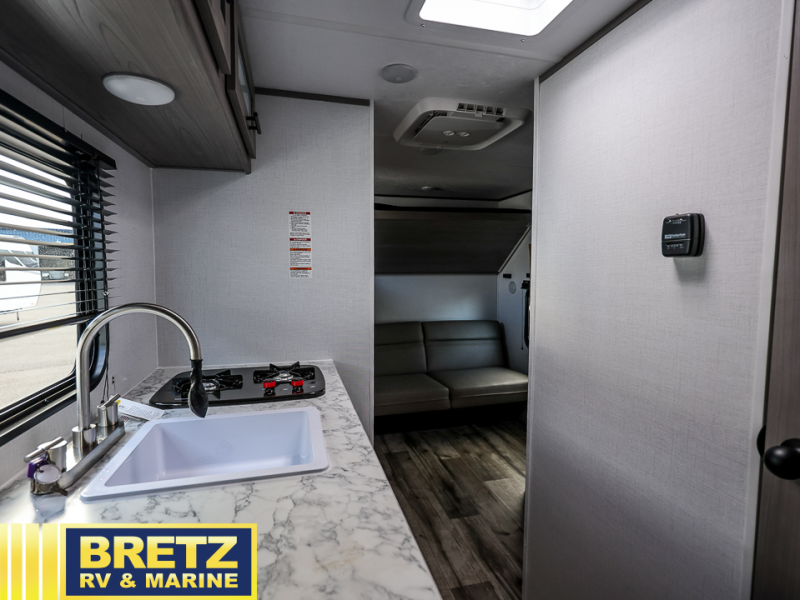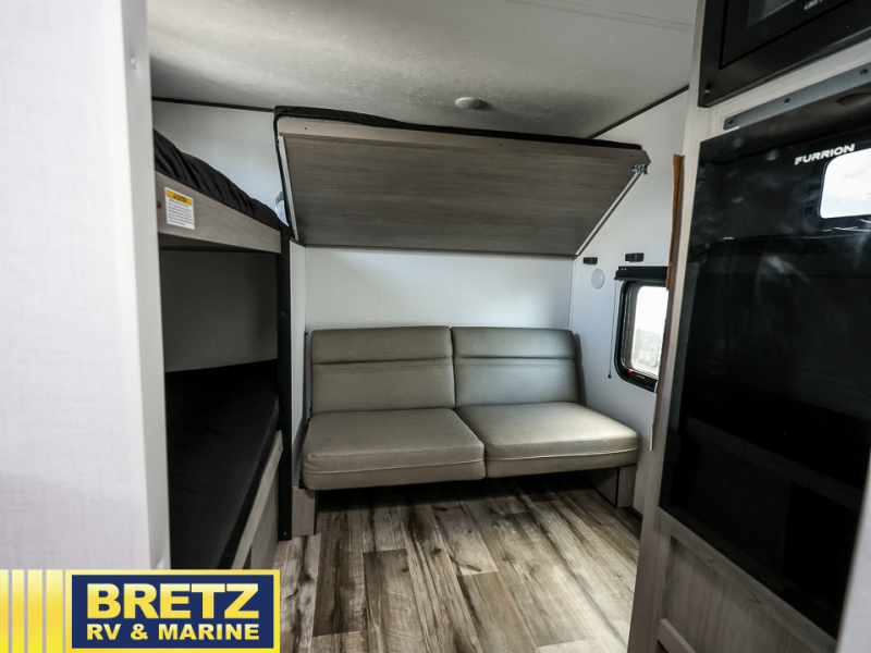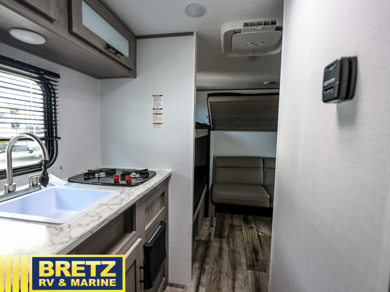 This compact travel trailer will be perfect for trips to your favorite camping spot! There is a front queen bed for a comfy night's rest plus rear bunk beds with a 60" jackknife sofa under one bunk, allowing you to sleep five campers each night! A two burner cooktop and microwave oven will let you whip up breakfast in the morning, and there is a full bath onboard so you don't have to leave your camper in the middle of the night.