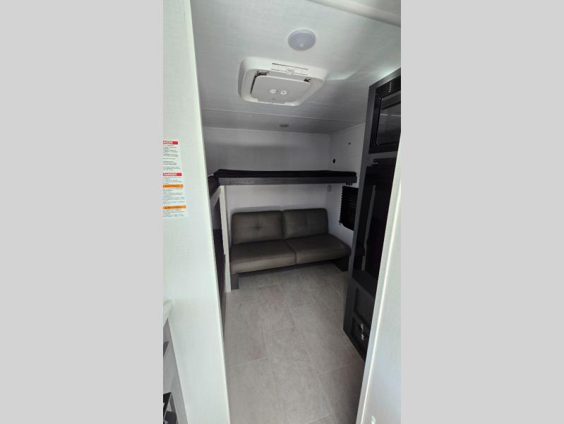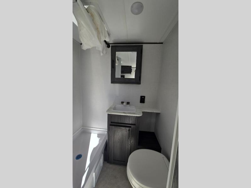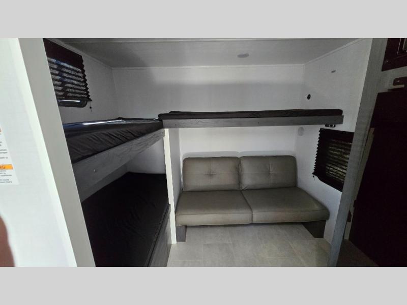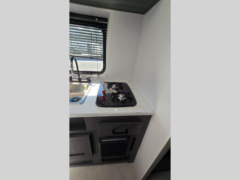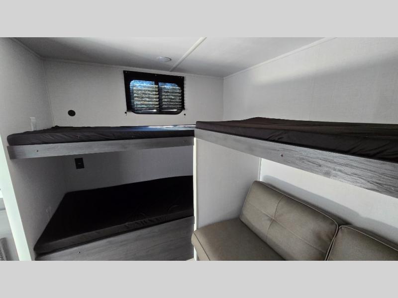This compact travel trailer will be perfect for trips to your favorite camping spot! There is a front RV queen bed for a comfy night's rest plus two bunk beds plus a rear bunk bed with a sofa below, allowing you to sleep five campers each night! A two-burner cooktop and microwave oven will let you whip up breakfast in the morning, and there is a full bath onboard, so you don't have to leave your camper in the middle of the night.