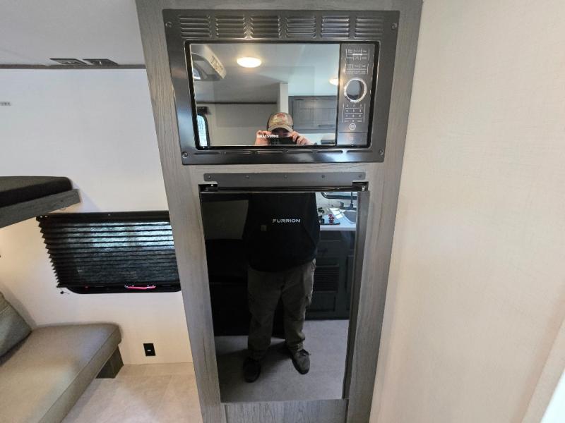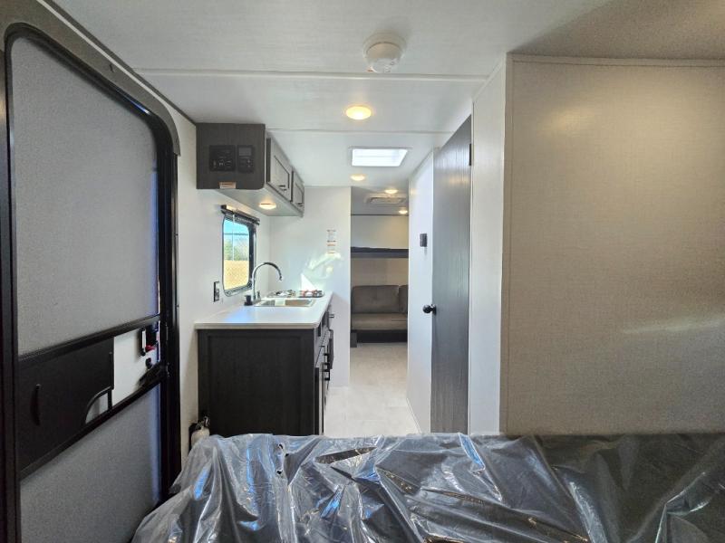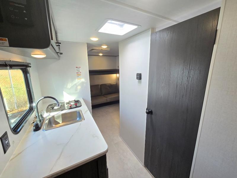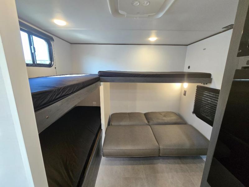 This compact travel trailer will be perfect for trips to your favorite camping spot! There is a front RV queen bed for a comfy night's rest plus two bunk beds plus a rear bunk bed with a sofa below, allowing you to sleep five campers each night! A two-burner cooktop and microwave oven will let you whip up breakfast in the morning, and there is a full bath onboard, so you don't have to leave your camper in the middle of the night.