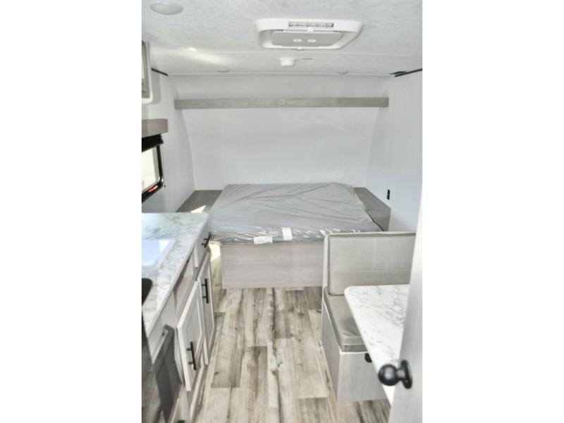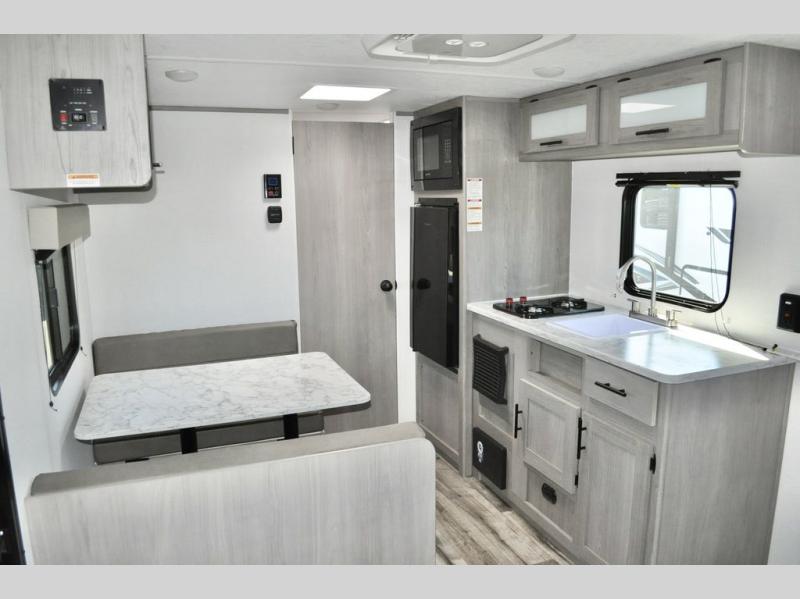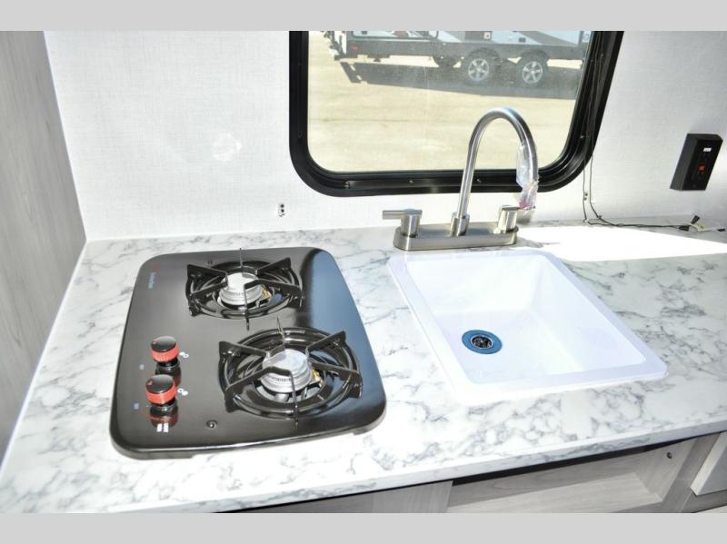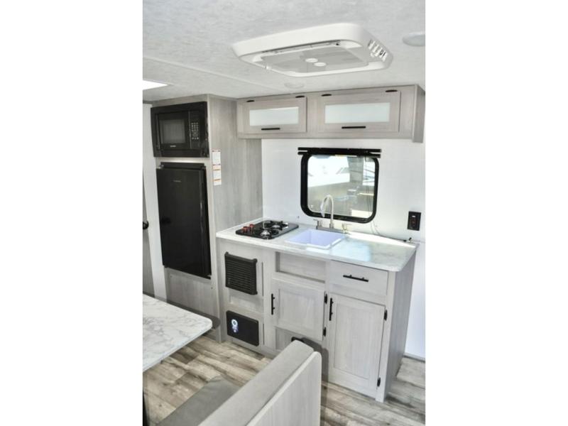 A perfect couples coach that could sleep one or two more, depending on size, using the booth dinette which can be converted at night This unit is cozy and convenient providing you just what you need to enjoy a little adventure away from home. For meals, there is a two burner cooktop and sink, plus a 3.3 cu. ft. refrigerator for your perishables. Overhead cabinetry can be found along both sides for your dishes and things. You will all appreciate the convenience of having your own private shower and toilet so that you don't need to use the campground facilities at night. You will also enjoy spending time outside with an 8' awning to provide even more living space outdoors!