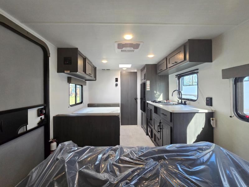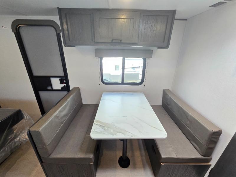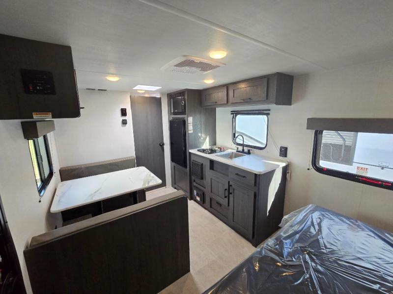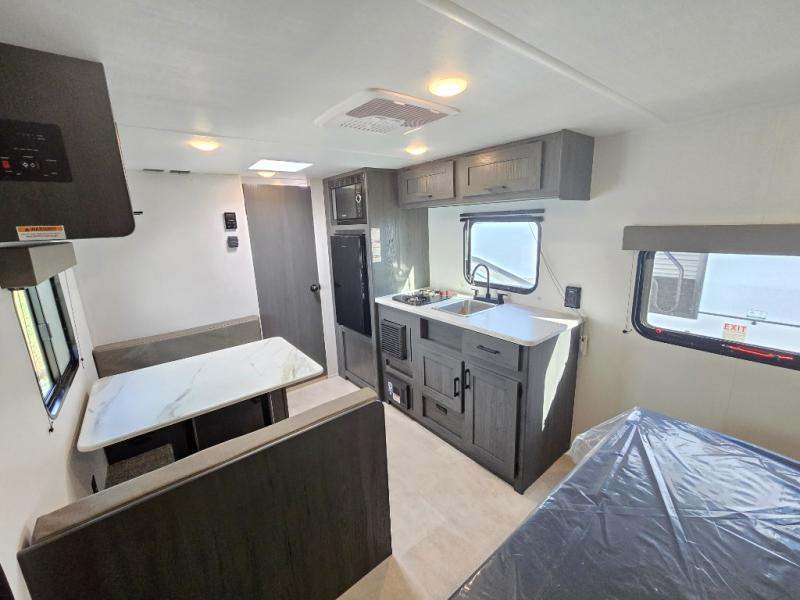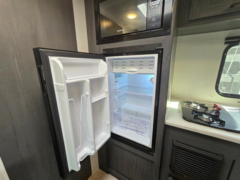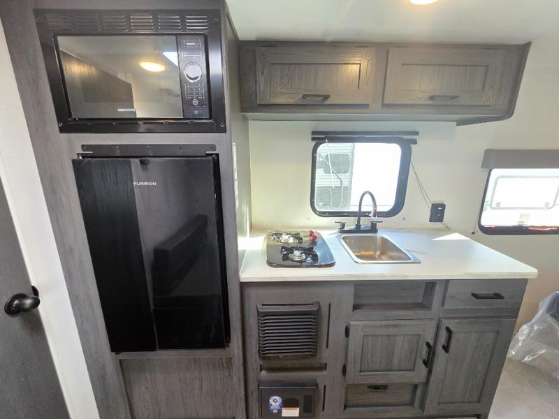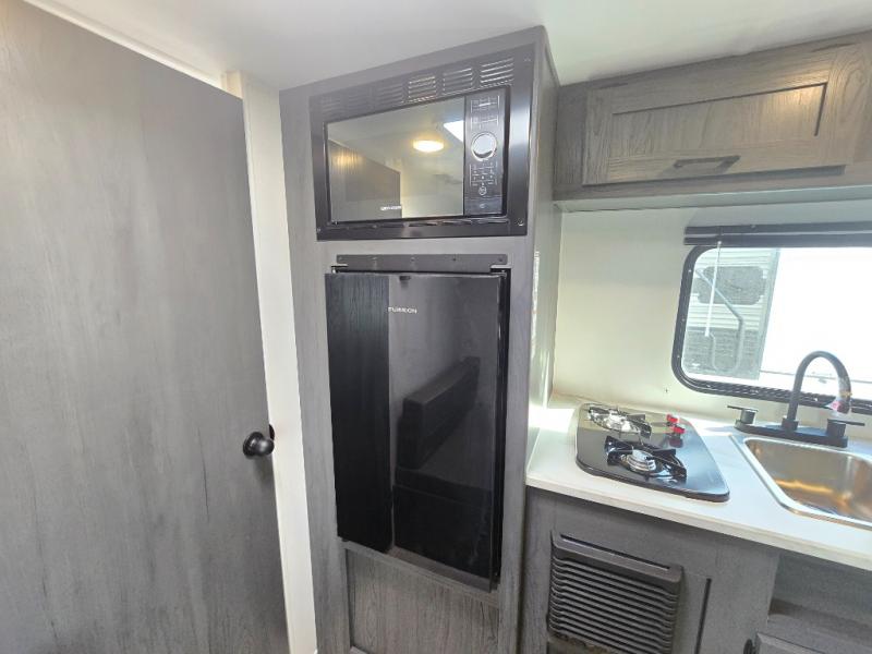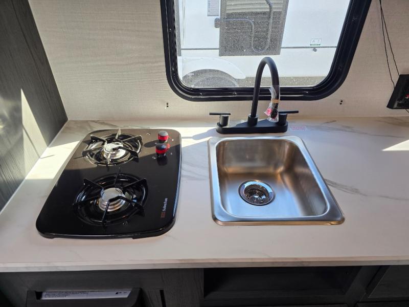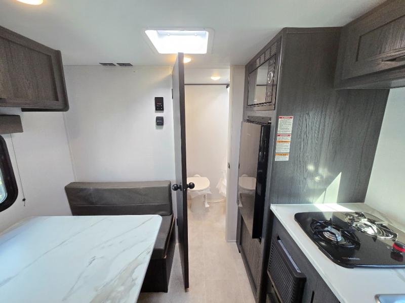 A perfect couples coach that could sleep one or two more, depending on size, using the booth dinette which can be converted at night This unit is cozy and convenient providing you just what you need to enjoy a little adventure away from home. For meals, there is a two-burner cooktop and sink, plus a 3.3 cu. ft. refrigerator for your perishables. Overhead cabinetry can be found along both sides for your dishes and things. You will all appreciate the convenience of having your own rear bath so that you don't need to use the campground facilities at night. You will also enjoy spending time outside with an 8' awning to provide even more living space outdoors!