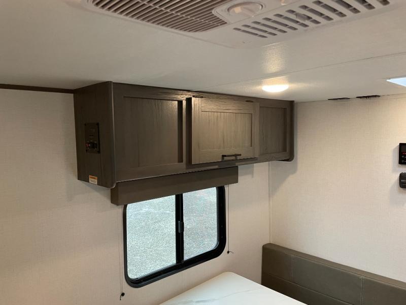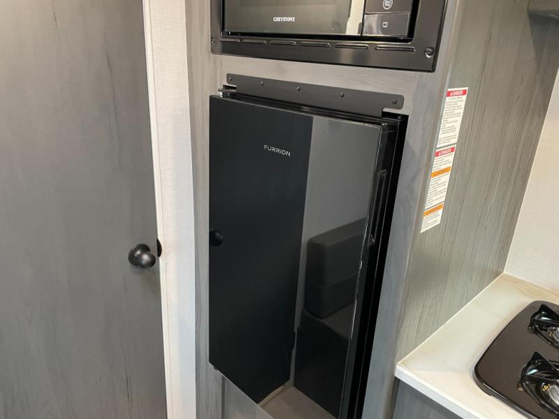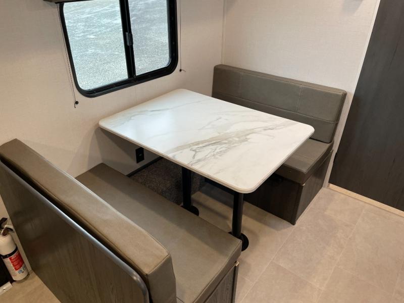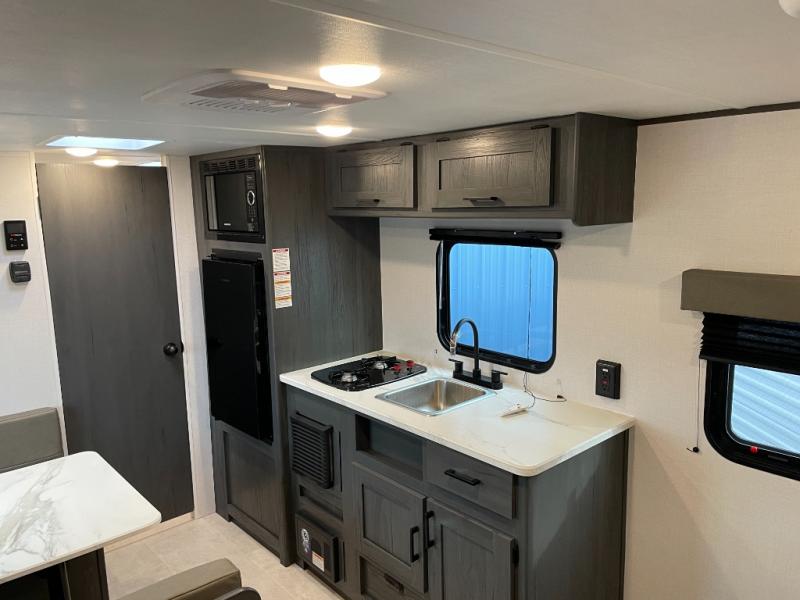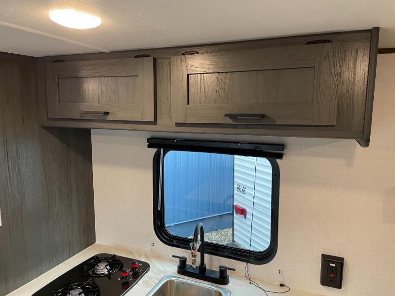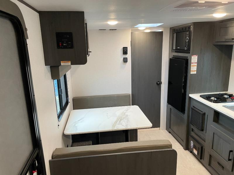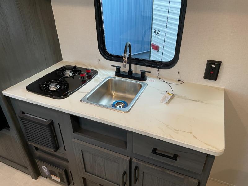 A perfect couples coach that could sleep one or two more, depending on size, using the booth dinette which can be converted at night This unit is cozy and convenient providing you just what you need to enjoy a little adventure away from home. For meals, there is a two-burner cooktop and sink, plus a 3.3 cu. ft. refrigerator for your perishables. Overhead cabinetry can be found along both sides for your dishes and things. You will all appreciate the convenience of having your own rear bath so that you don't need to use the campground facilities at night. You will also enjoy spending time outside with an 8' awning to provide even more living space outdoors!