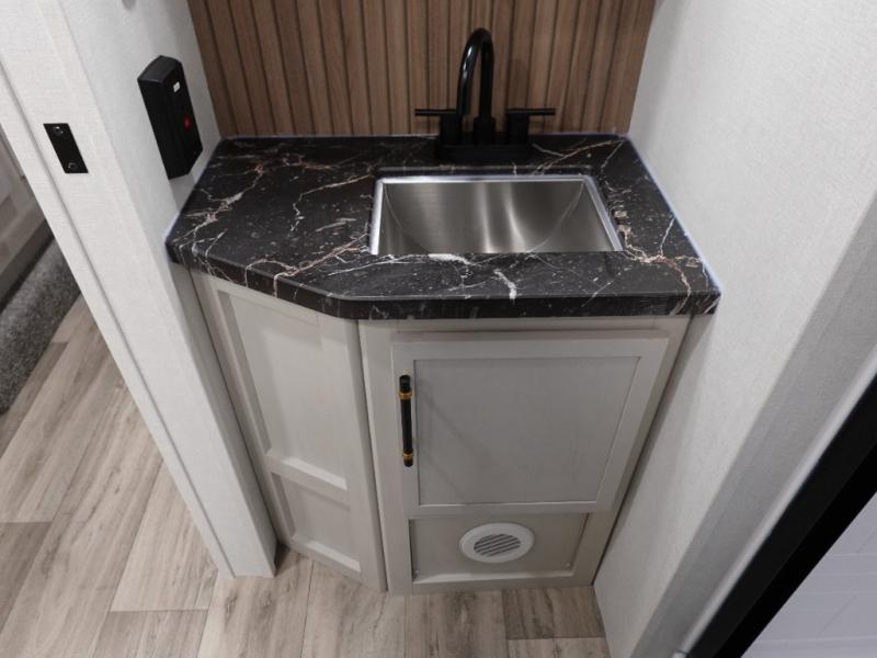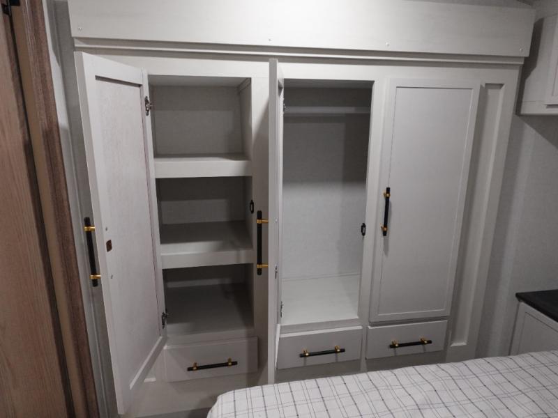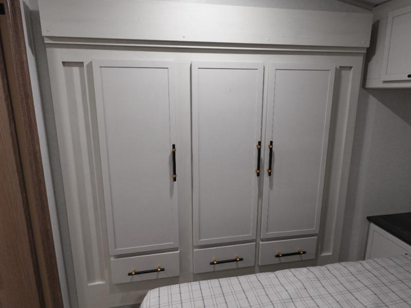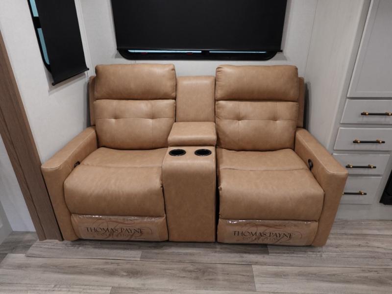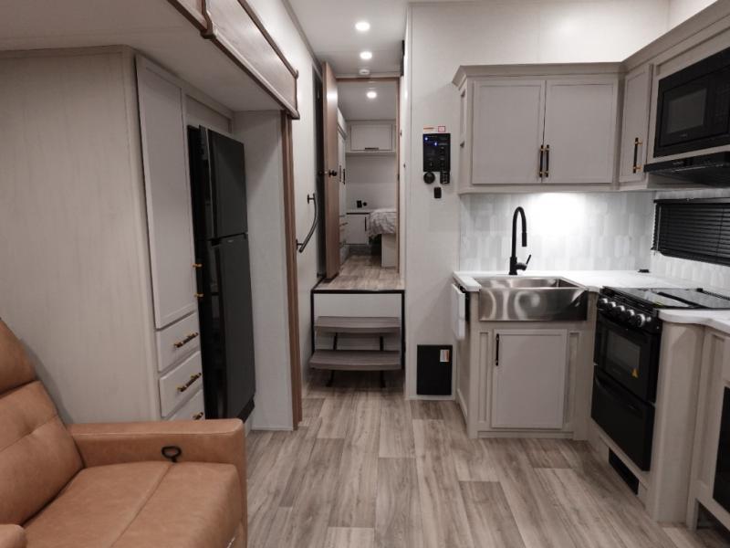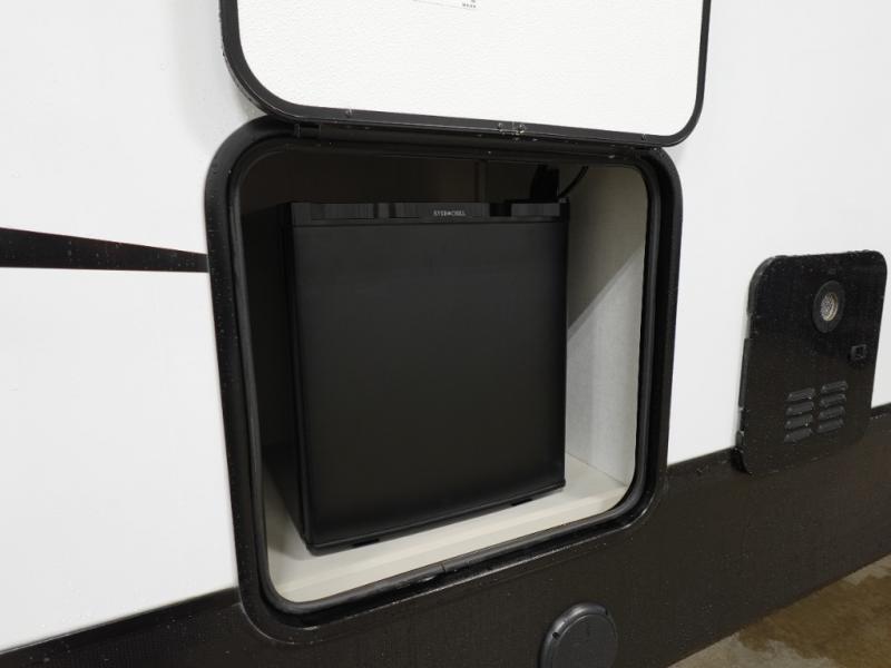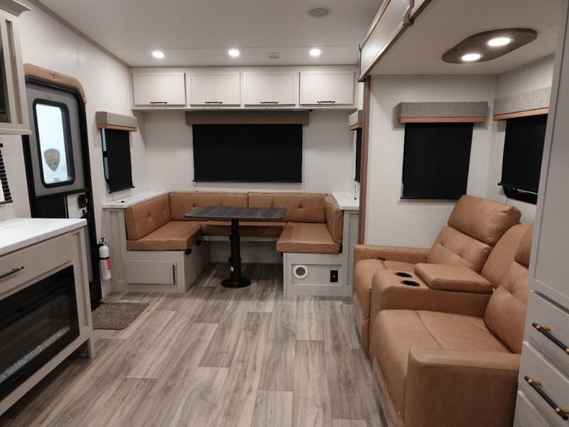 You will feel right at home in this fifth wheel! Enjoy your meals at the rear U-shaped dinette which can be prepared easier with the countertop extension or grill some burgers at the outdoor griddle. The theater seating offers a comfortable place to relax at night and is conveniently next to the pantry and 10 cu. ft. refrigerator so you don't have to go far for a refreshing beverage or snack. After a fun day at the beach head to the full bathroom to rinse the sand out of your hair in the walk-in shower with skylight for added natural lighting. The front private bedroom has a queen bed with closets on either side for your clothes, and there is even a closet with washer and dryer prep!