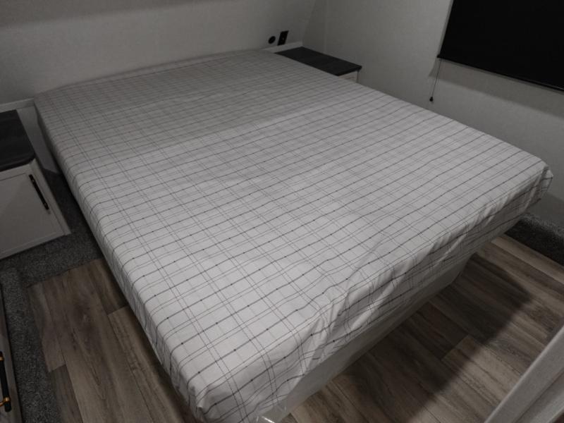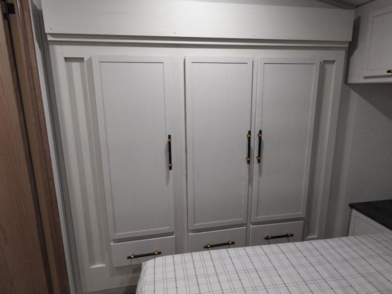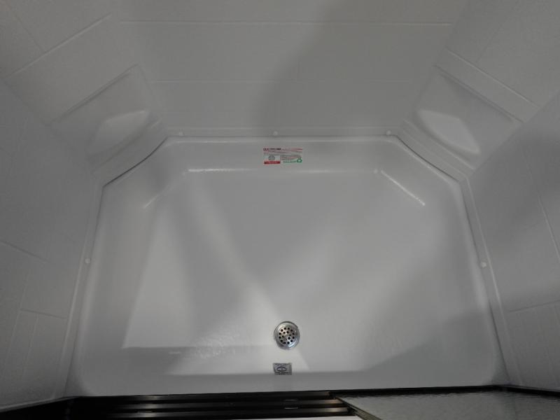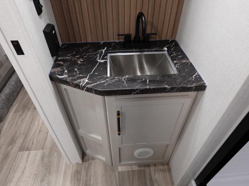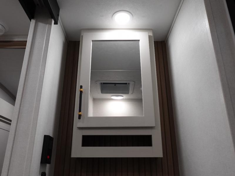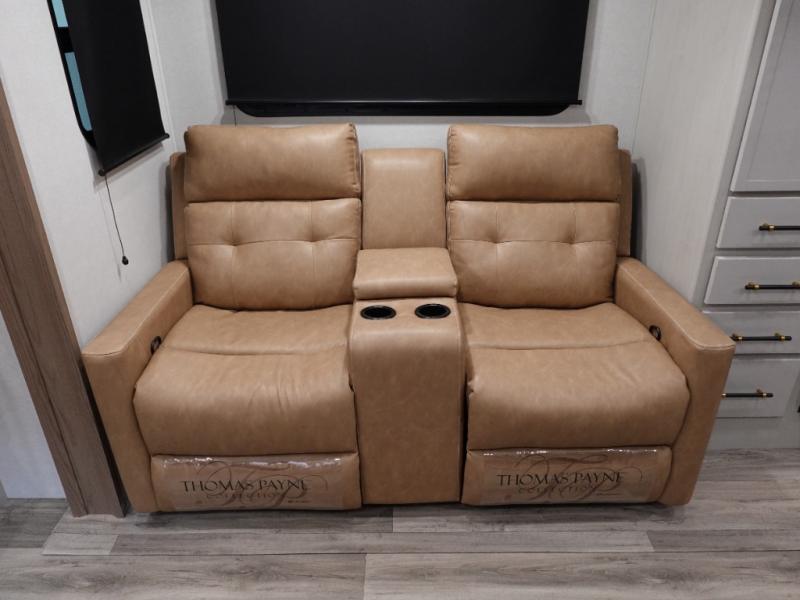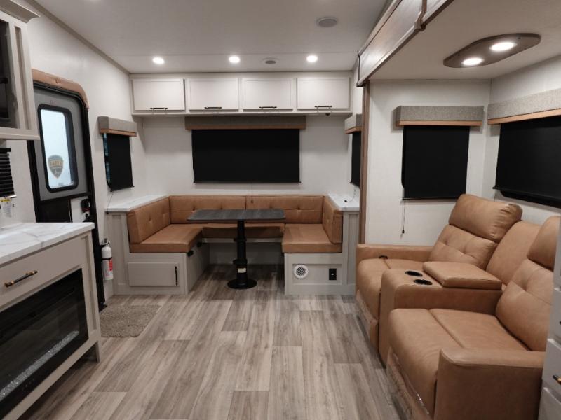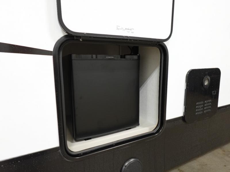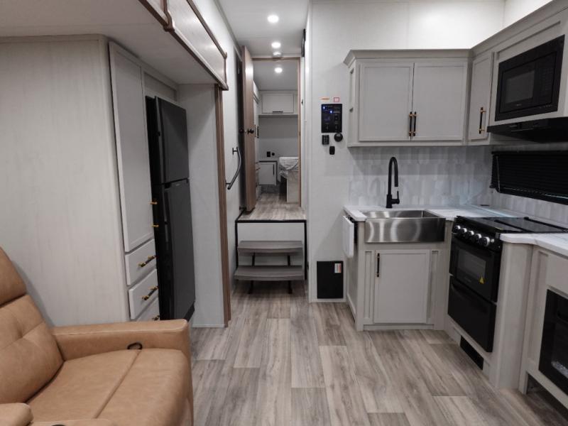 You will feel right at home in this fifth wheel! Enjoy your meals at the rear U-shaped dinette which can be prepared easier with the countertop extension or grill some burgers at the outdoor griddle. The theater seating offers a comfortable place to relax at night and is conveniently next to the pantry and 10 cu. ft. refrigerator so you don't have to go far for a refreshing beverage or snack. After a fun day at the beach head to the full bathroom to rinse the sand out of your hair in the walk-in shower with skylight for added natural lighting. The front private bedroom has a queen bed with closets on either side for your clothes, and there is even a closet with washer and dryer prep!