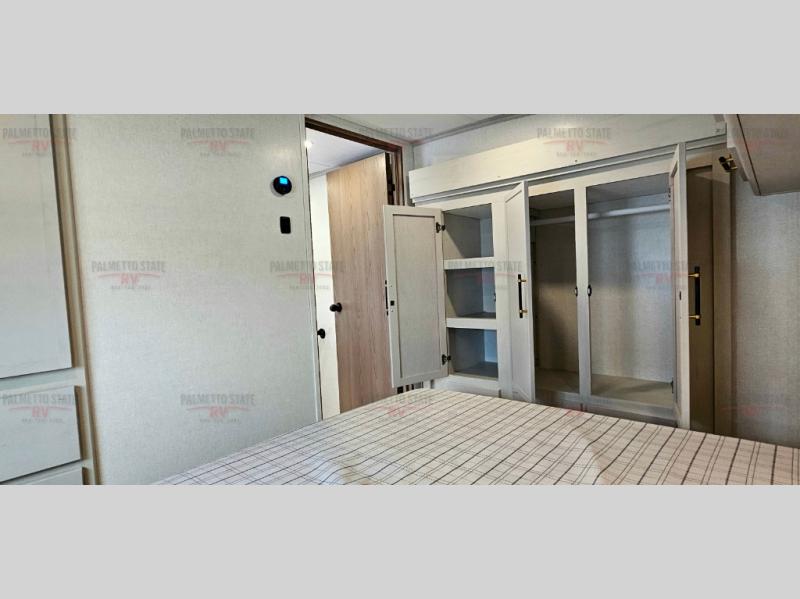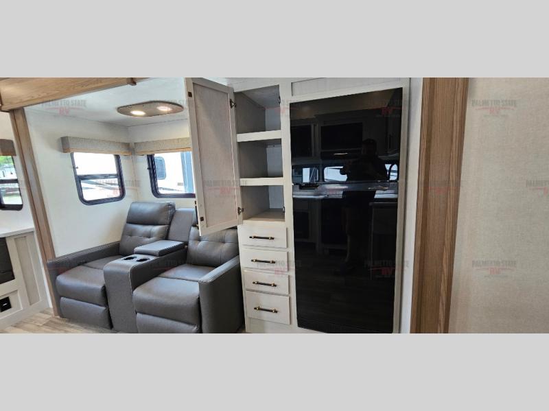 You will feel right at home in this fifth wheel! Enjoy your meals at the rear U-shaped dinette which can be prepared easier with the countertop extension or grill some burgers at the outdoor griddle. The theater seating offers a comfortable place to relax at night and is conveniently next to the pantry and 10 cu. ft. refrigerator so you don't have to go far for a refreshing beverage or snack. After a fun day at the beach head to the full bathroom to rinse the sand out of your hair in the walk-in shower with skylight for added natural lighting. The front private bedroom has a queen bed with closets on either side for your clothes, and there is even a closet with washer and dryer prep!